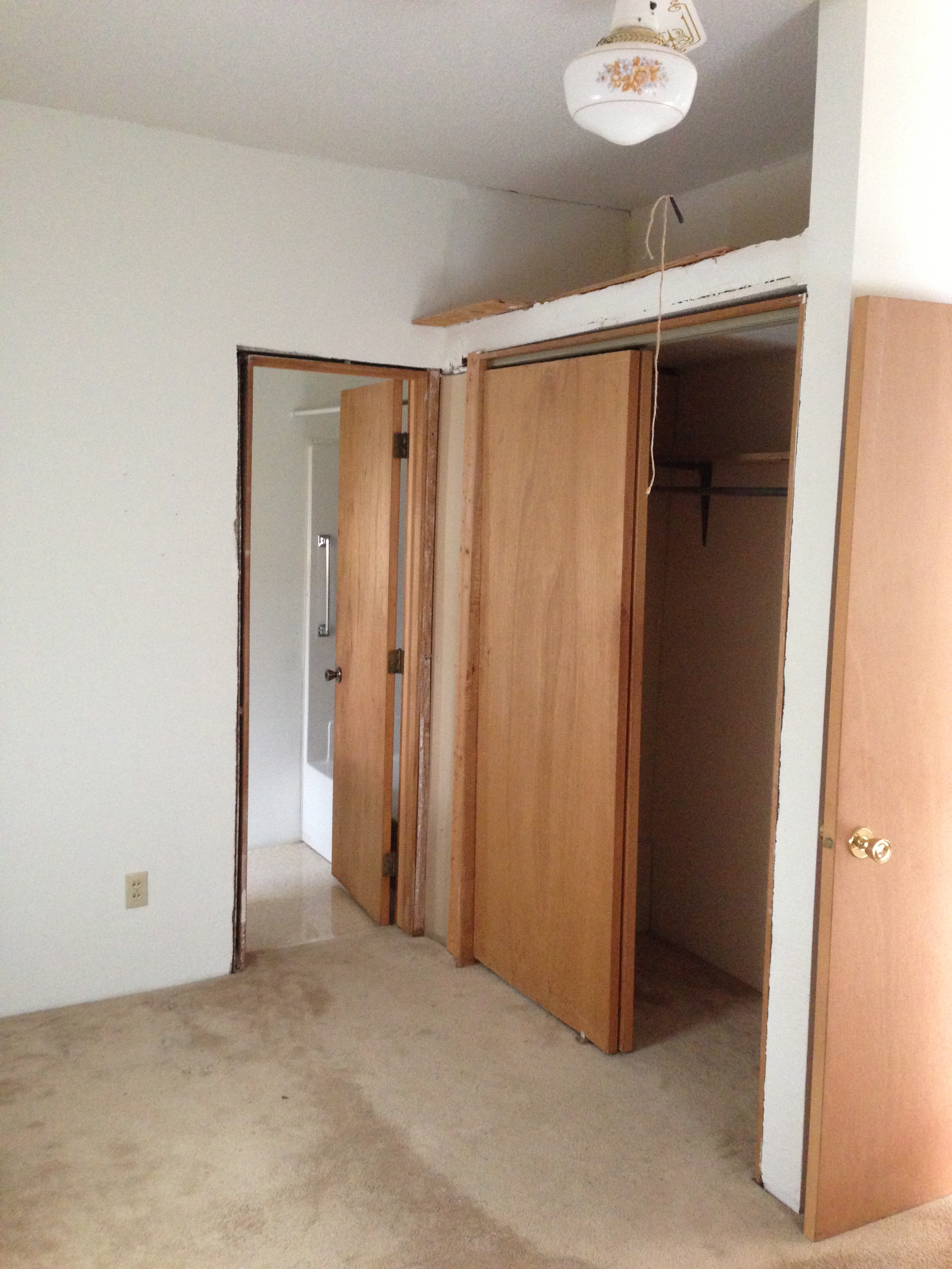 The tiny bathroom isn’t even wide enough to accommodate the shower insert…it extends into the closet by about 15 inches.
