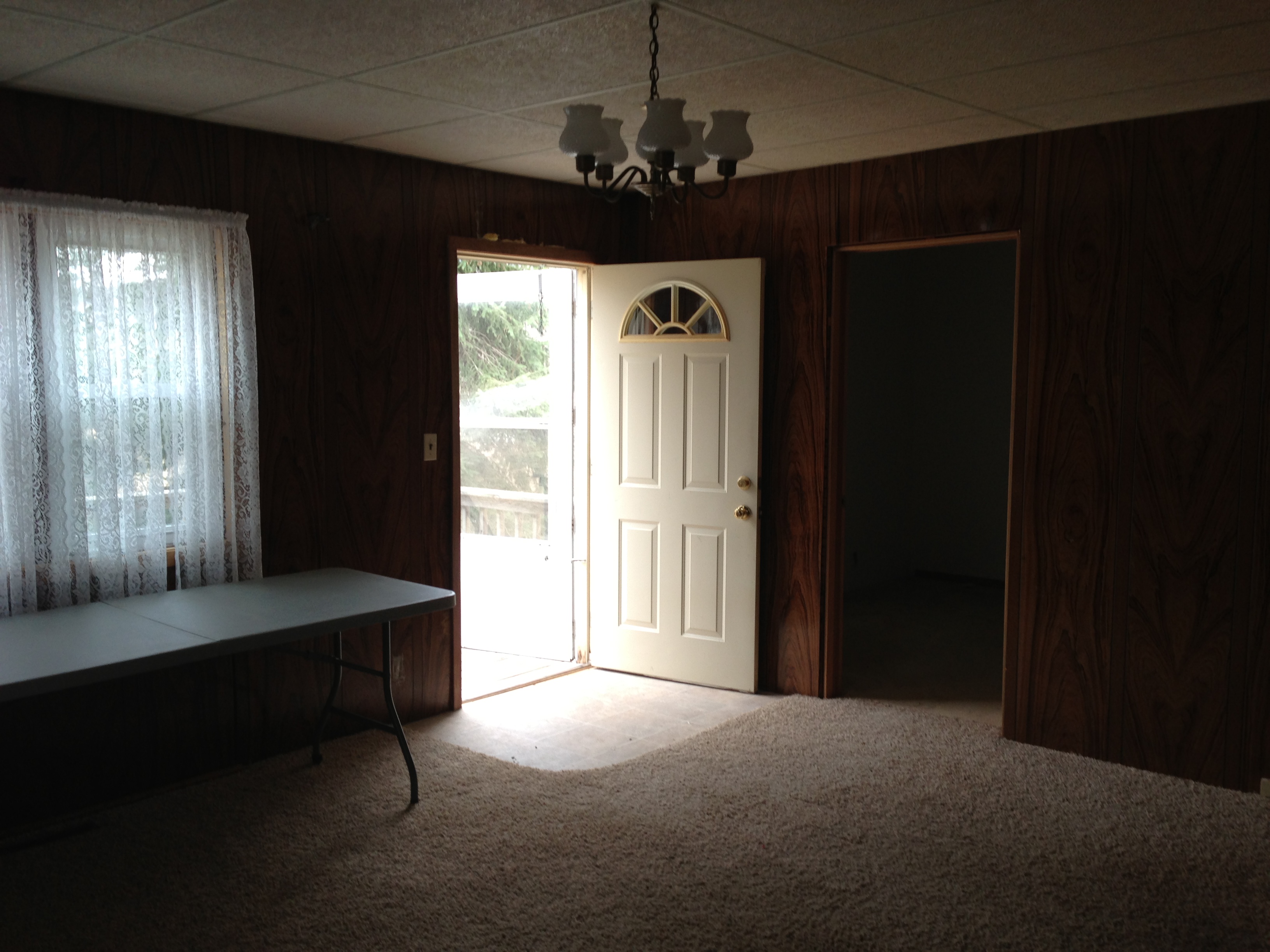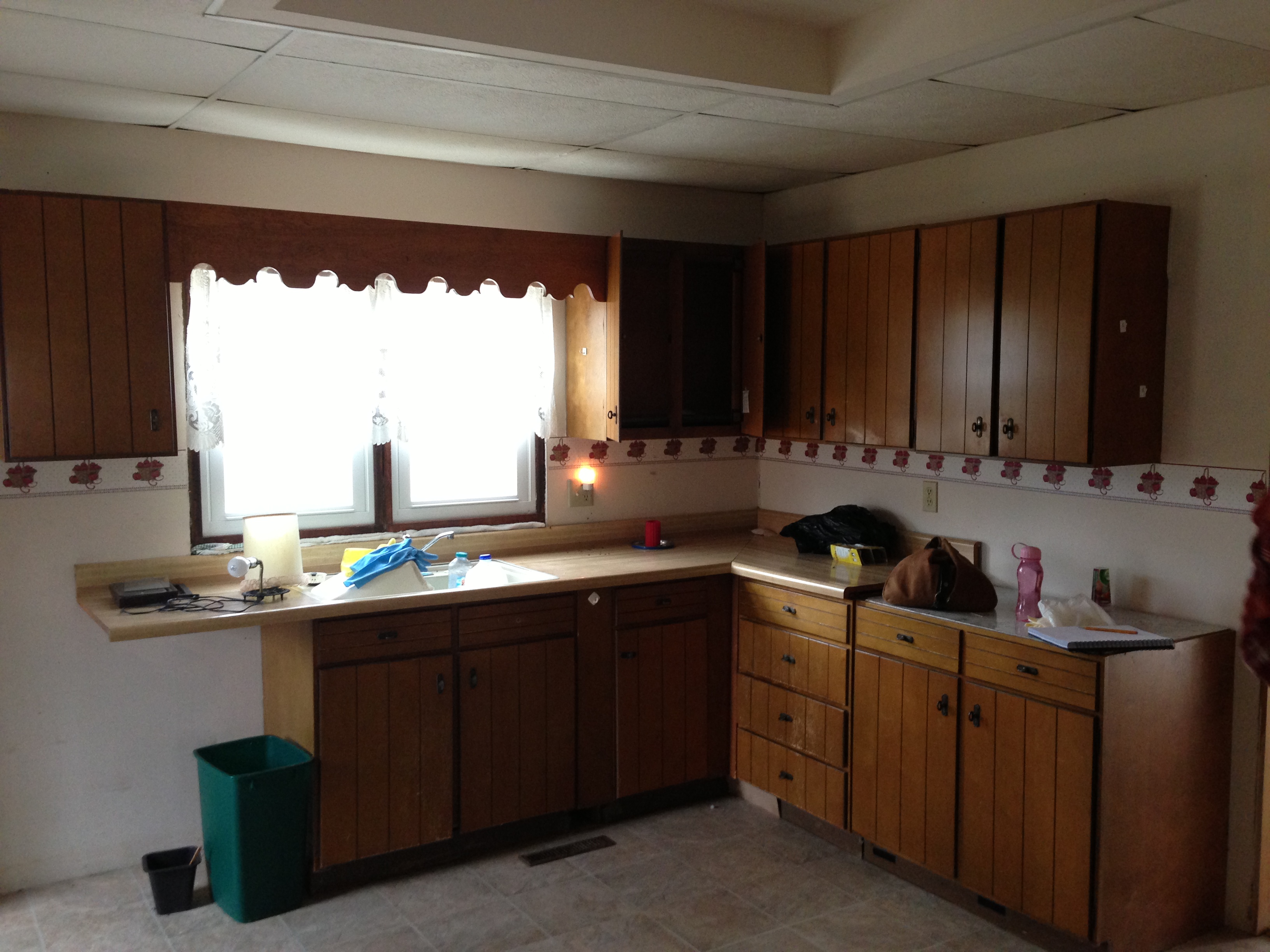 Another kitchen wall. Here, I am standing in the living room looking toward the back of the house. The laundry is on the left and the back door of the house is on the right. The stairs going up are just beyond this wall.