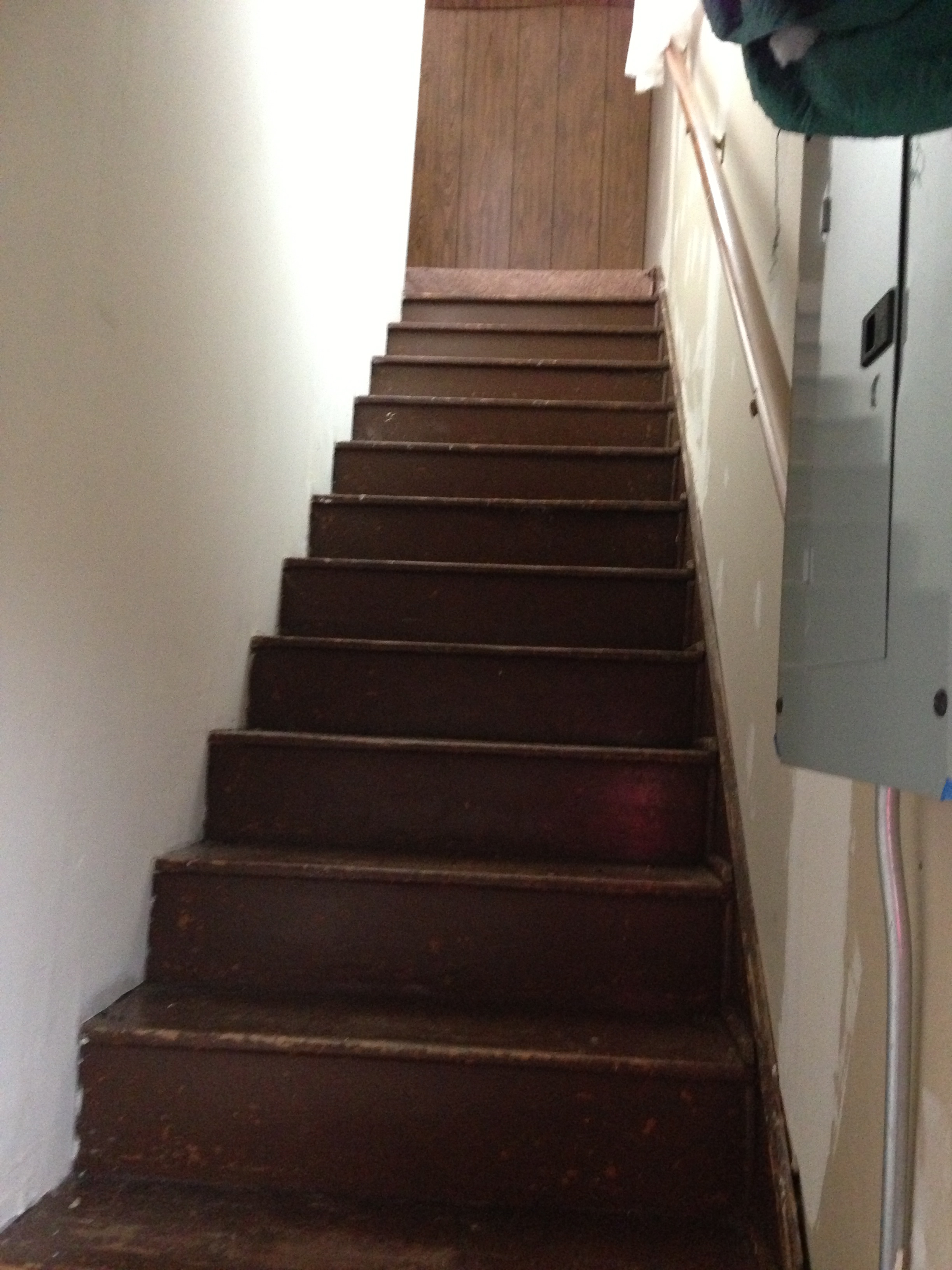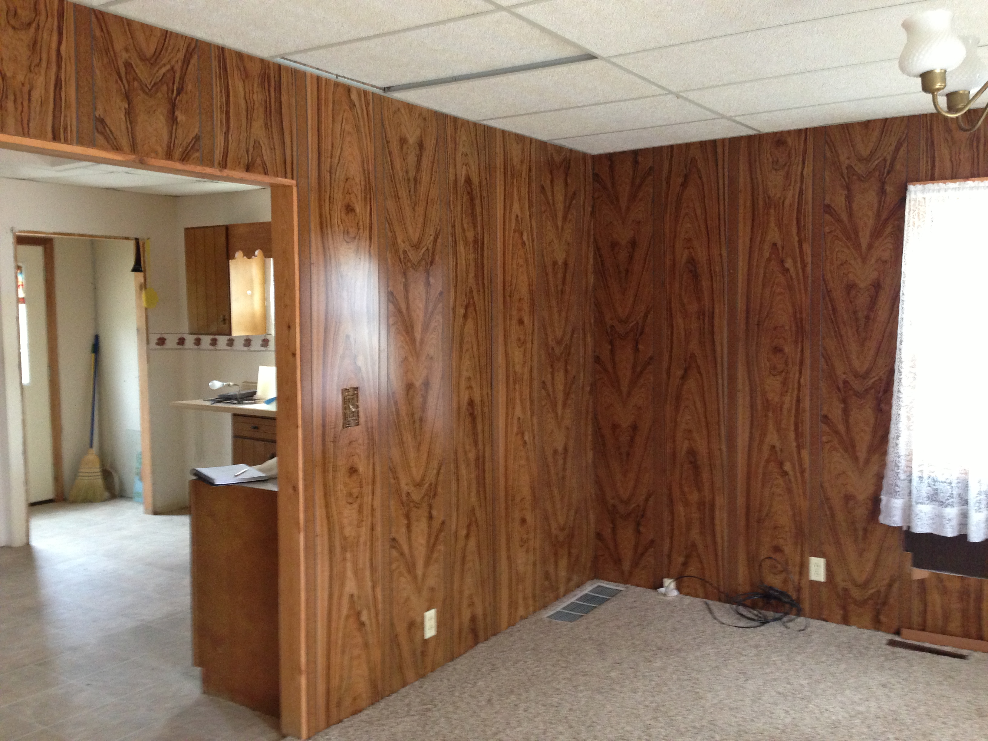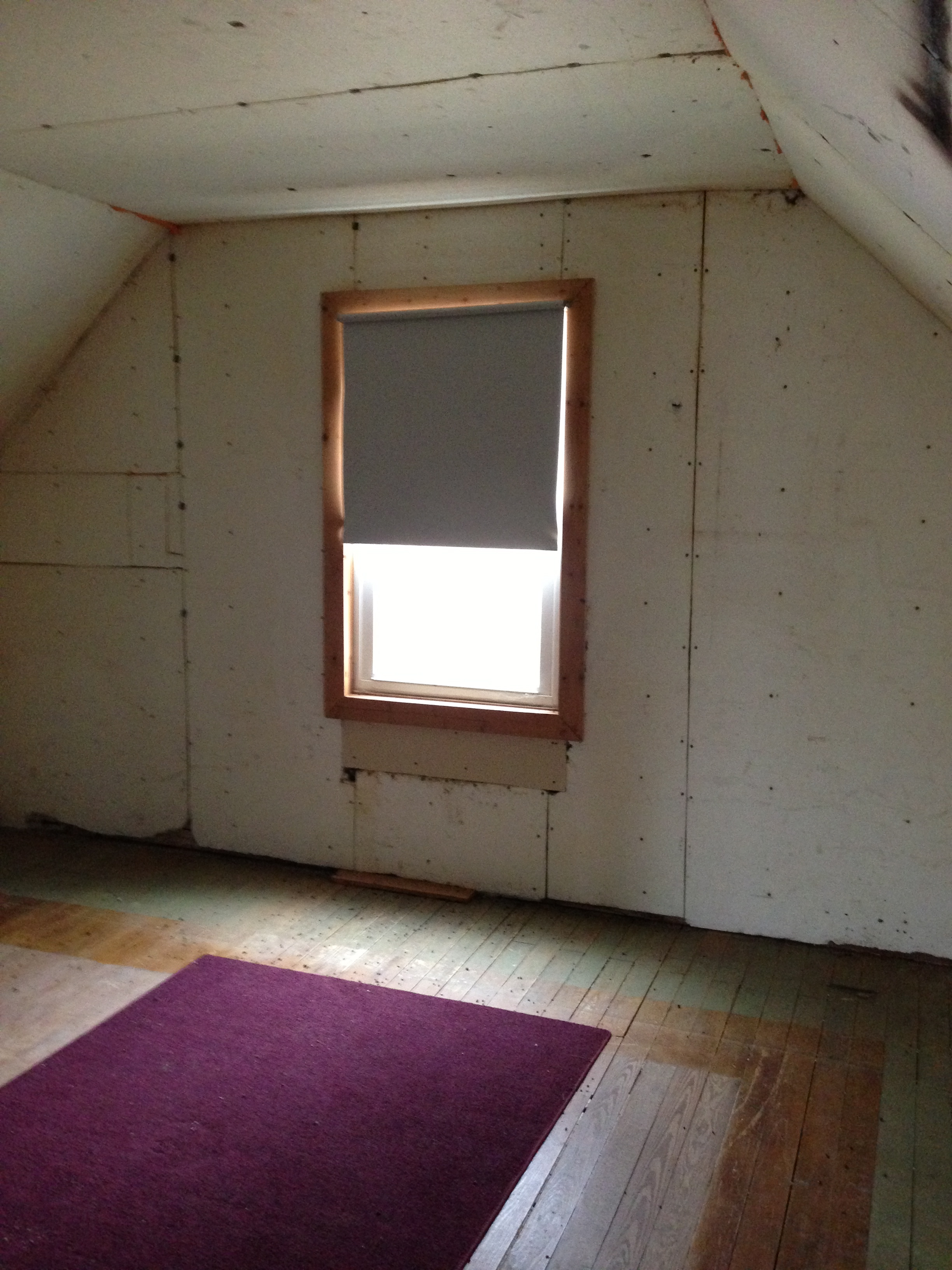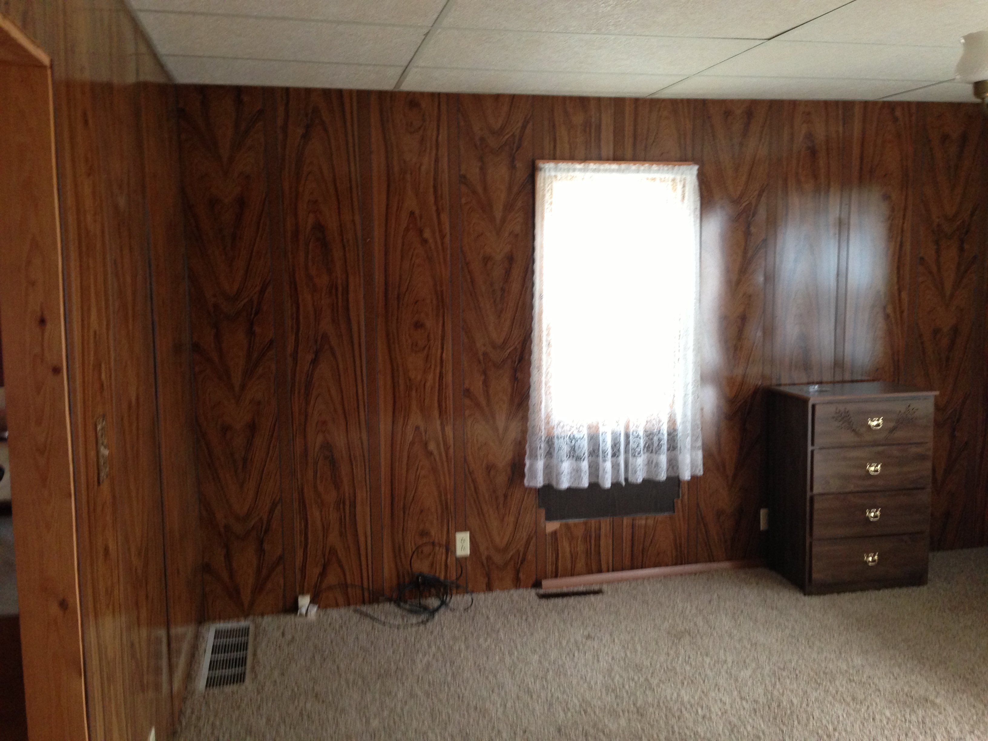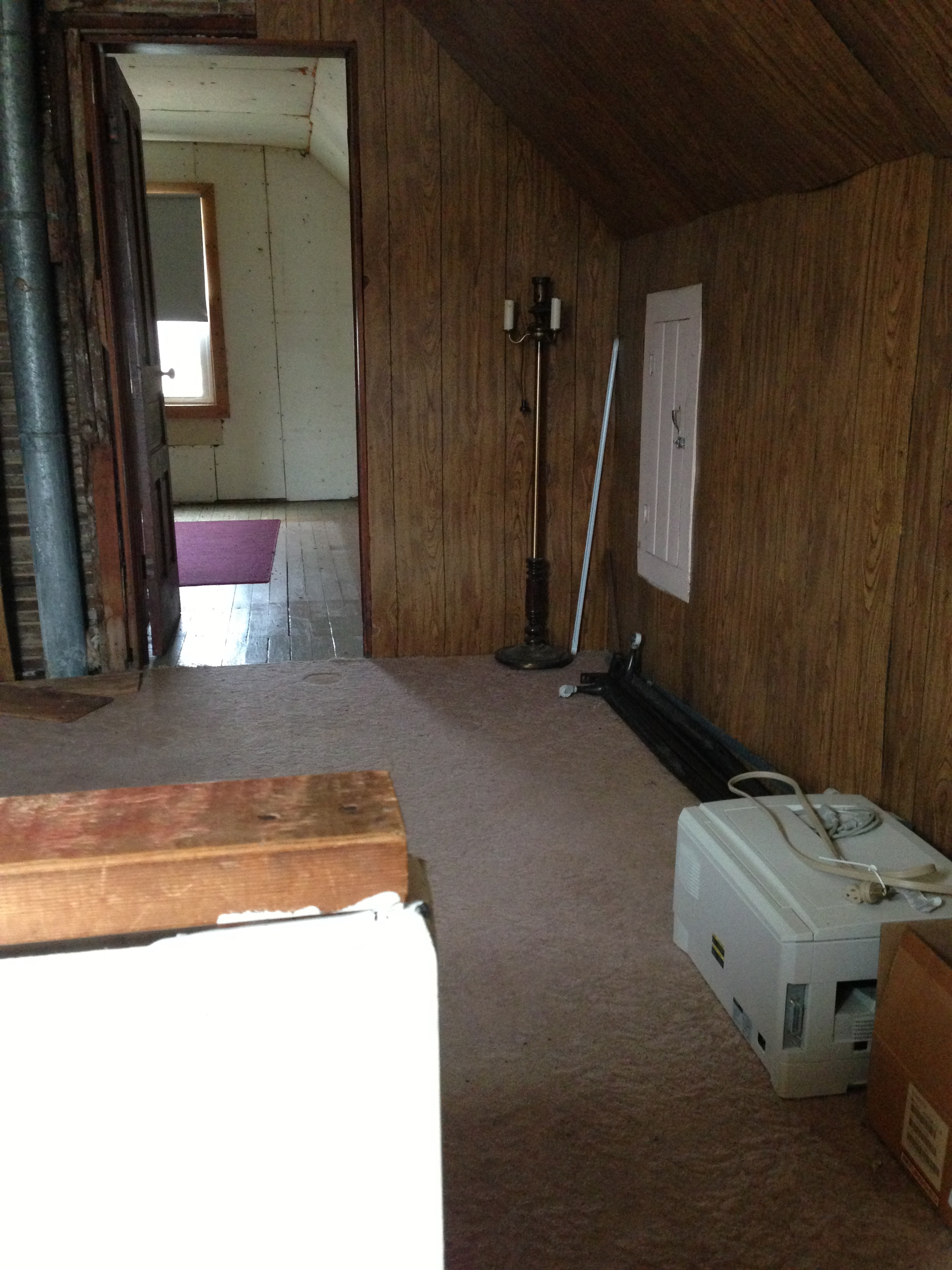 The upstairs is two rooms, this paneled one at the top of the stairs and a second room through the doorway.