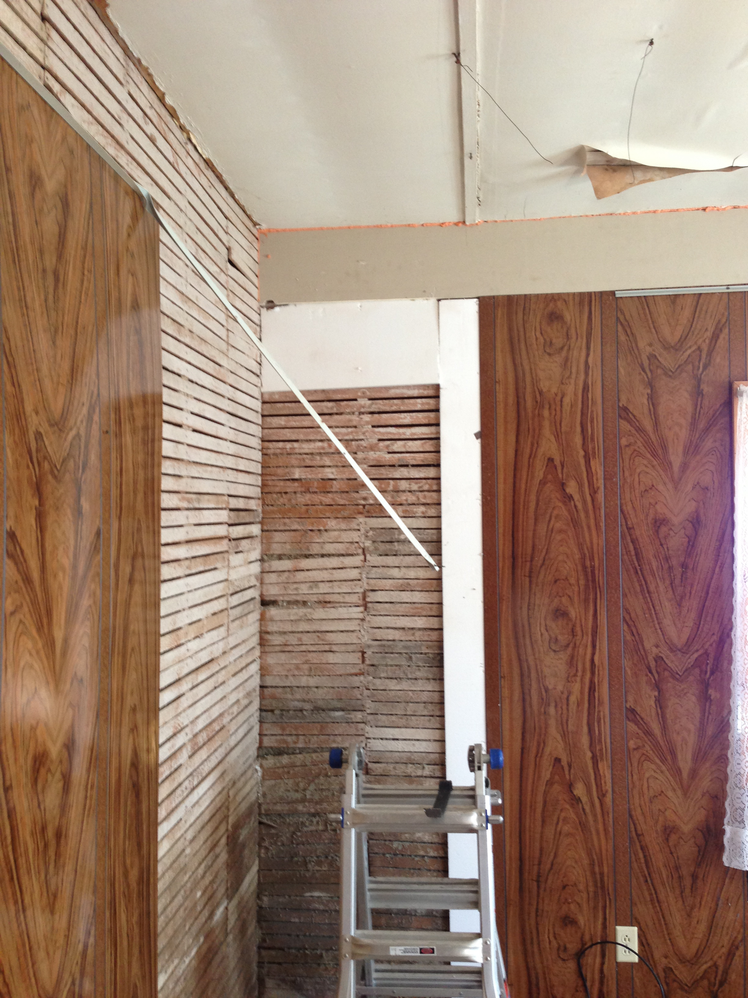 In the living room the fabulous Elvis paneling was nailed directly to the lath. And, we suspect the drop ceiling was installed only because the paneling was 8 feet tall…but the ceiling was taller. So rather than buy more paneling, they added a lovely drop ceiling.