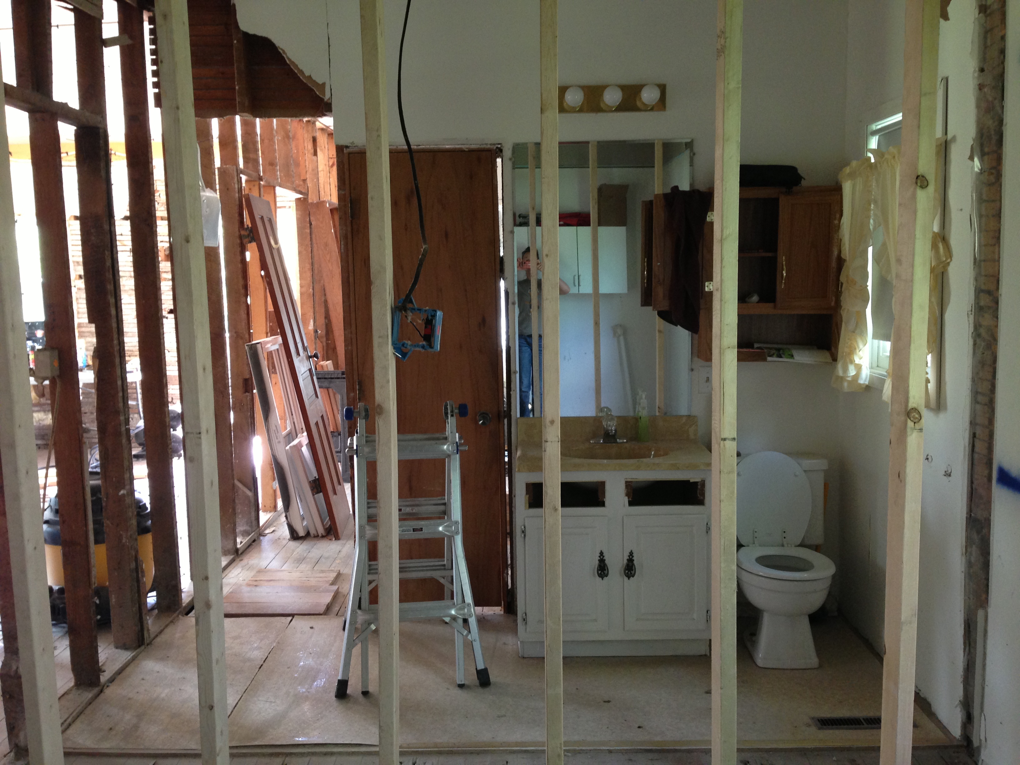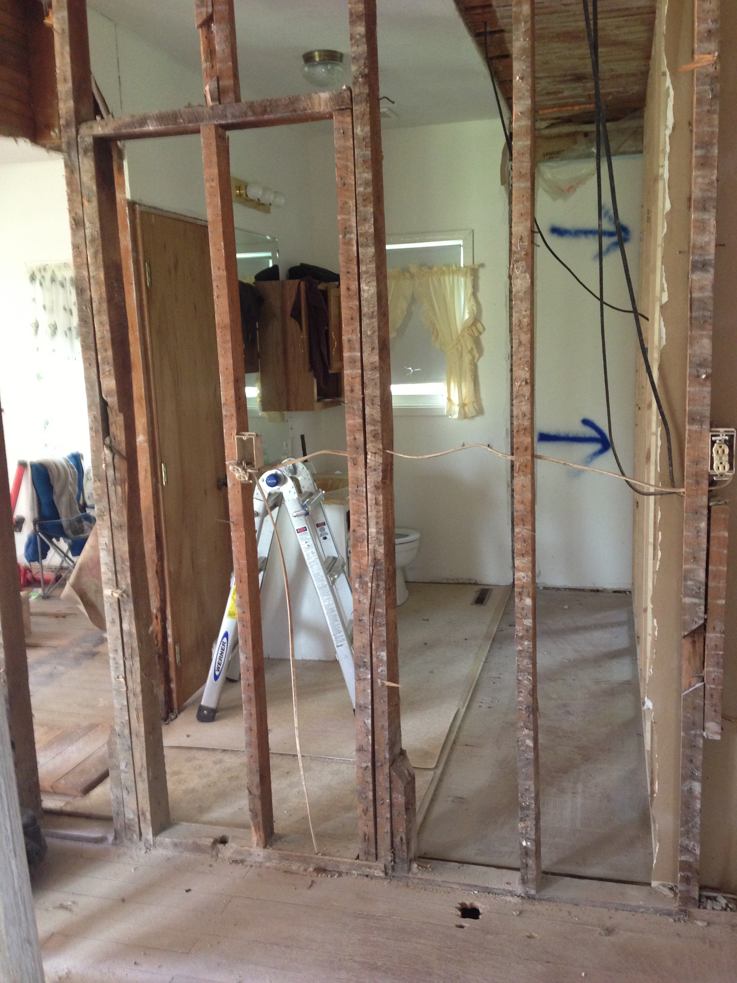 We are officially on our way to a bigger, better first-floor bathroom! Thanks to Ben’s amazing wall-moving skills, the new wall was framed and the old wall demolished. Tyler single-handedly (really) pulled the old shower surround out of its cozy home and out into the yard.