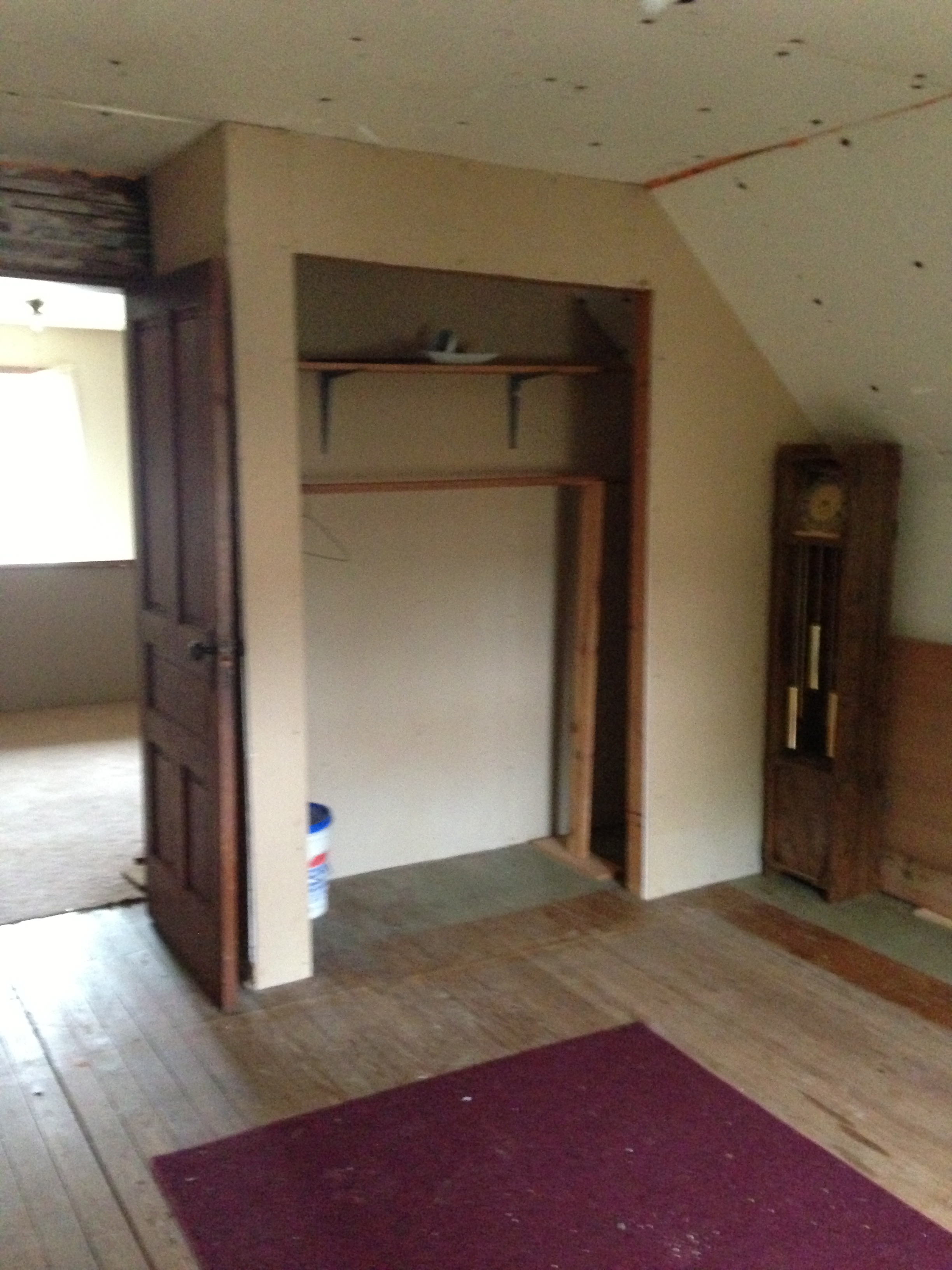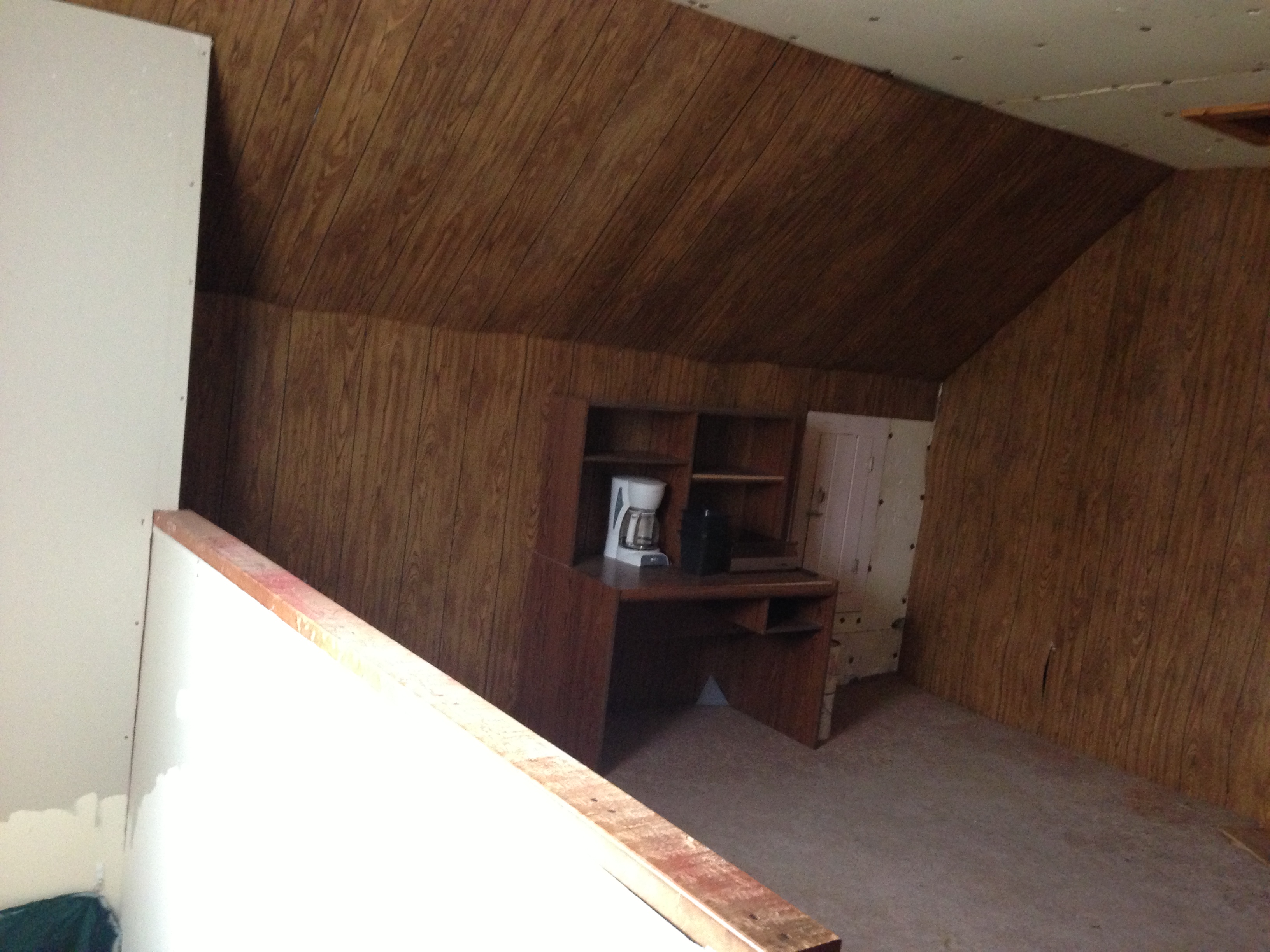 The second floor of the farm house was two rooms…at the top of the stairs, a paneled, carpeted space was home to an old printer, a cheap desk, a coffee maker, and an old lamp. The adjoining room had no carpet and no paneling (the wood sub floors with a painted rug, just like downstairs, and white foam insulation panels on the walls), a closet, a broken grandfather clock, and a huge piece of laminate.