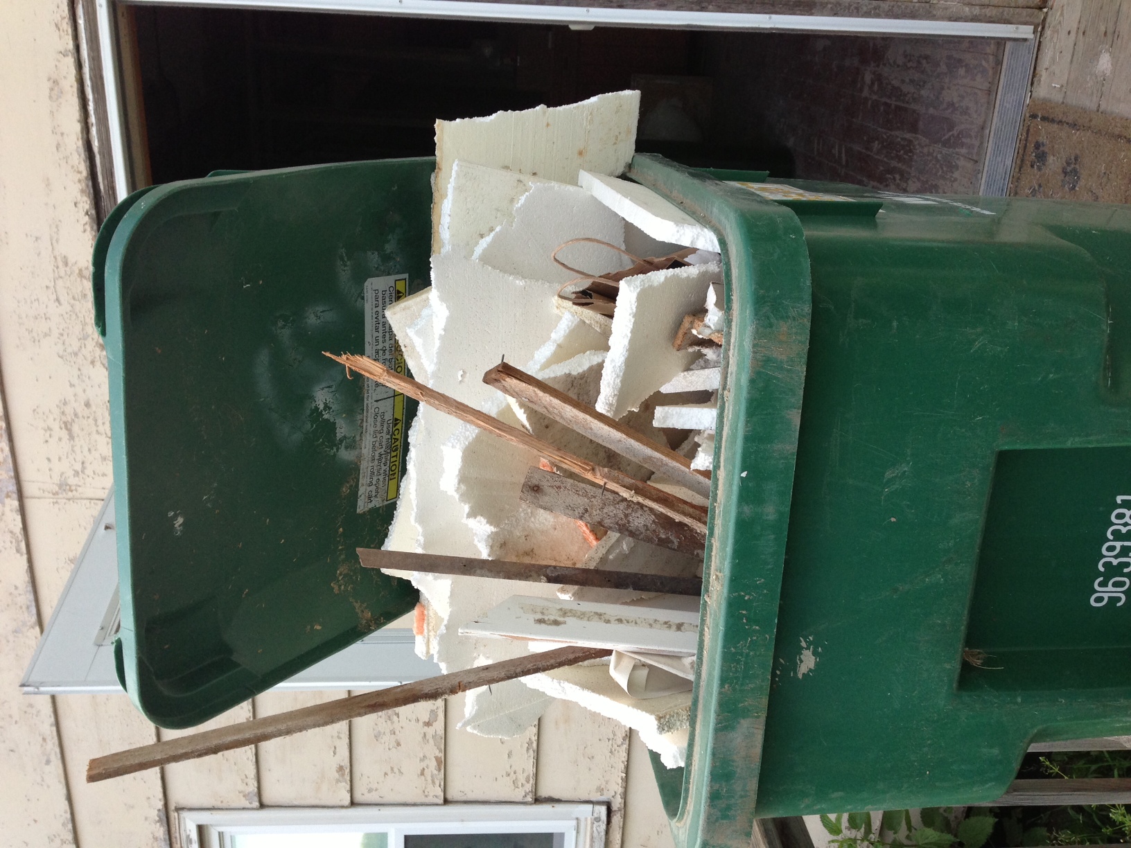 The guys took out the closet and the wall between the two rooms to create one big space…with the hot water heater’s vent pipe in the middle. Eventually, the pipe will be joined by the wood stove’s chimney and the kitchen’s vent hood exhaust and the three amigos will live in a bulkhead.