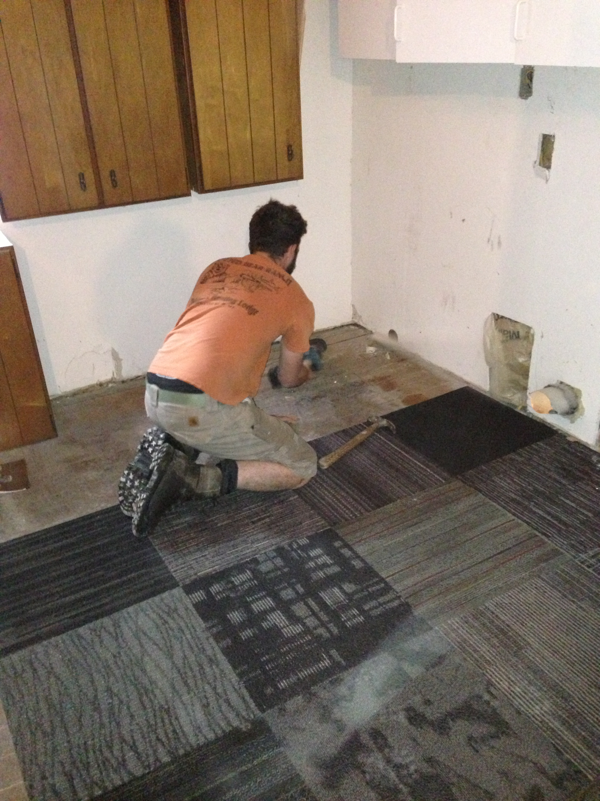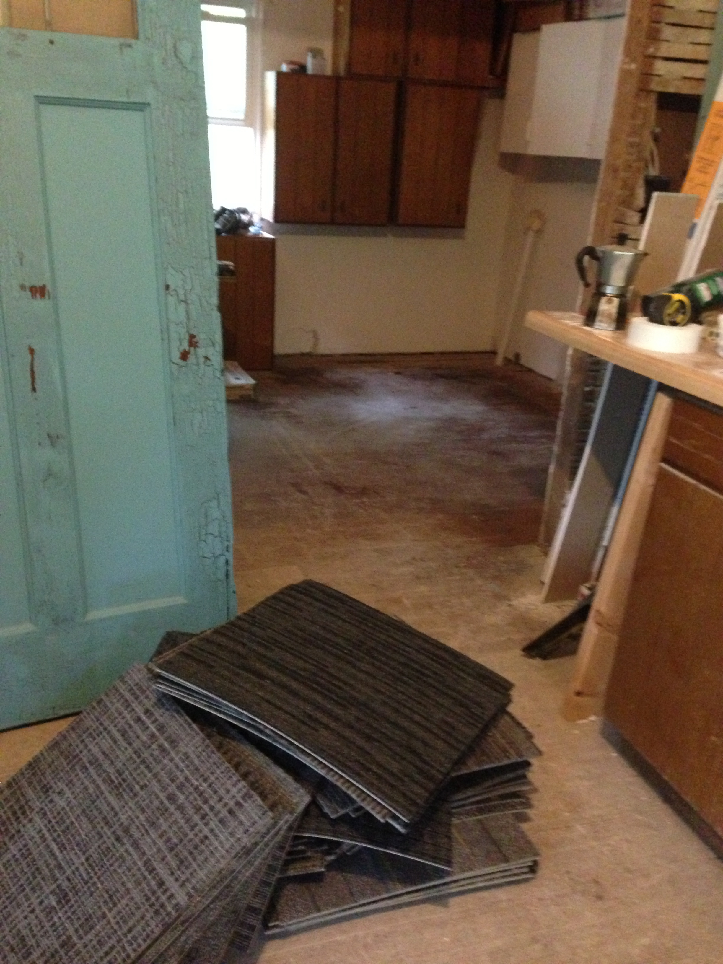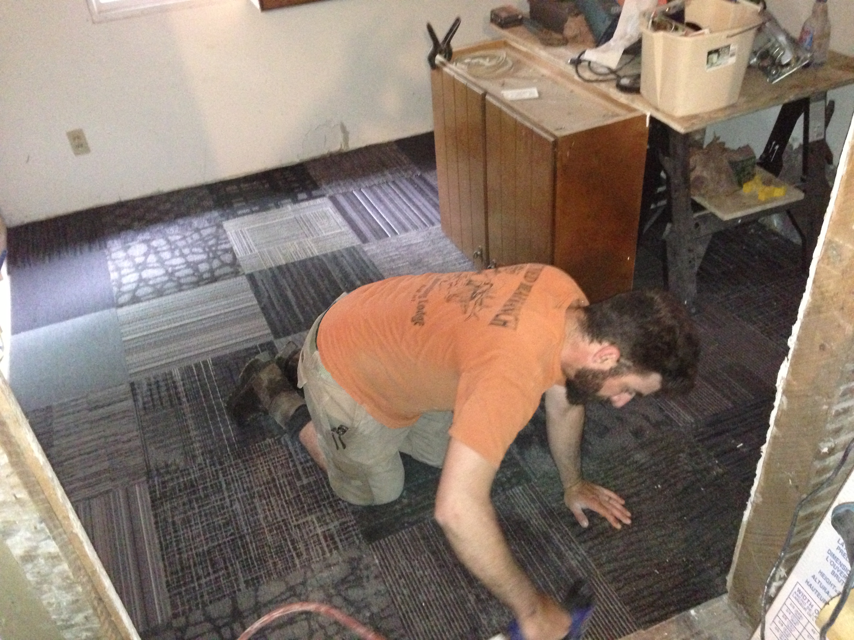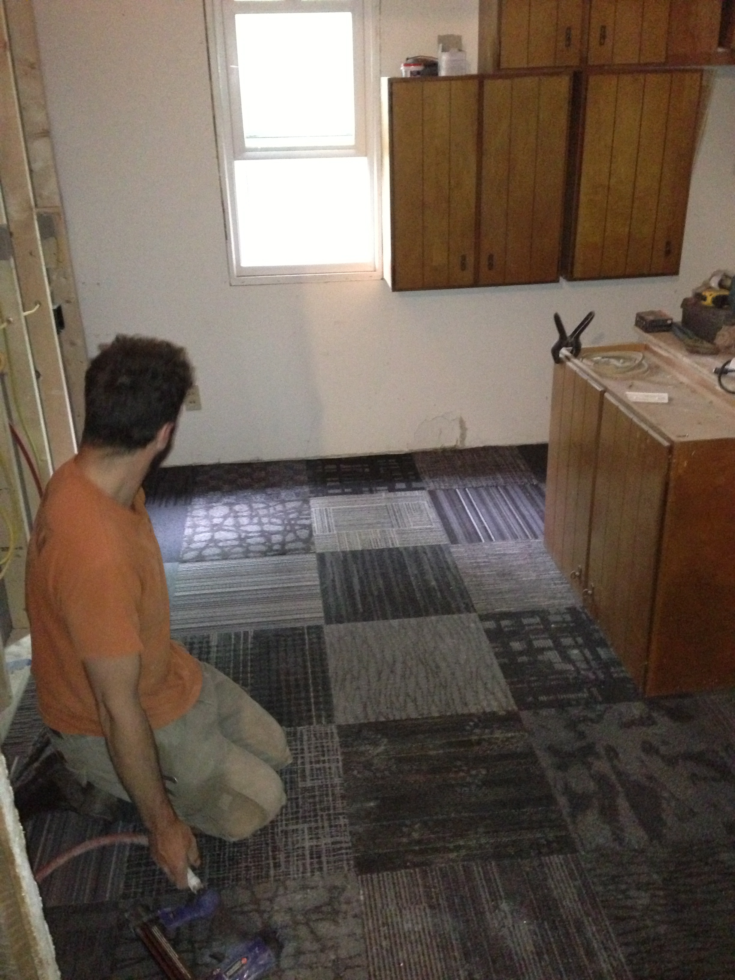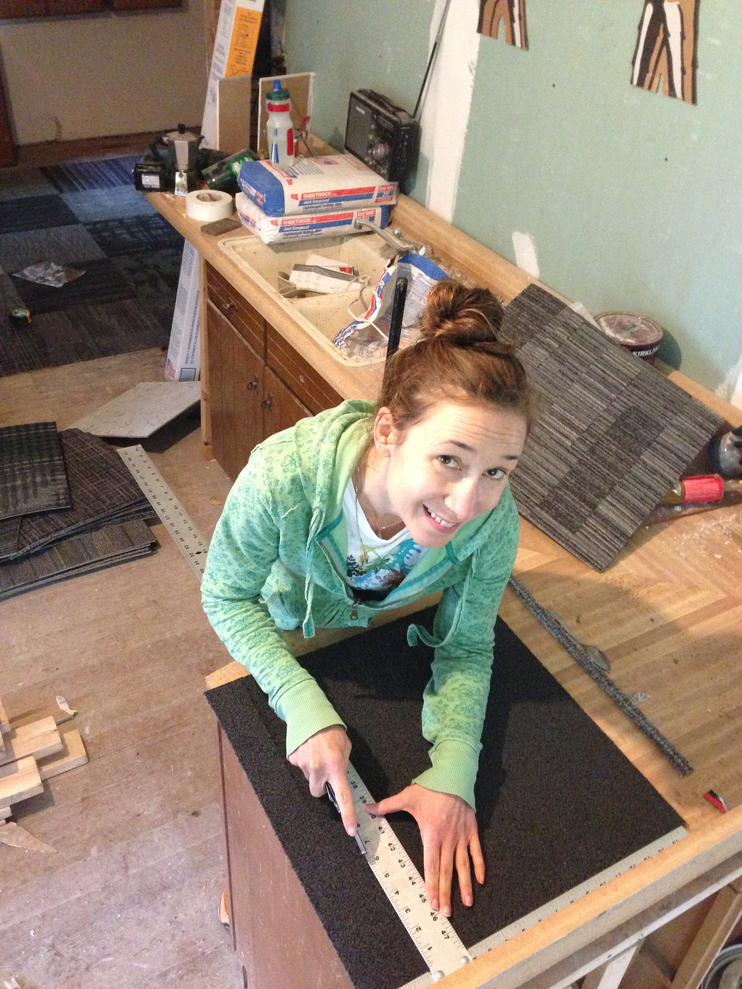 After delivering my tile treasures to the farm, Ben and I decided to go ahead and lay the Flor floor. Even though the drywall is still in progress and I know the squares will immediately be covered in dust and construction debris, we are moving appliances into the room in the next few days and need the floor in place.