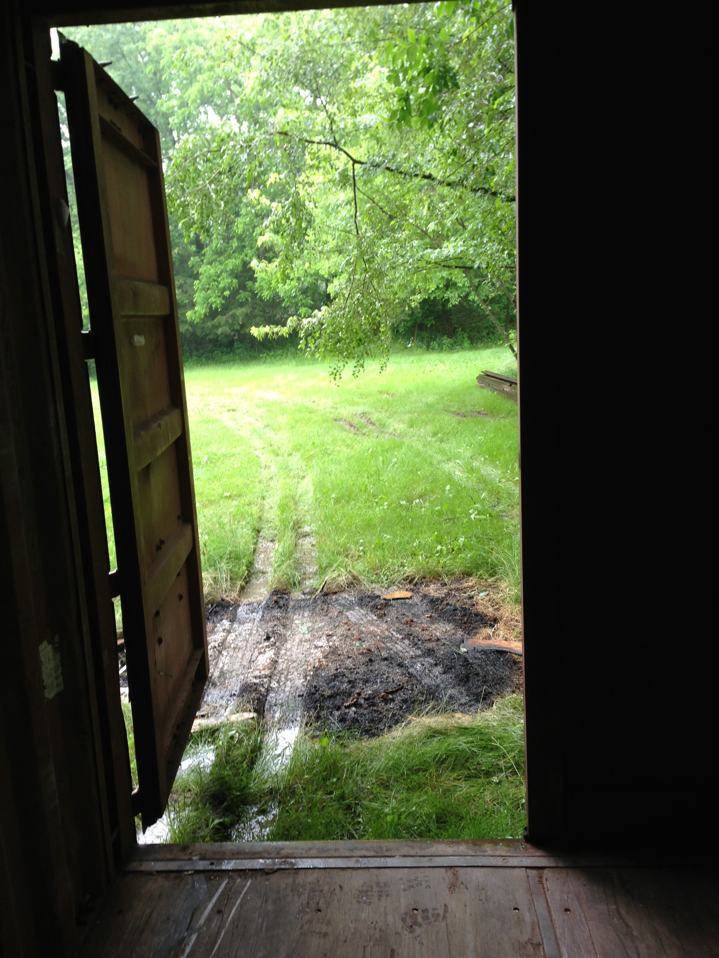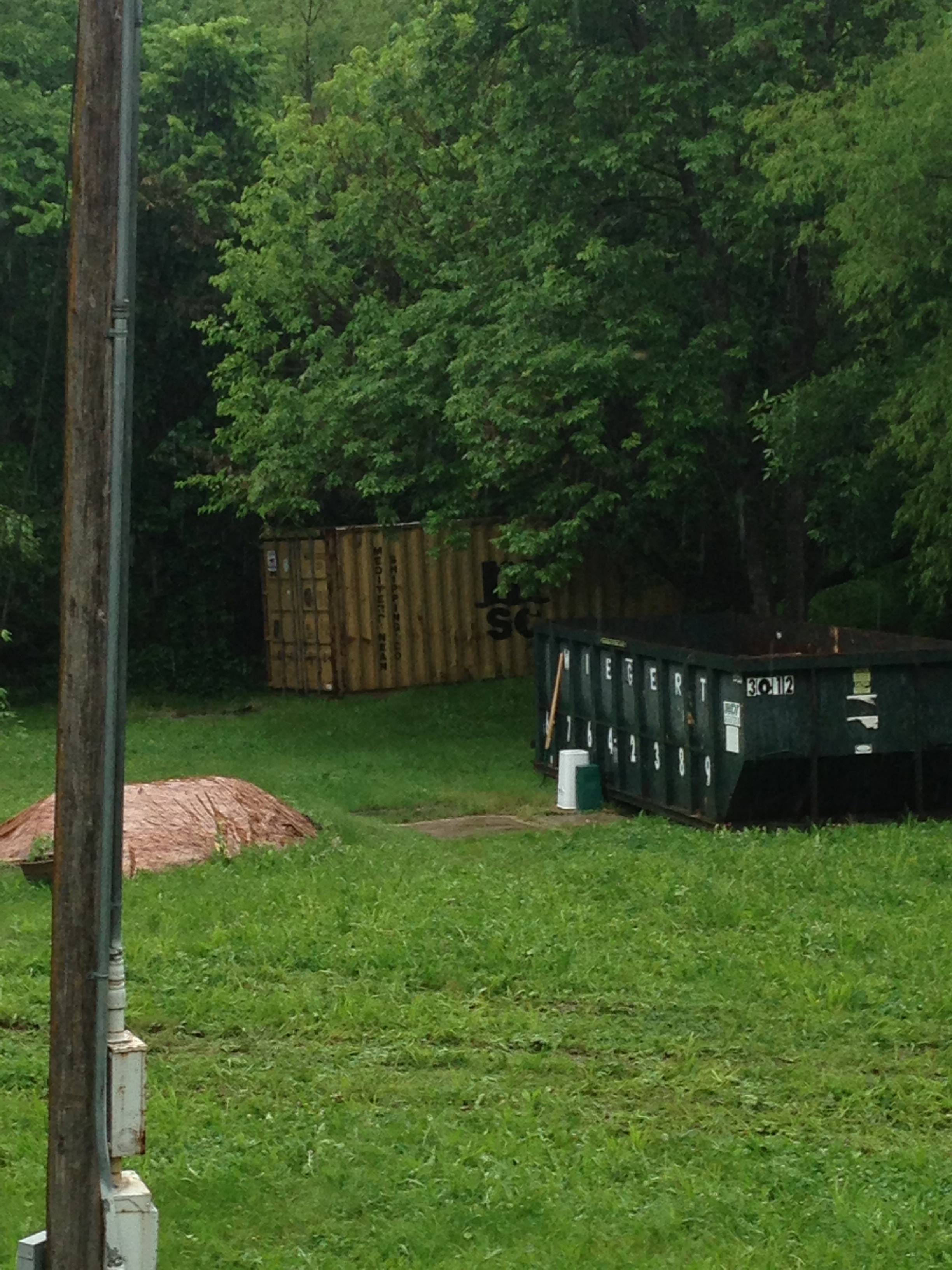 The sixty-five-foot tractor trailer that delivered this baby arrived around 9AM one morning, just as it was starting to rain. Ben specified that he wanted it tucked into the trees at the back of the lawn, between the pond and the pile-o-barn. The driver said, “Great!” and drove out across the open space behind the house and dropped the container in the perfect spot, just as Ben wanted. All the while, the rain coming down.