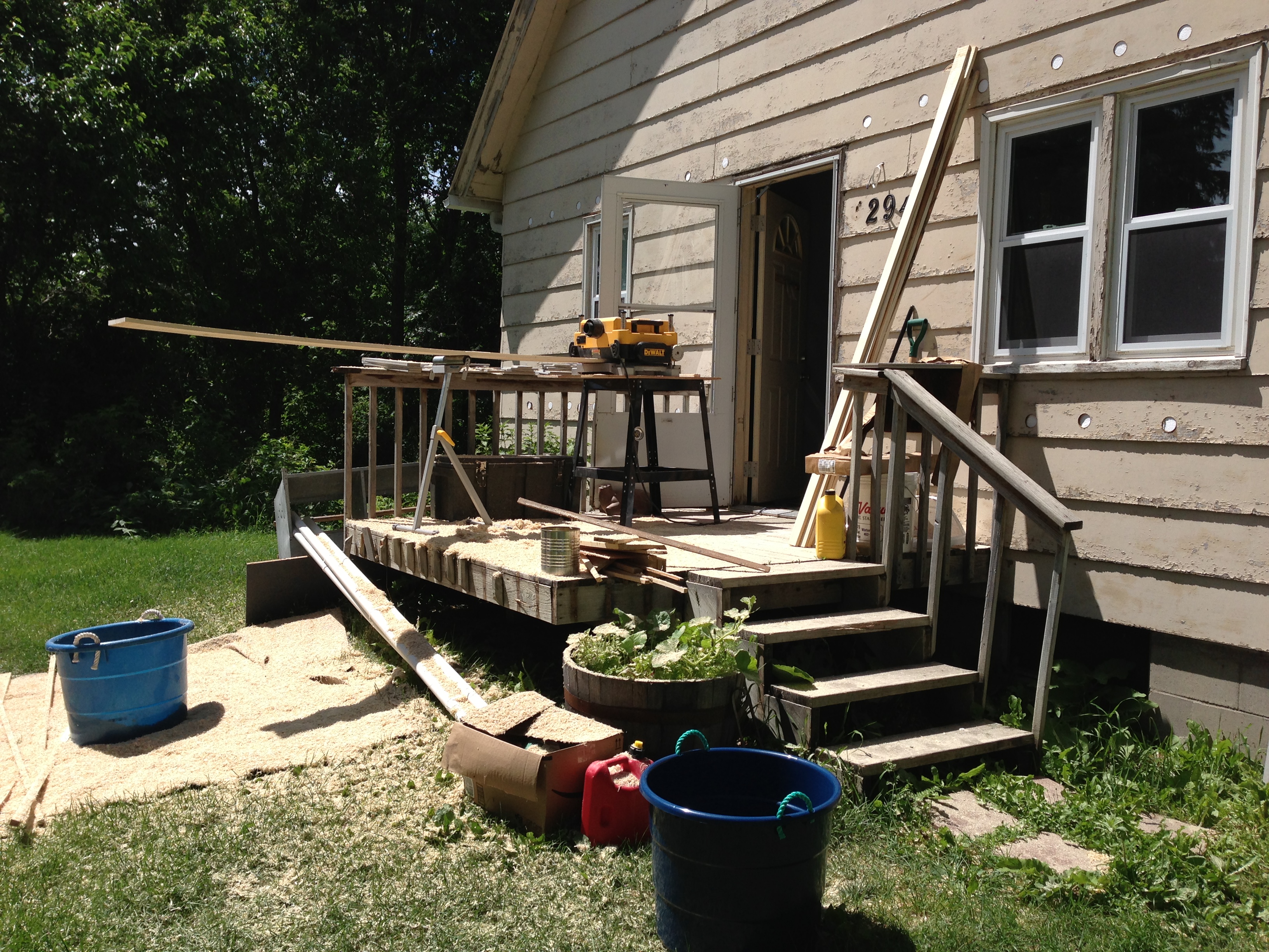 Now, back the front porch and that mess. Ben is turning the front porch into his official lumber mill where he is using a jointer, a planer, and a table saw to get our floor boards ready to install. Luckily, he is collecting (as much as possible) all the shavings and chips and dust to use in the garden as mulch. Note: The off-white square on the ground in the top photo is a tarp. The tarp is dark green, not off-white. It is completely covered in off-white wood shavings from the planer (yellow square machine on porch). It feels a bit like a snowstorm in the heat of summer.