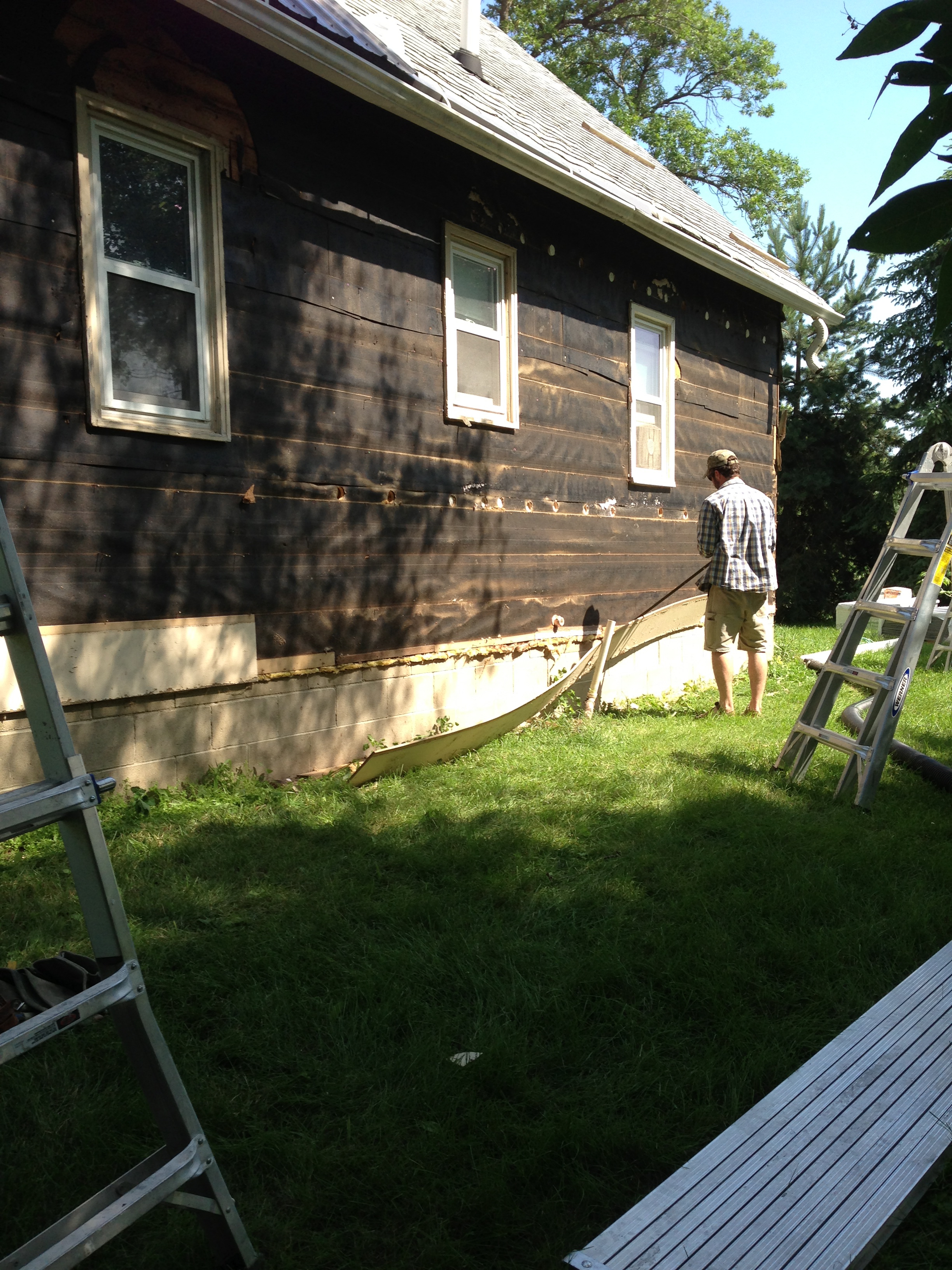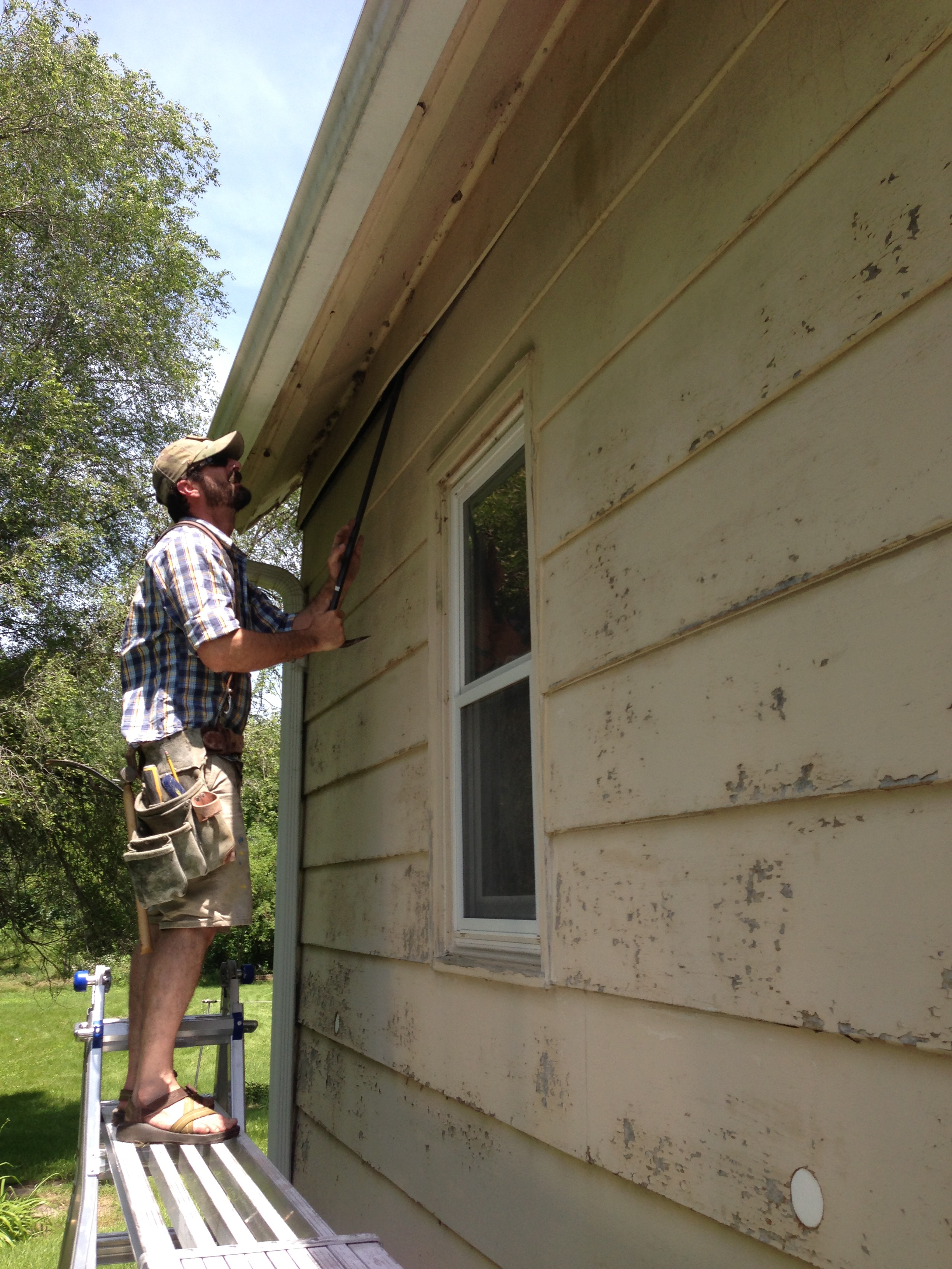 Today, we started the job—tackling one side of the house at a time. First, taking the old siding off the east side. The old masonite siding is probably 40 years old. And in rough shape. I thought it would just fall off. I was wrong. It took some major muscle!