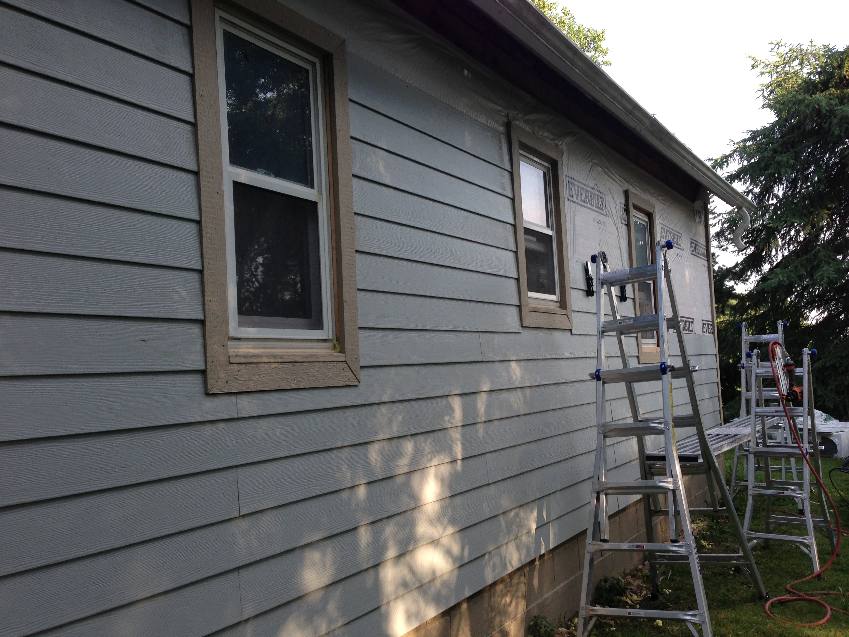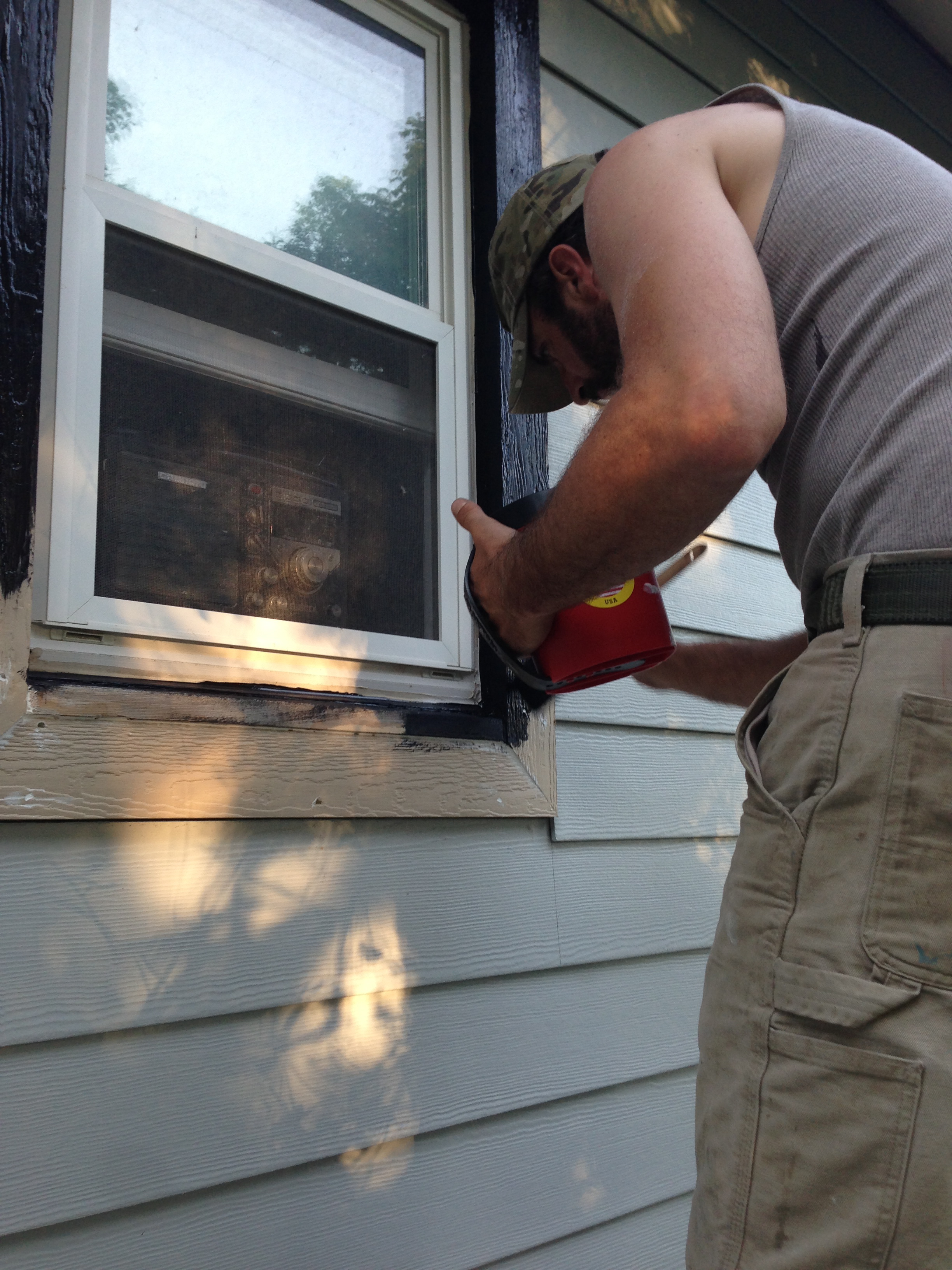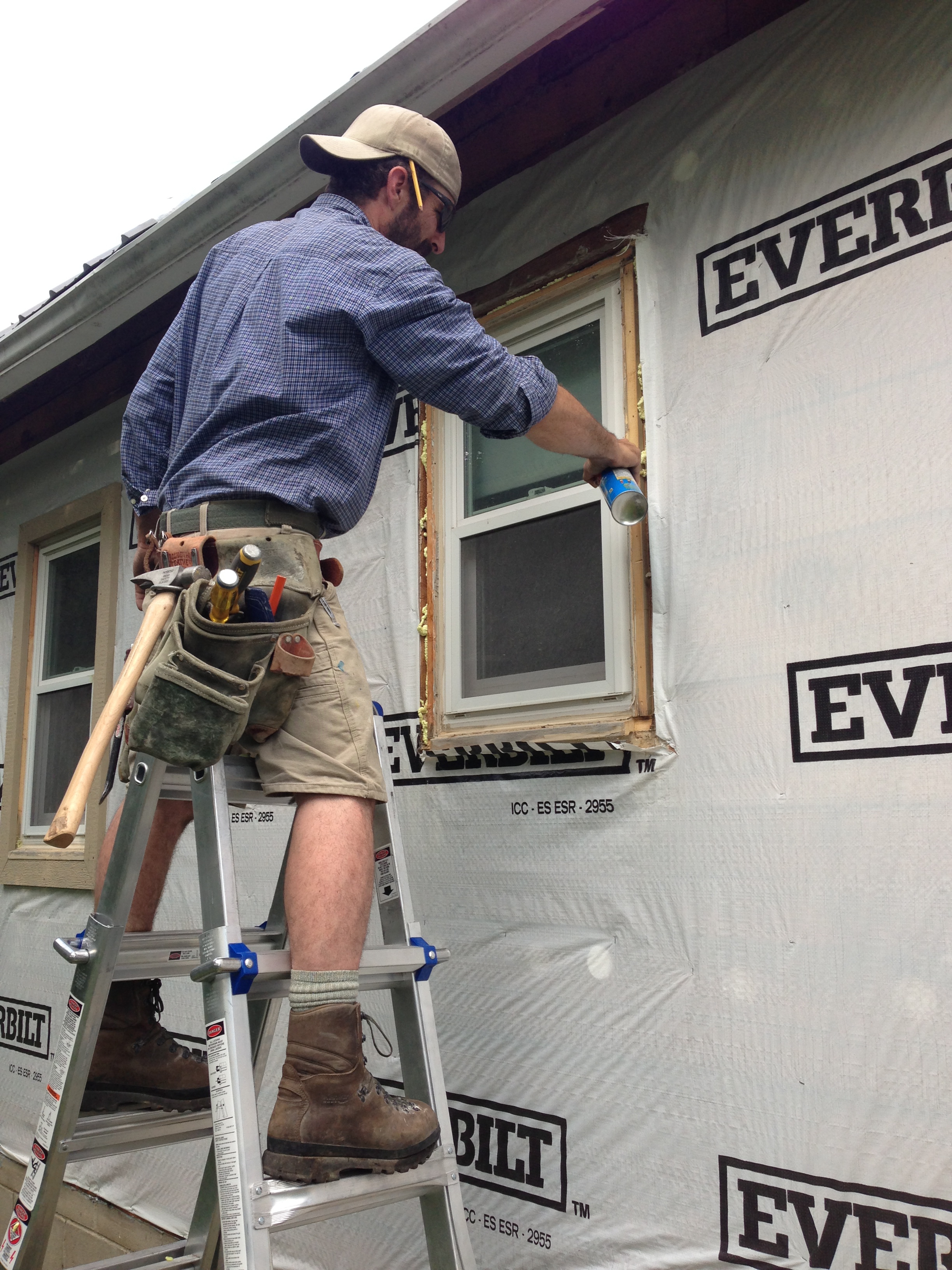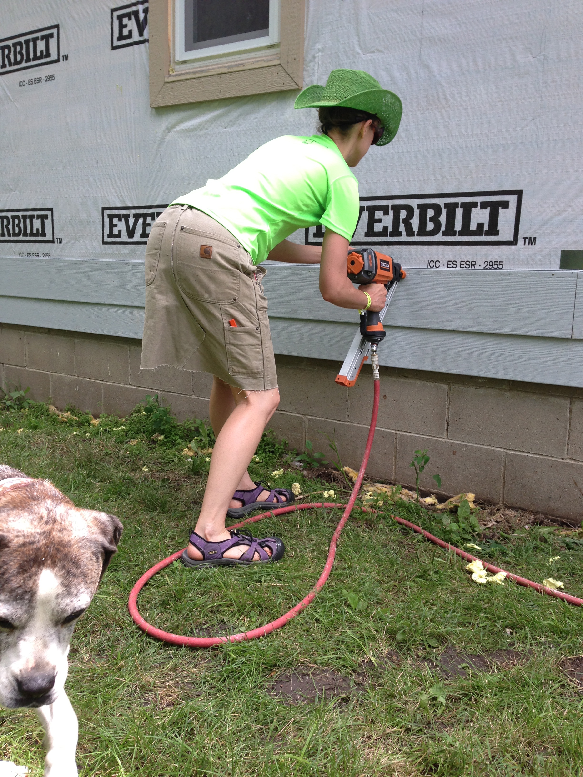 After stripping one side of the house of her layers of old stuff, we got to work installing the new house wrap, re-caulking and insulating windows with spray foam, and hanging the siding and trim. Ben has done this stuff before, but me? Not so much. I learned A LOT, got to experience the thrill of using really loud, formerly scary power tools, and learned to dance the do-si-do on ladders and a plank with Ben. All in all, a great day with lots to show for our efforts!