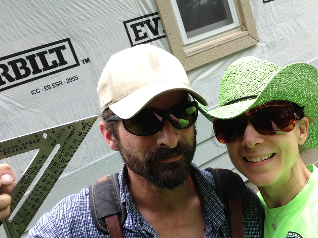 A shout-out to my sister for the rock-solid awesome skirt made from a pair of Ben’s old Carhartt work pants! Ben was determined to get this shot of me really working and showing off my new skills with the Rigid nail gun and the Skilsaw while wearing the skirt. My apologies for the butt shot.