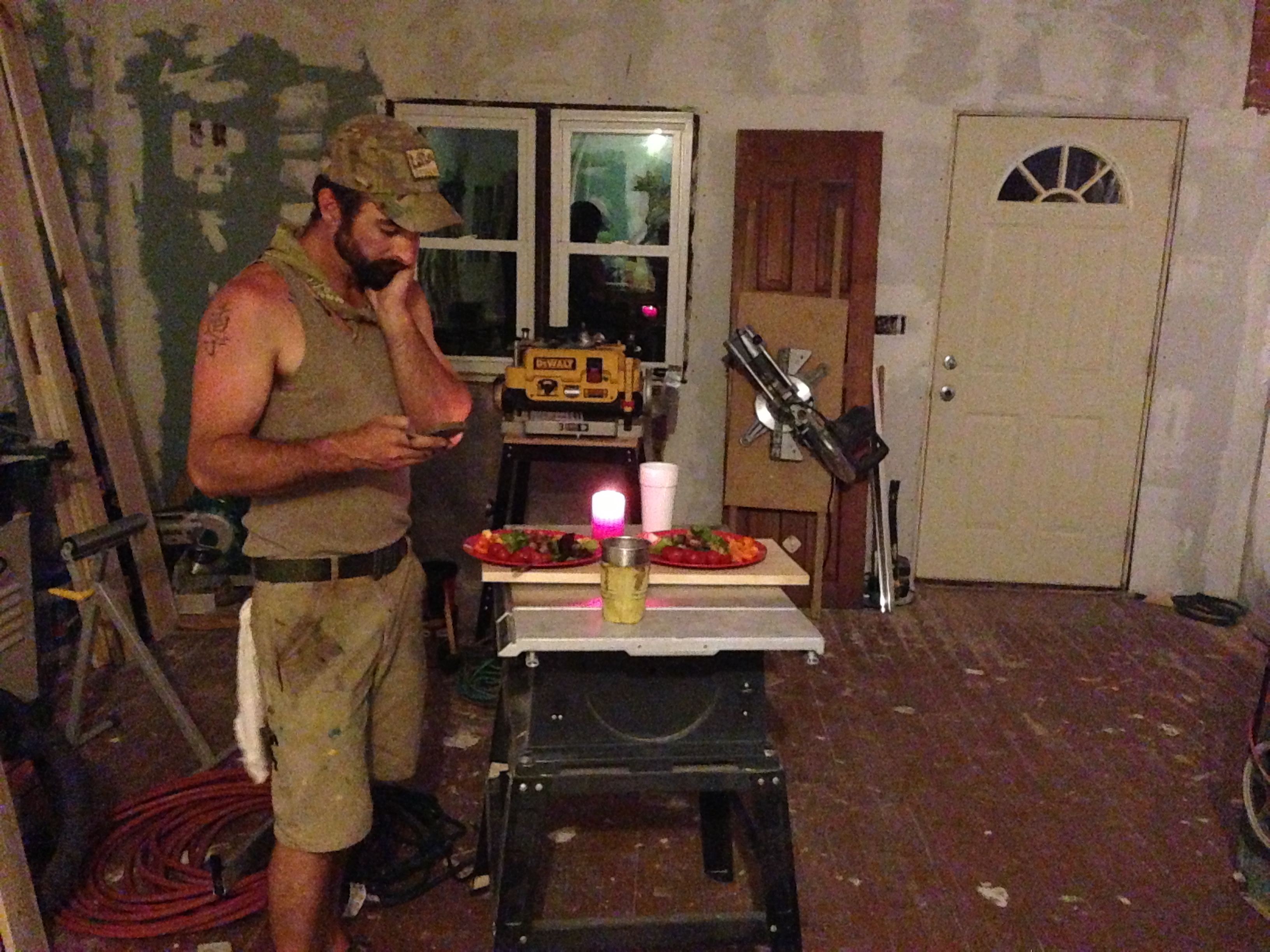 After a long day in working in the hot sun, the bugs came out in force and made it too miserable to be outside. So we set up a candle-lit table-saw dinner in the living room. Bon Appetite! And, time for bed. This siding thing is hard work!