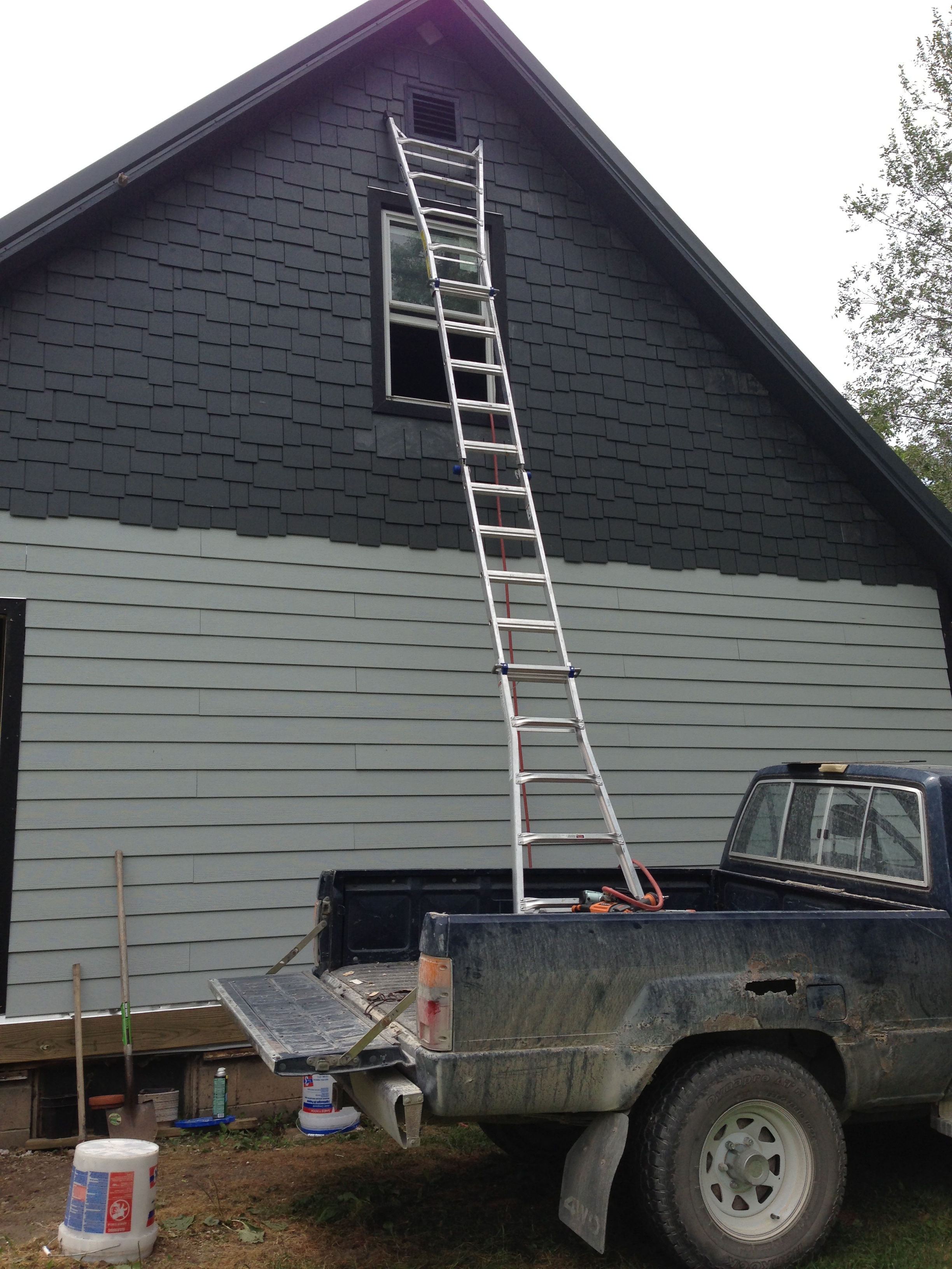 Ben installs the very last piece. Our ladder is just barely tall enough...and its standing in the bed of the truck!