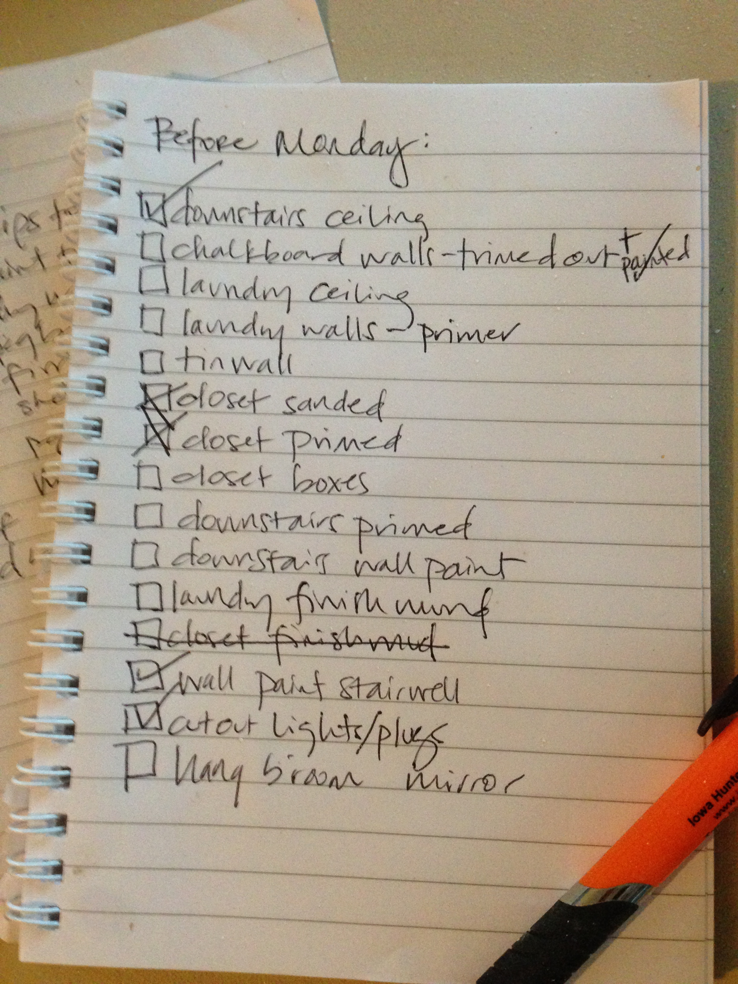 The weekend leading up to Electrify Monday was a whirlwind of sanding, mudding, priming, and painting. Several of you have offered to come and help paint—never fear!  We did not ignore your offers, I promise! There’s plenty more to do! We took a bit of a break from our rather mundane wall color (I love it, but let’s face it, it’s off-white) to have some fun creating a chalkboard wall.