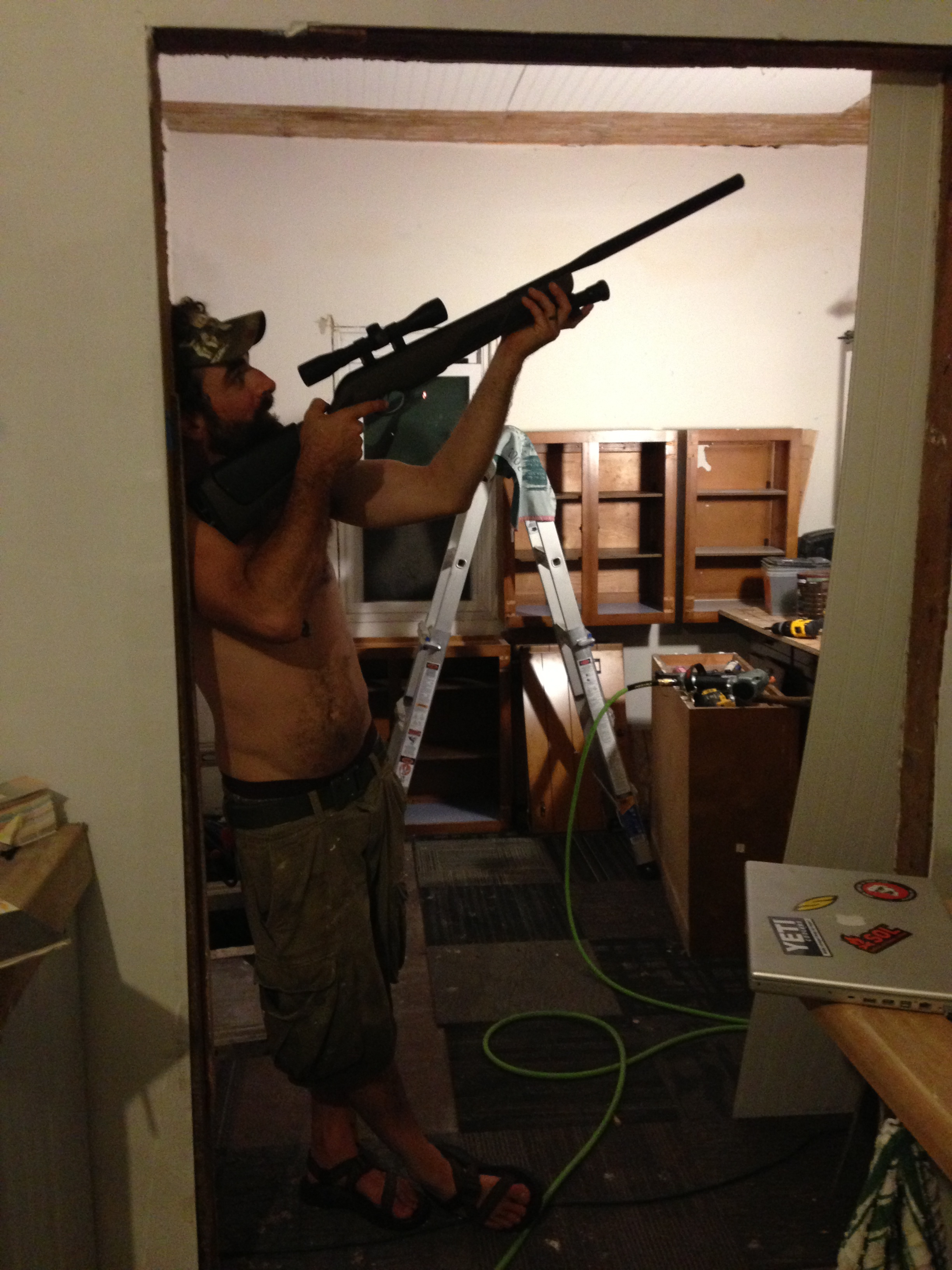 Ben spotted a mouse while we were hanging the laundry room ceiling (pre-finished beaded board). Here, he’s got his pellet gun at the ready for when the rodent shows its mousy face again. No such luck yet. Mouse: if you are reading this, you’ve been warned!