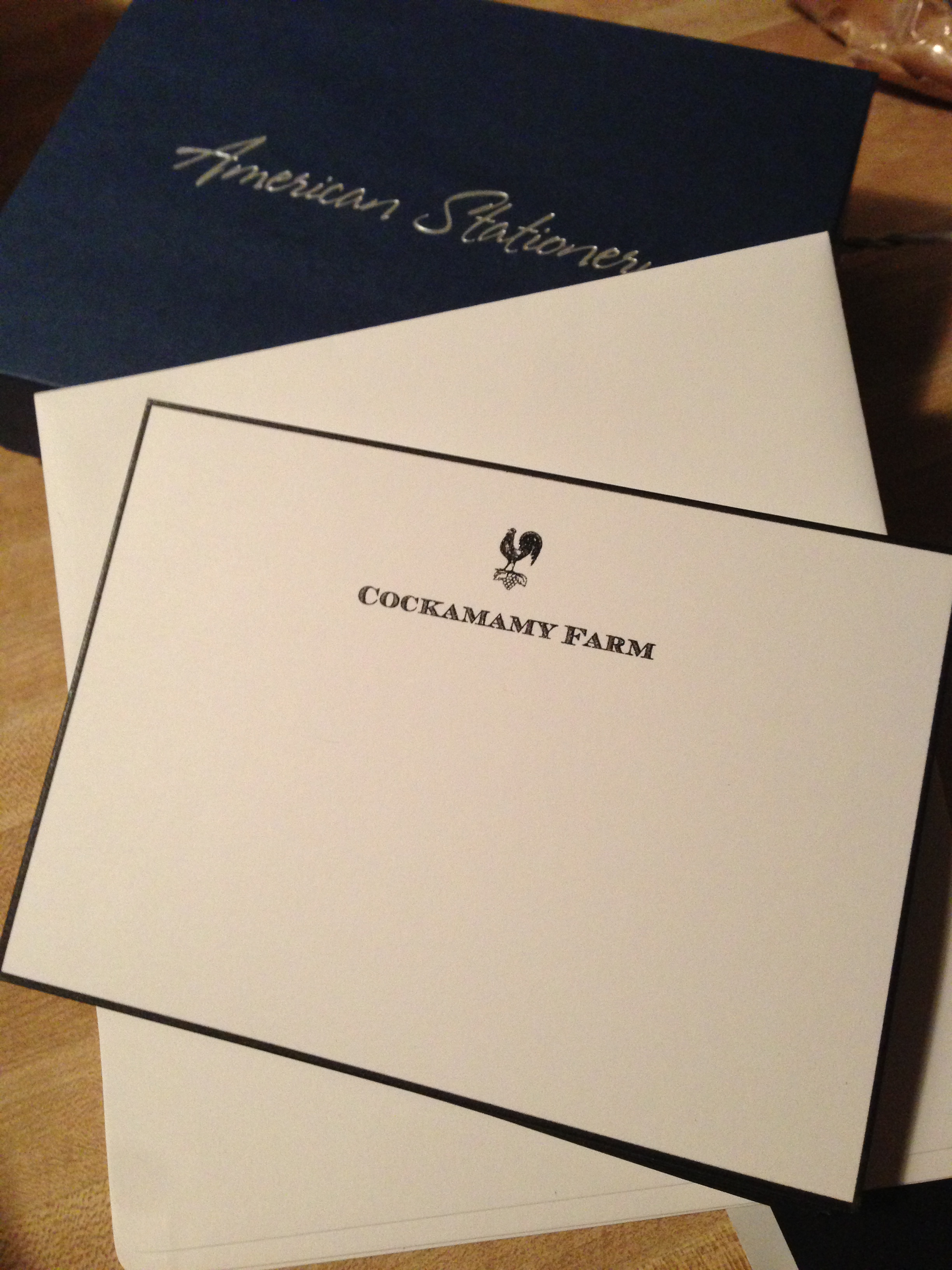 For my latest, I ordered official Cockamamy stationary from americanstationery.com—my go-to source for customized notecards and envelopes. Even if we don’t have furniture or a working kitchen, we can at least write thank-yous like civilized folks!