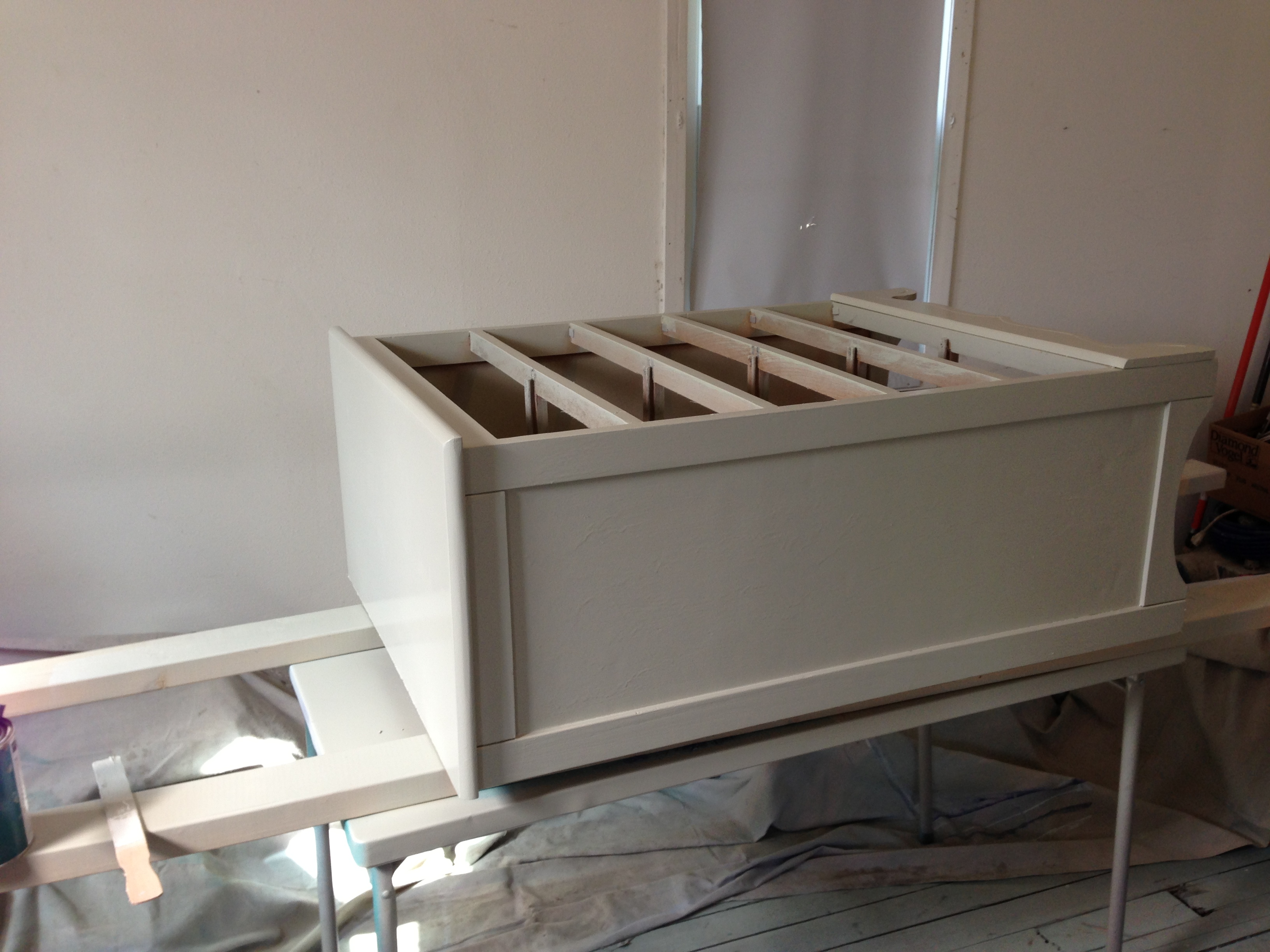 Spackling, sanding, more spackling, more sanding…then I touched up the paint on the top drawer.