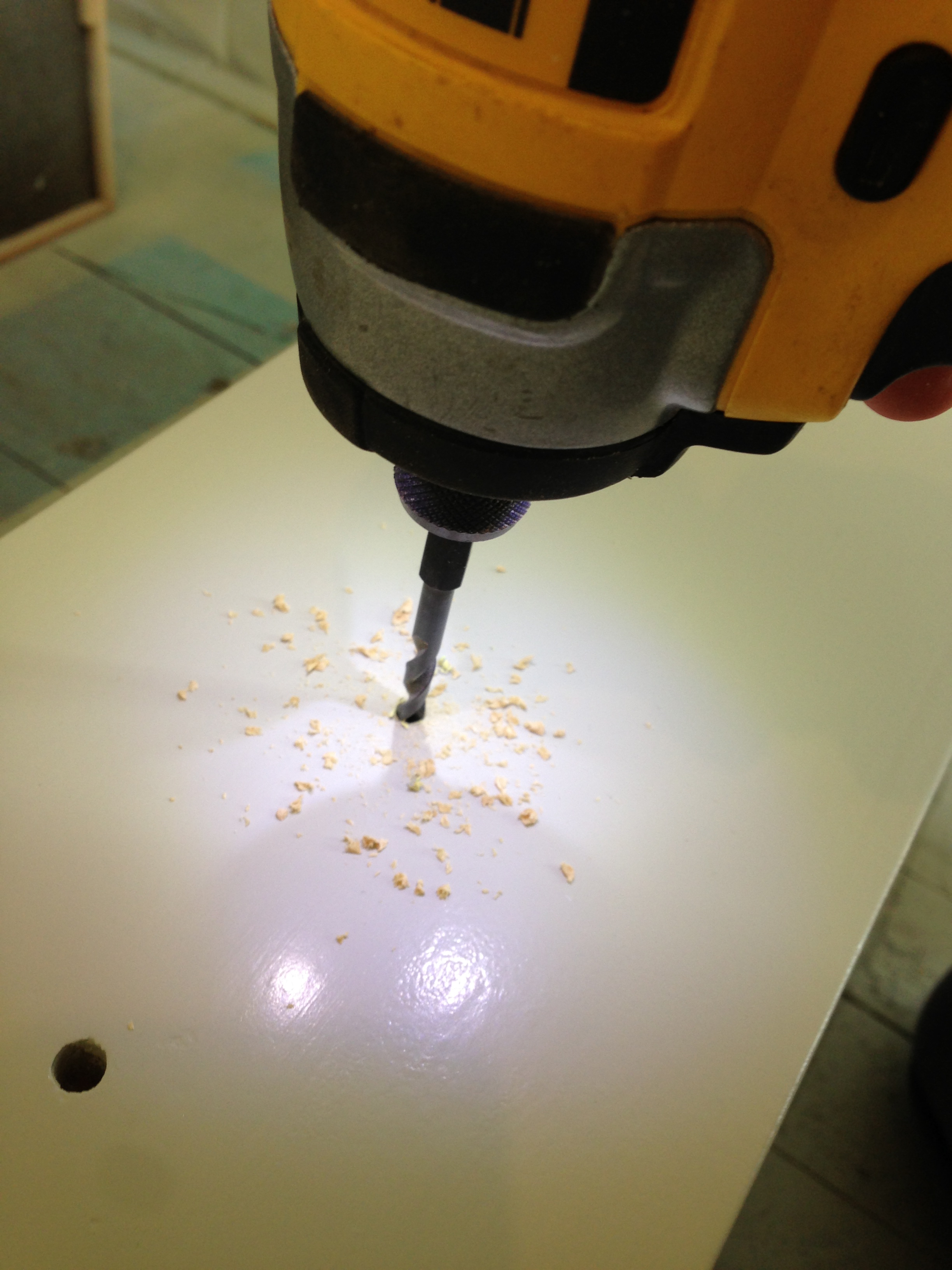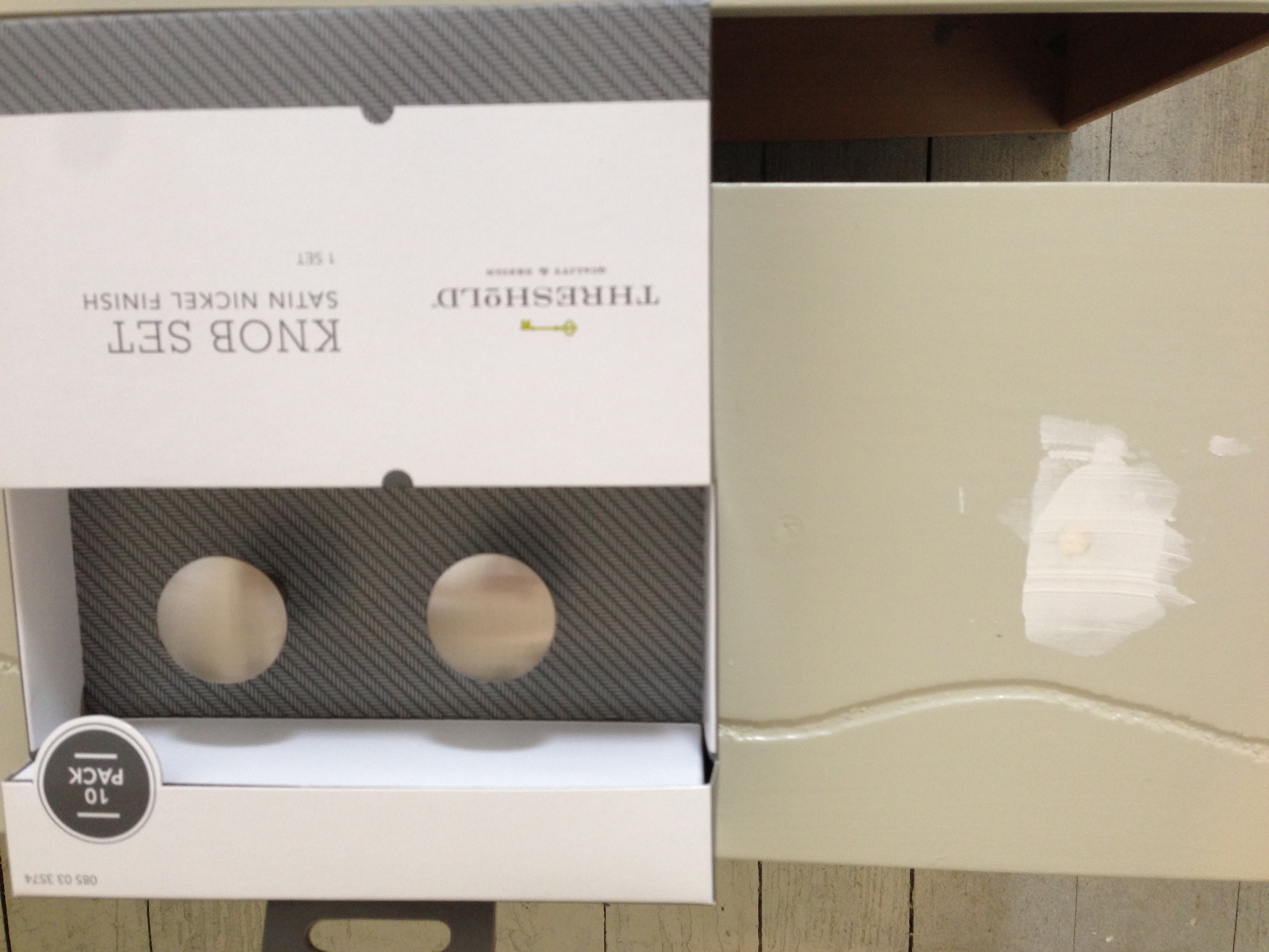 After painting, I had to patch the top drawer’s remaining holes. This time I used spackle—the kind that goes on pink and dries white—instead of wood filler because the wood filler has a rough, sandy texture and spackle is smooth.