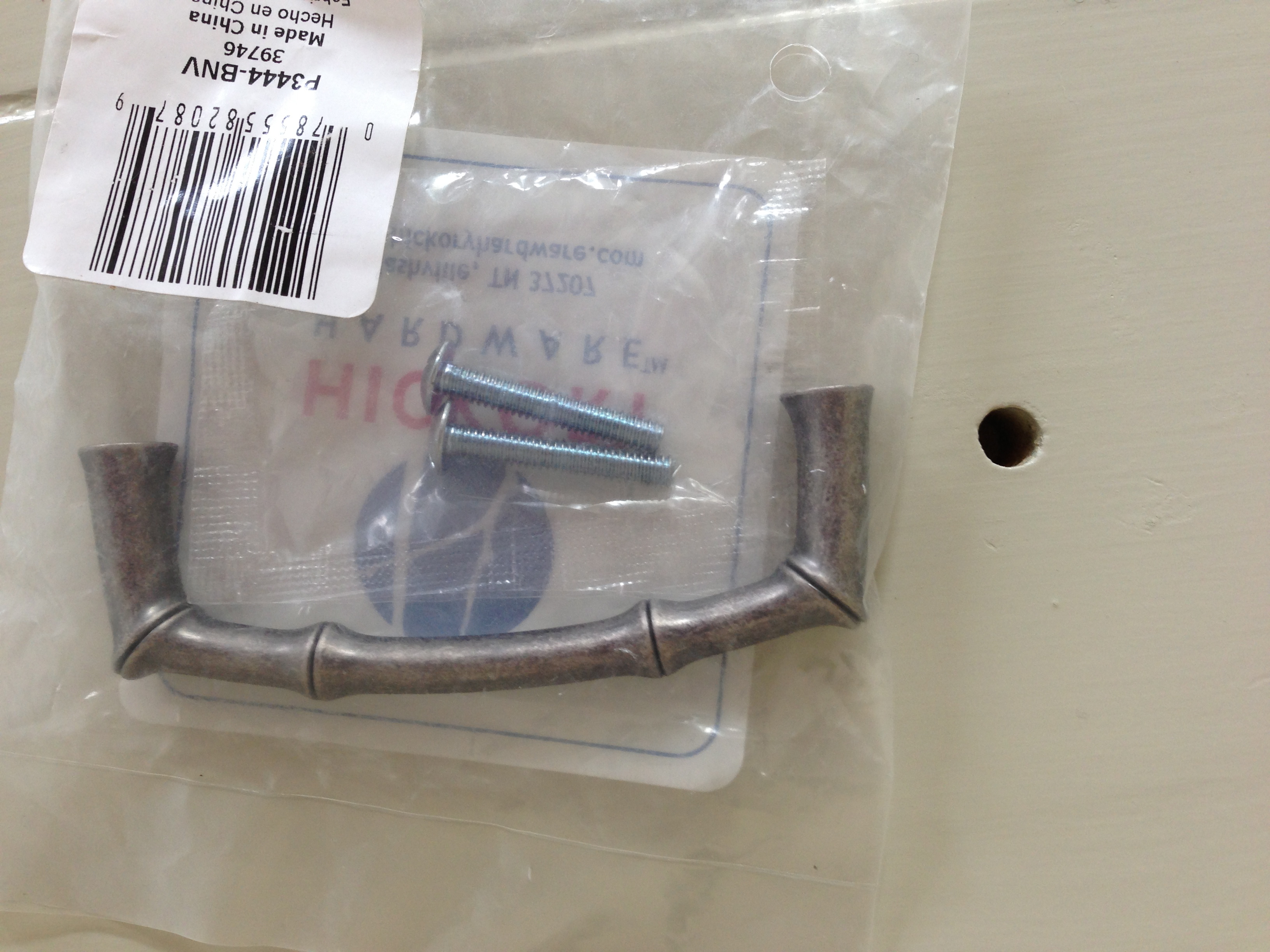 I tried on the new pulls only to discover that the spread on the new attachments was wider than on the old…I really wish someone would standardize the width between screw holes on cabinet hardware! Can I get an Amen?