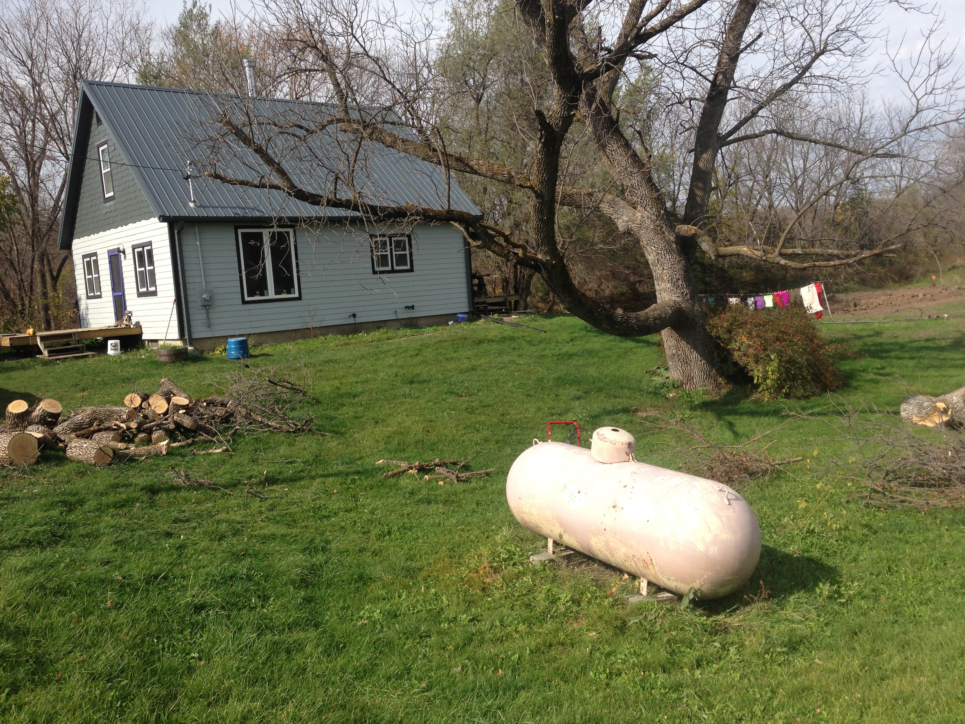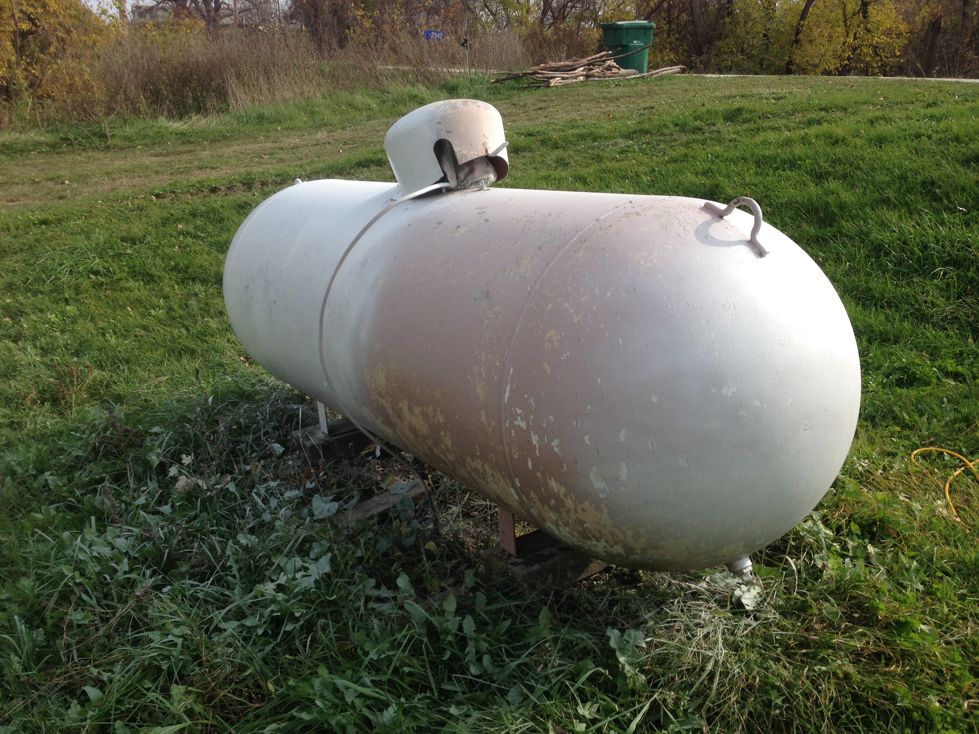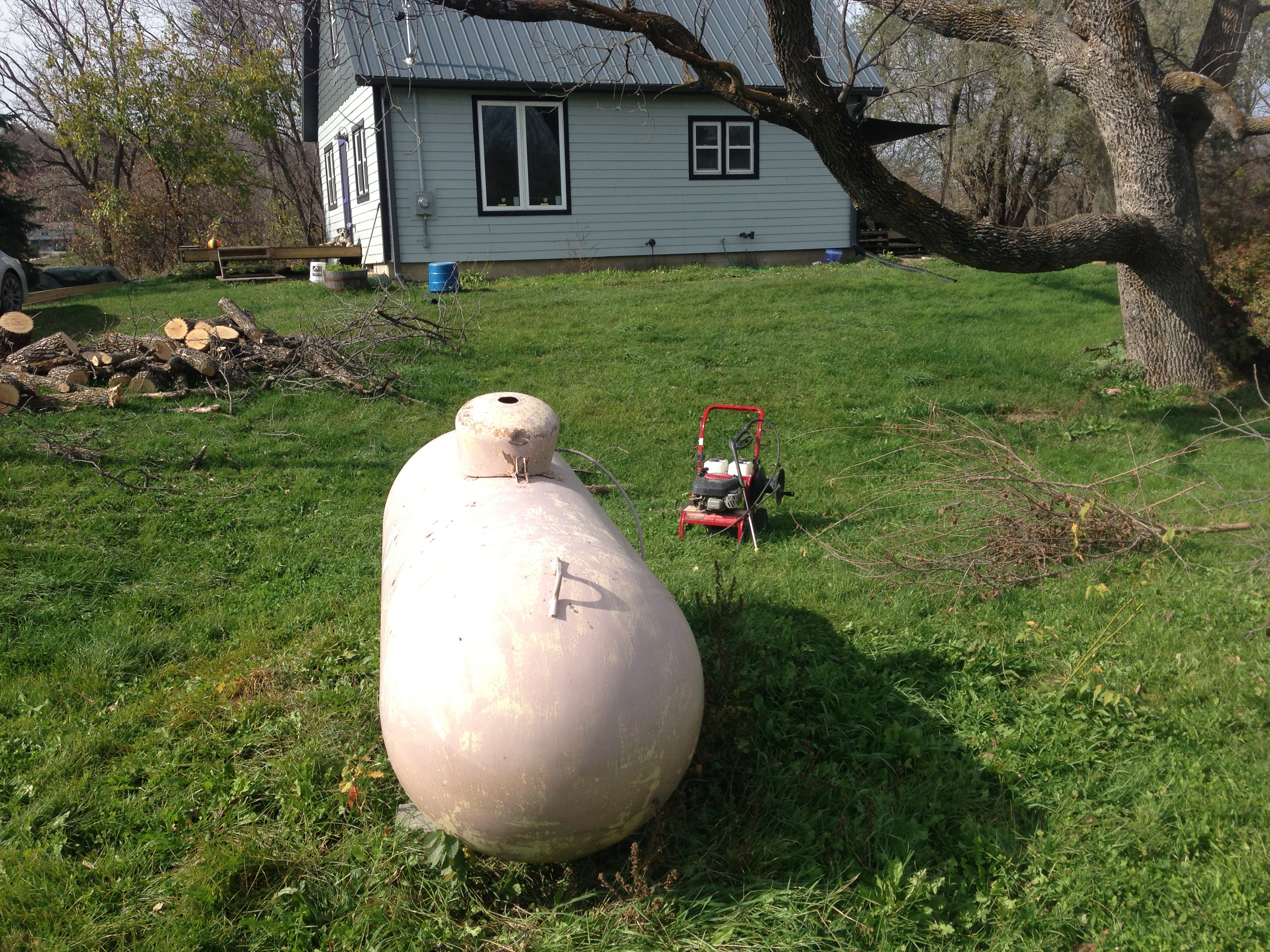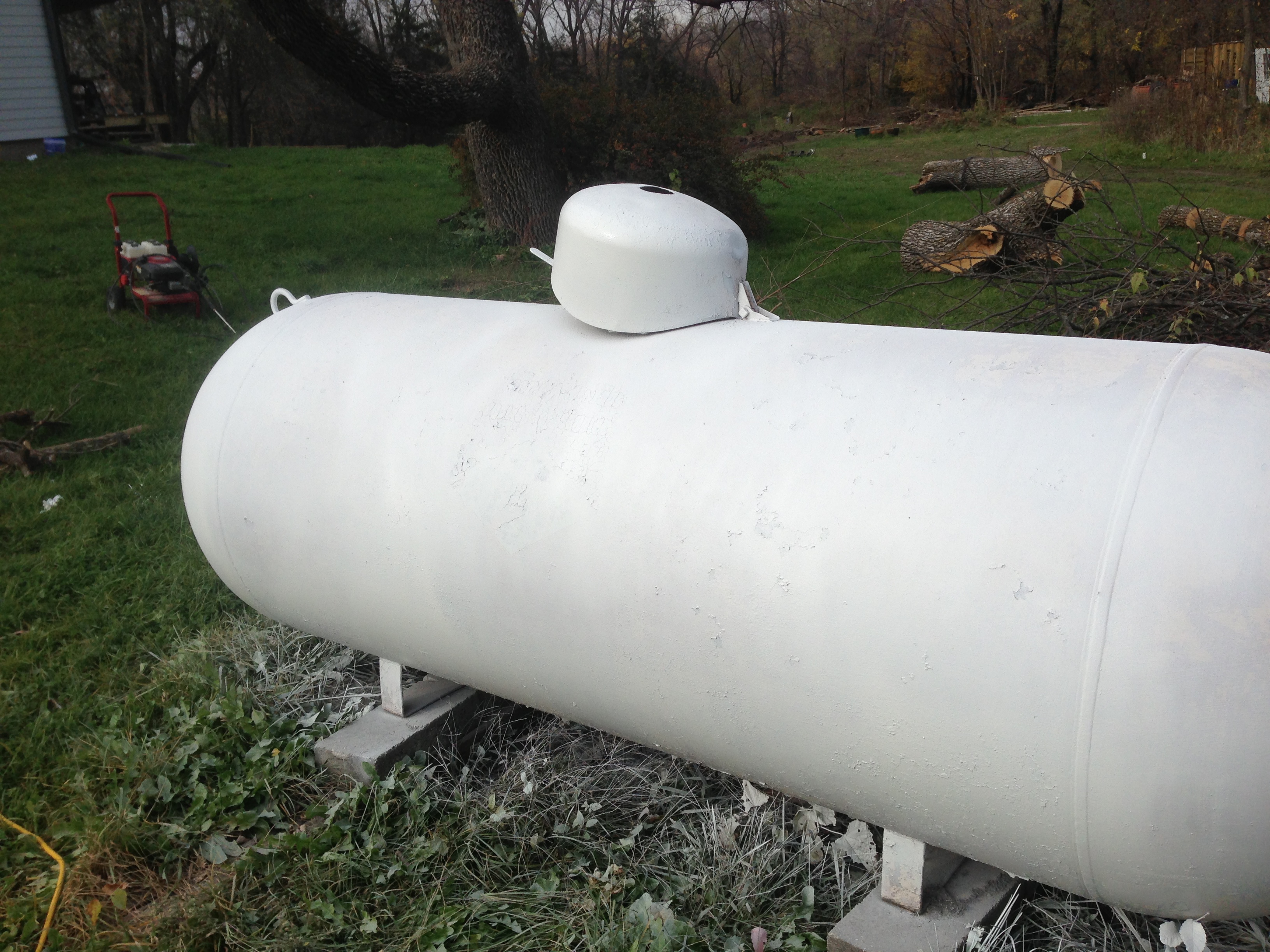 It had been a while, to say the least, since our propane tank had a good bath, much less a new paint job. The pink finish,  speckled with growths of lichen, wasn’t at all pretty and made us wonder if the tank was, at one time, disguised as a pig.