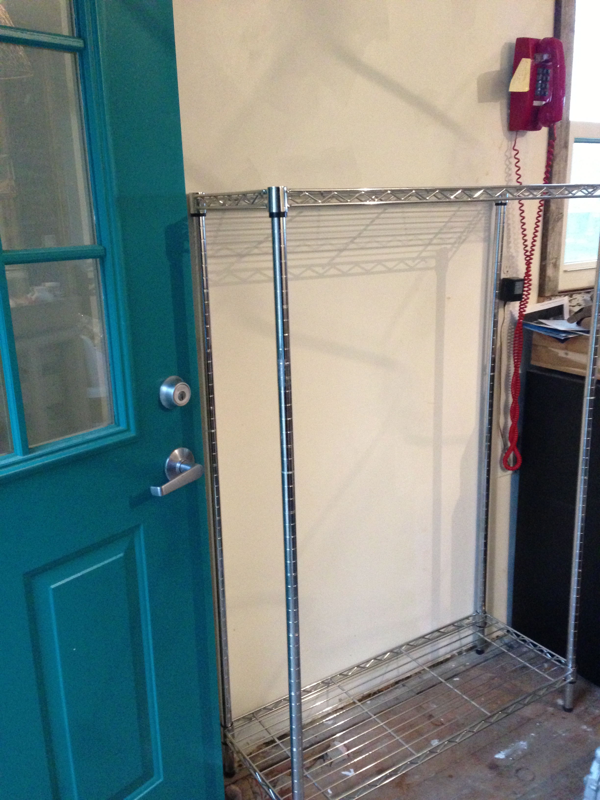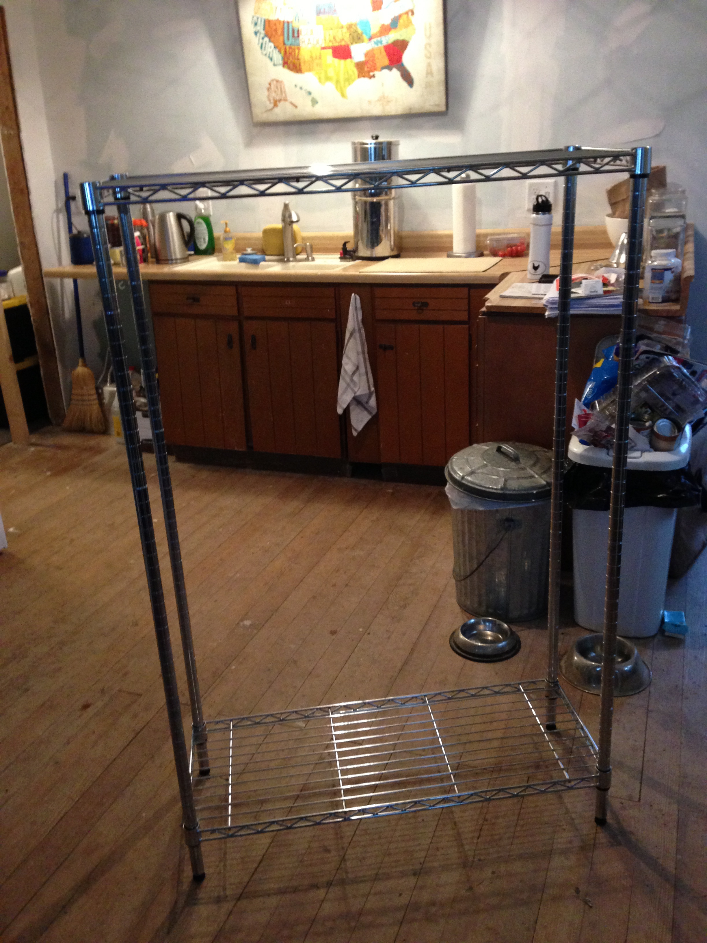 My idea was to install two shelves in the rack—one at highest setting and one at the lowest. The low shelf can be home to our “outdoor” shoes (which at this point are sporting some crazy-thick coatings of mud). The upper shelf can be outfitted with S-hooks to hold coats and  a couple of baskets and/or bags on top can be homes for gloves, scarves, and hats.
