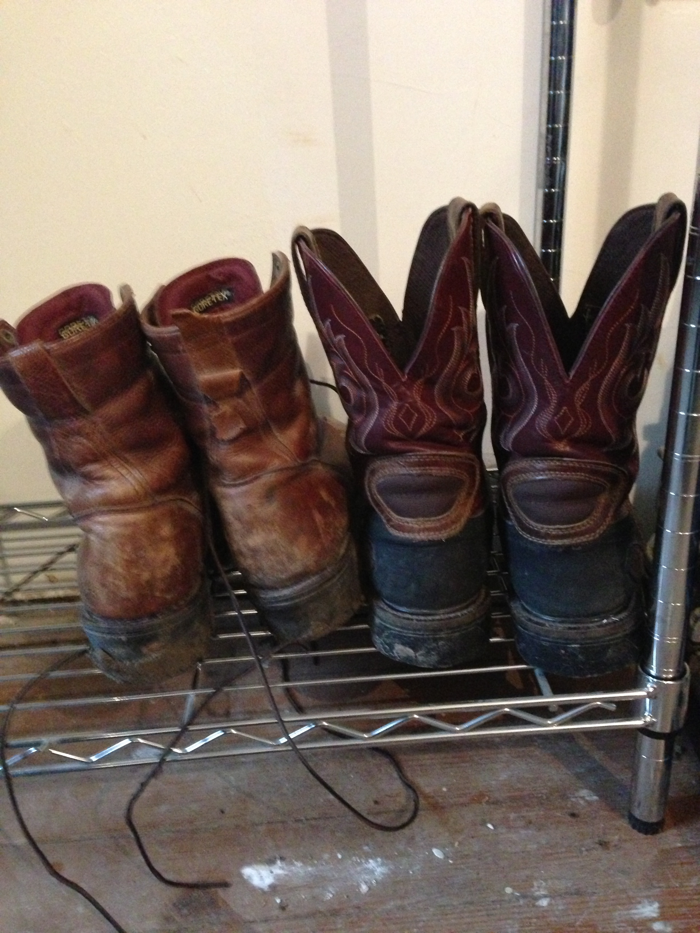 This morning, I woke up thinking about a solution to our coats-on-every-surface and boots-galore issue. For years I’ve had a stainless steel baker’s rack. I remember that when I bought it, I was concerned about the $75 price tag. It was a big deal for my budget at the time. But now, probably 15 years later, I am so thankful that I made that purchase! The 55×35-inch rack has four adjustable shelves that can be placed at any point along the vertical posts, and over the years it has been a bookcase in my office, a pantry in my kitchen, and a closet space for folded clothes. And now, it will be a hall tree at the back door!
