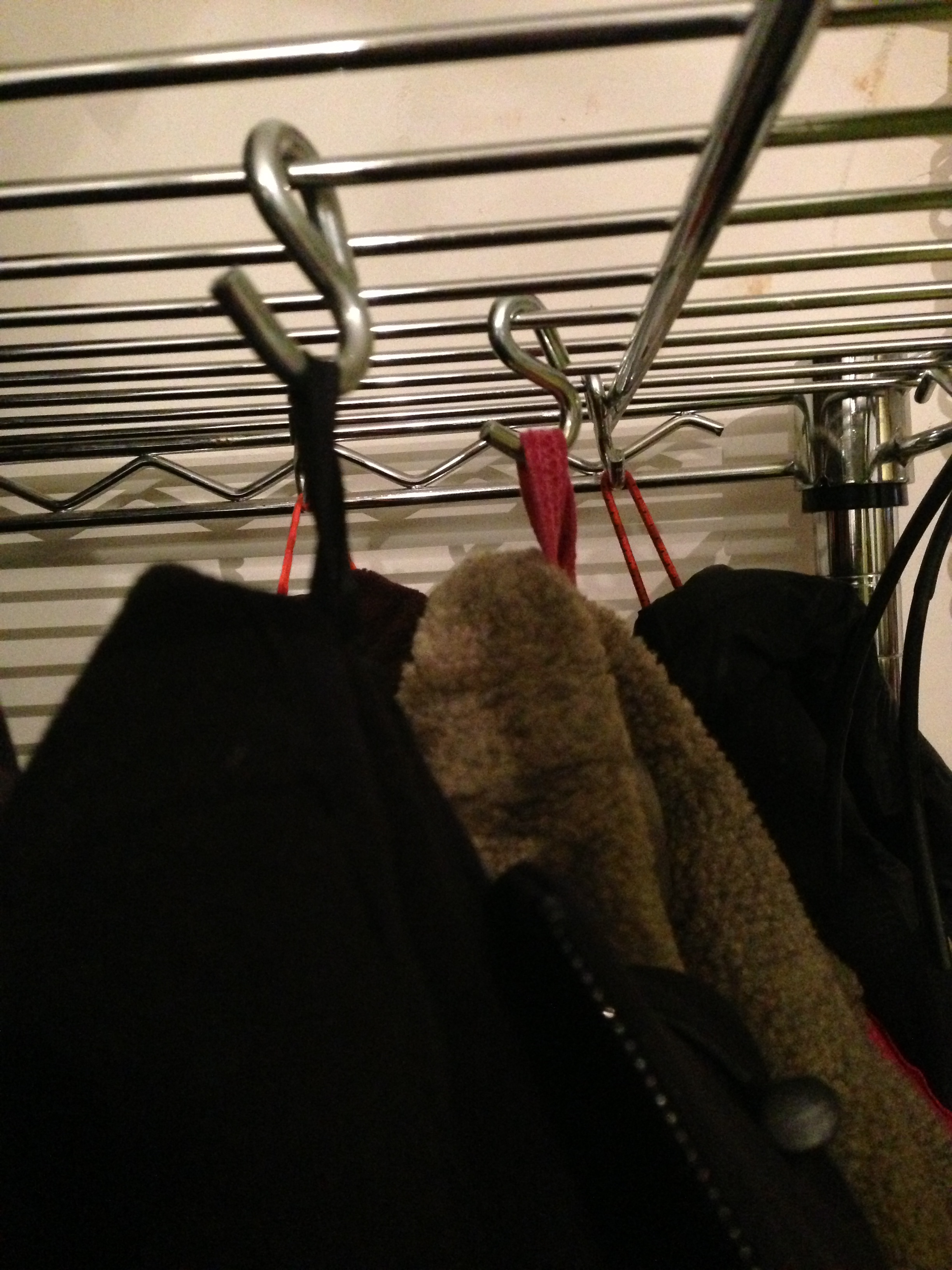 Note: We used pliers to bend the top curve of the S-hook so that the hooks won’t fall off the metal shelf when we remove our coats.