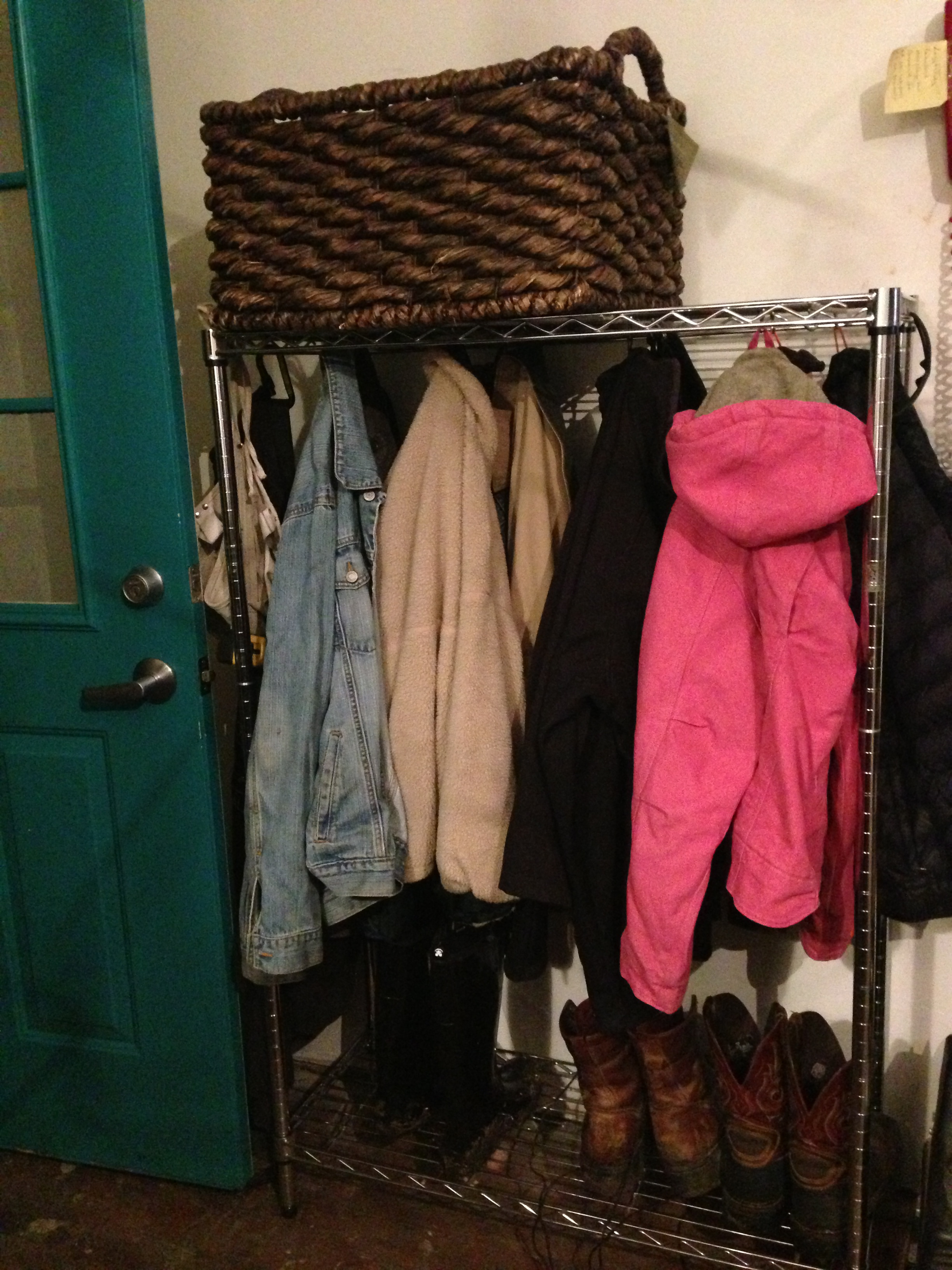 So there it is. Our coat rack. Hopefully, the one-two punch of its placement just inside the back door, and the easy-to-hang-up S-hooks (rather than high-maintenance hangers) will keep our amazing collection of outerwear off the sofa, desk, dog crate, kitchen counter, etc, etc, etc. And my hope is that this little baker’s rack makeover will satisfy my OCD and keep a meltdown at bay for at least a few more days.