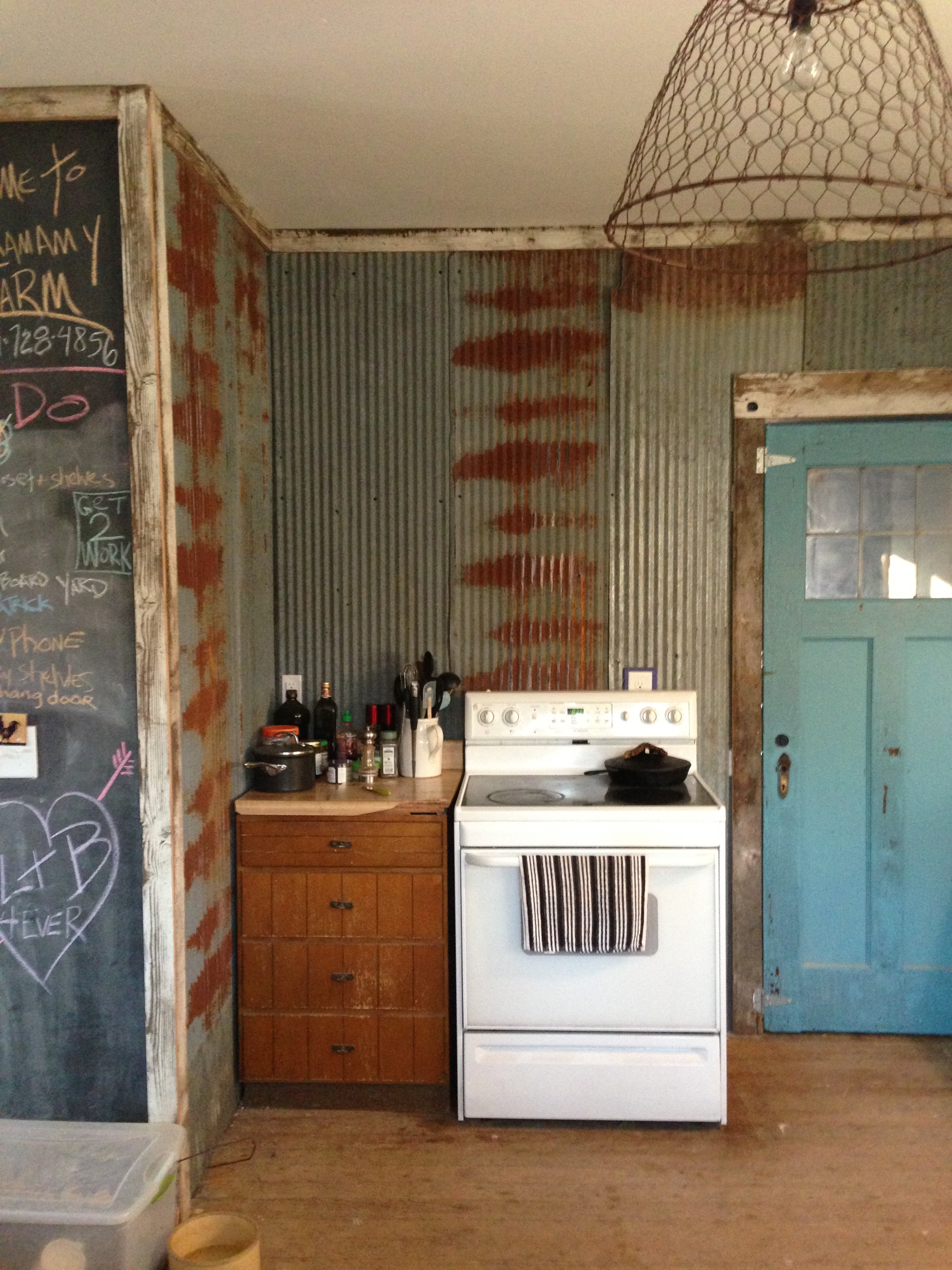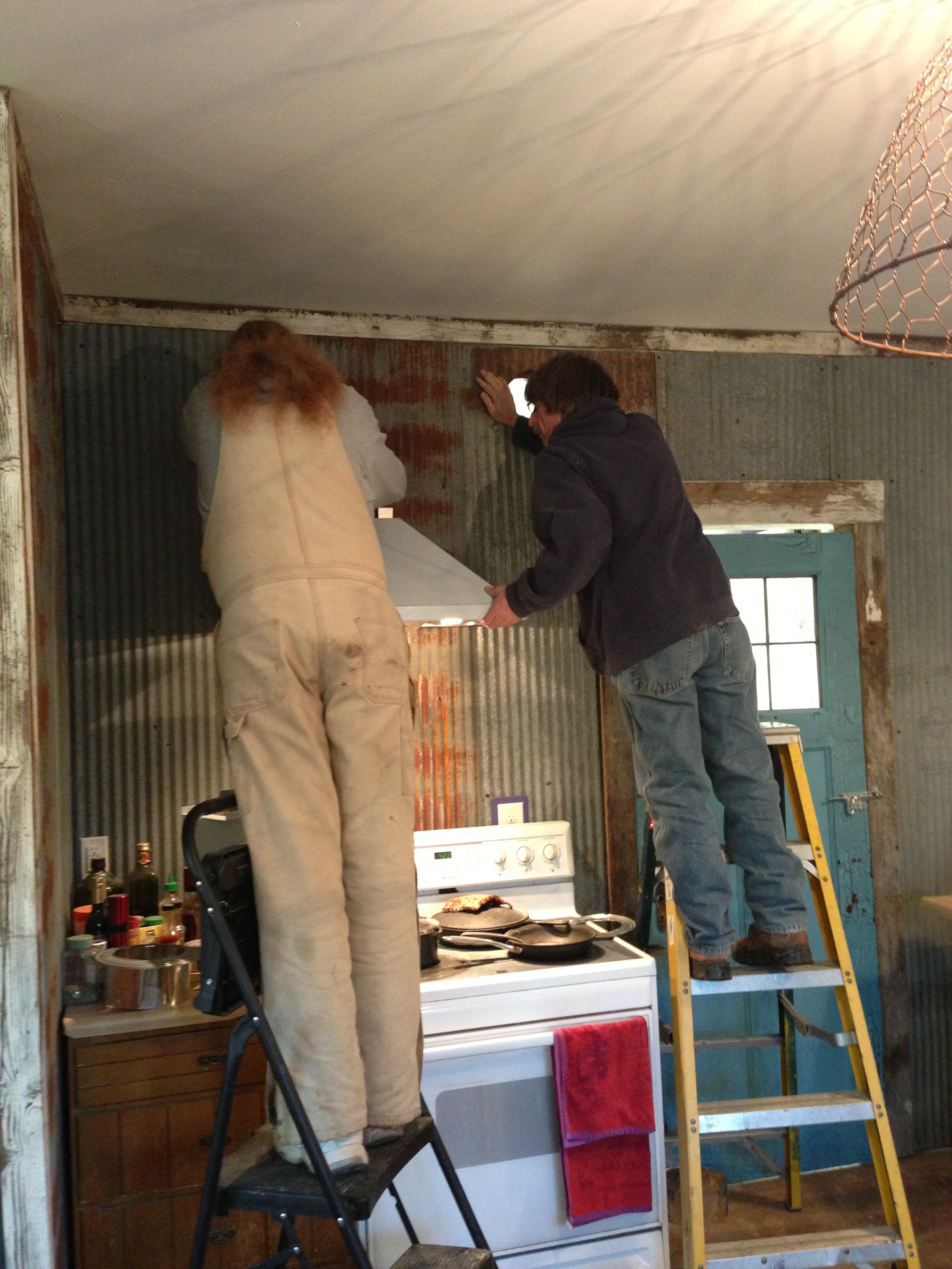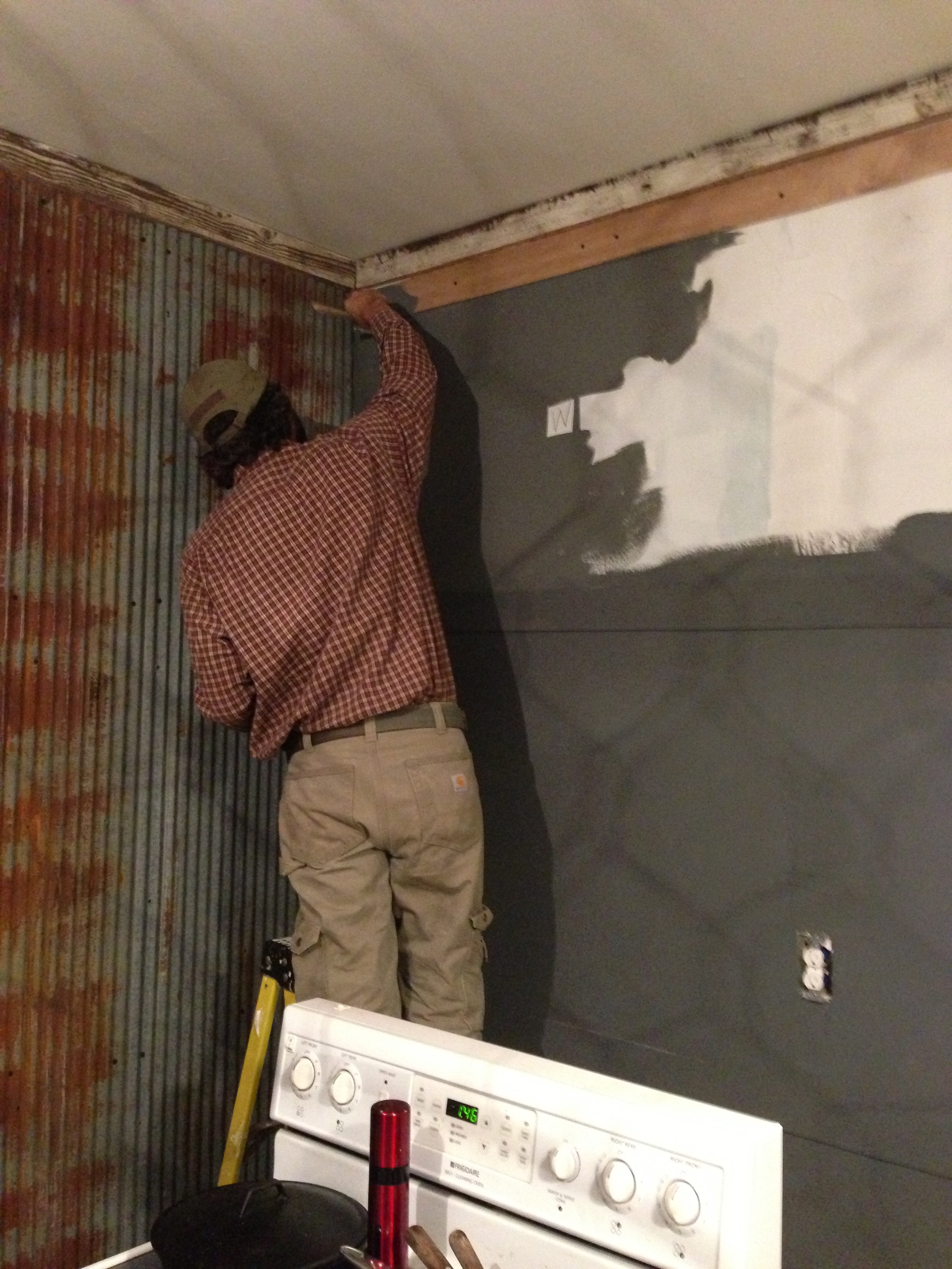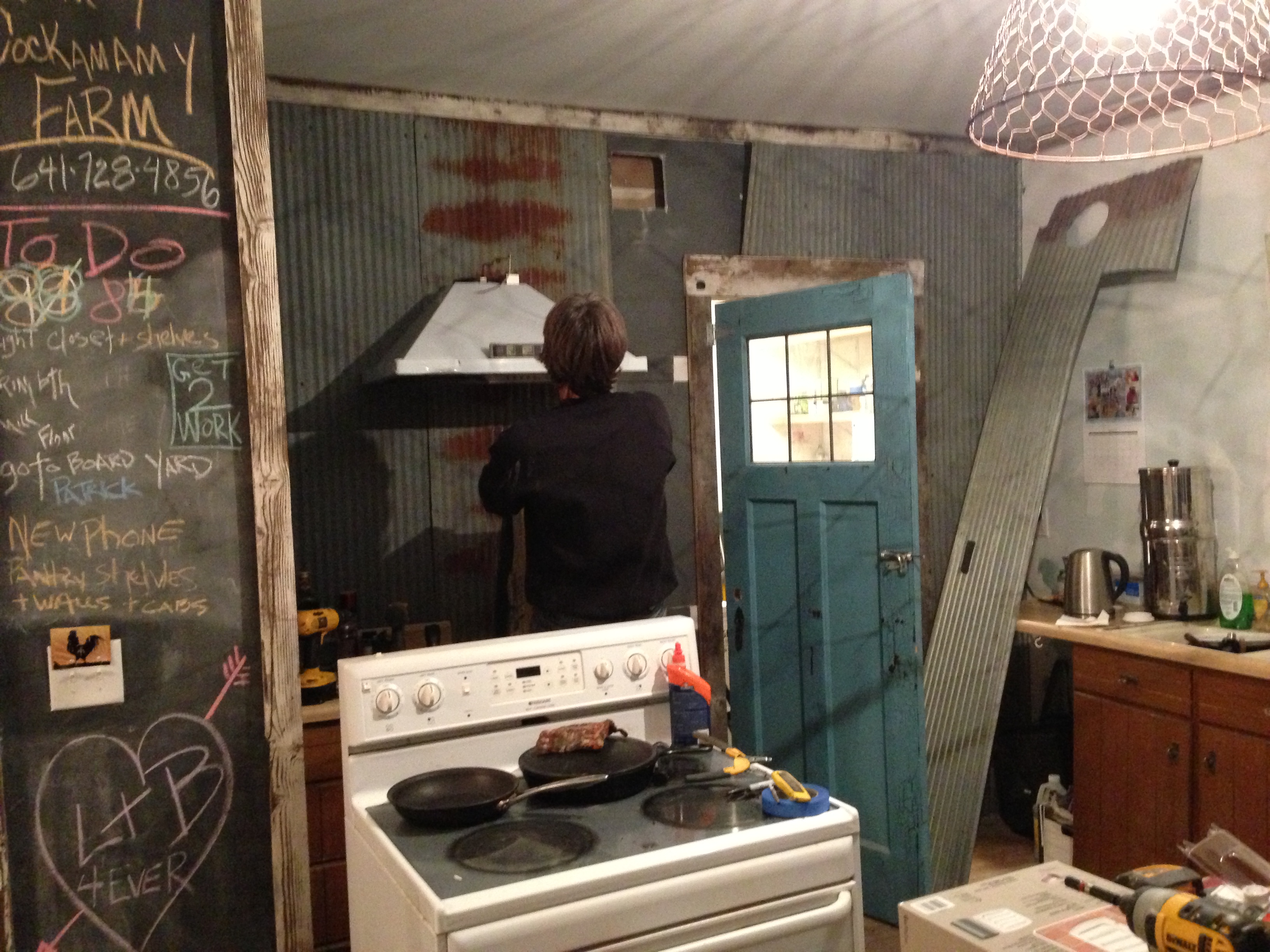 IMG_4540Thanks to a very generous neighbor who let us dig through his pile of used roof tin from an old farm building, we decided to cover the range wall (the short wall of our now L-shaped kitchen that is also home to the pantry door) in the wonderfully not-too-rusty corrugated metal. Once the first couple of pieces were up, Ben decided that the primed, white drywall behind the tin wasn’t going to work—the white was glaring through the holes and imperfections in the wall covering. So, those pieces came back down and he painted the walls and furring strips dark gray before covering the whole corner in the tin.