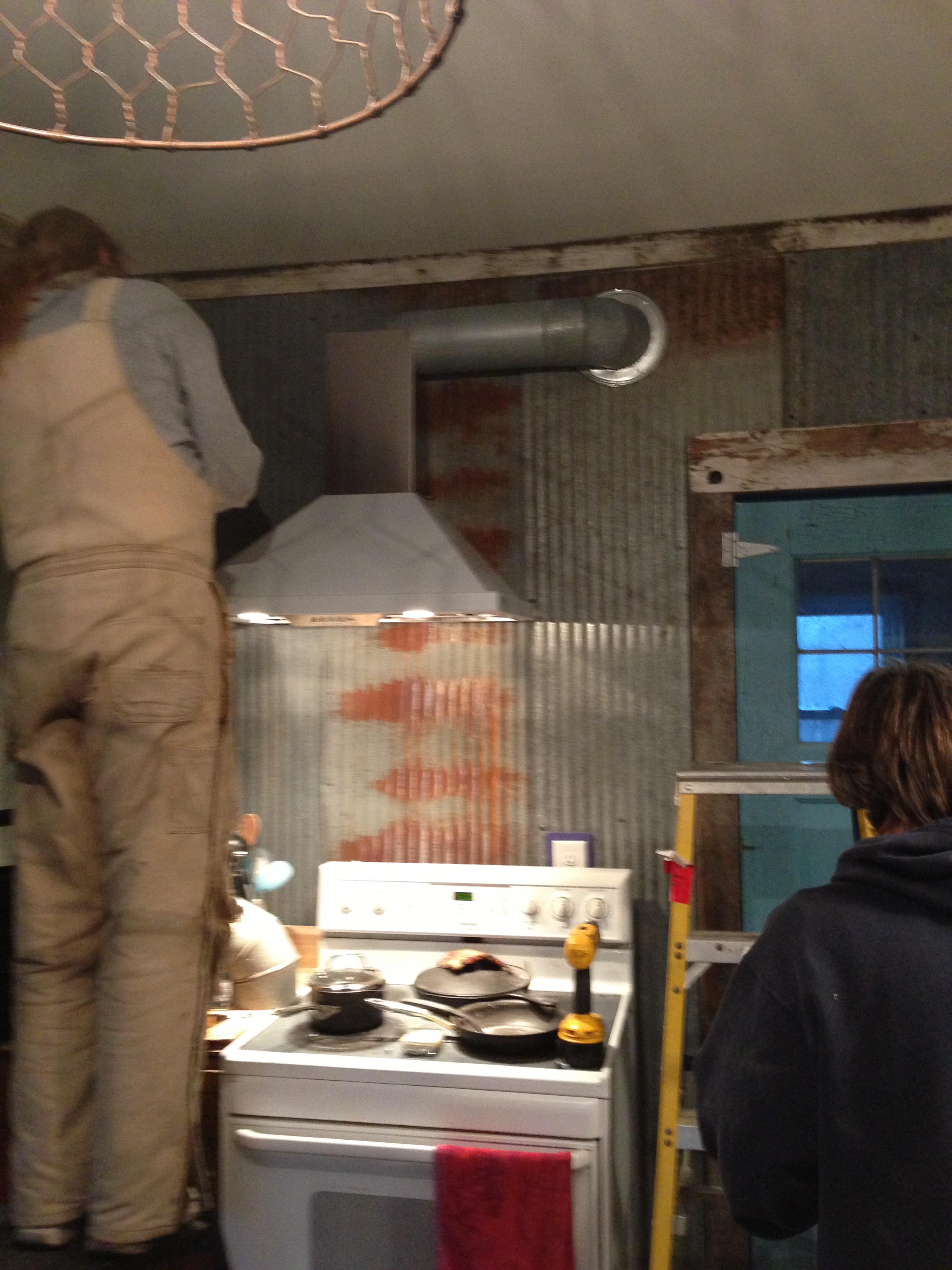 IMG_4758We decided to use left over duct work from the basement for the hood’s inner workings. The contemporary look of the hood itself continues above the appliance with a 15-inch-tall cover, but then the duct work is visible as it goes into the pantry and out the exterior wall. It looks pretty cool with the corrugated tin on the wall!