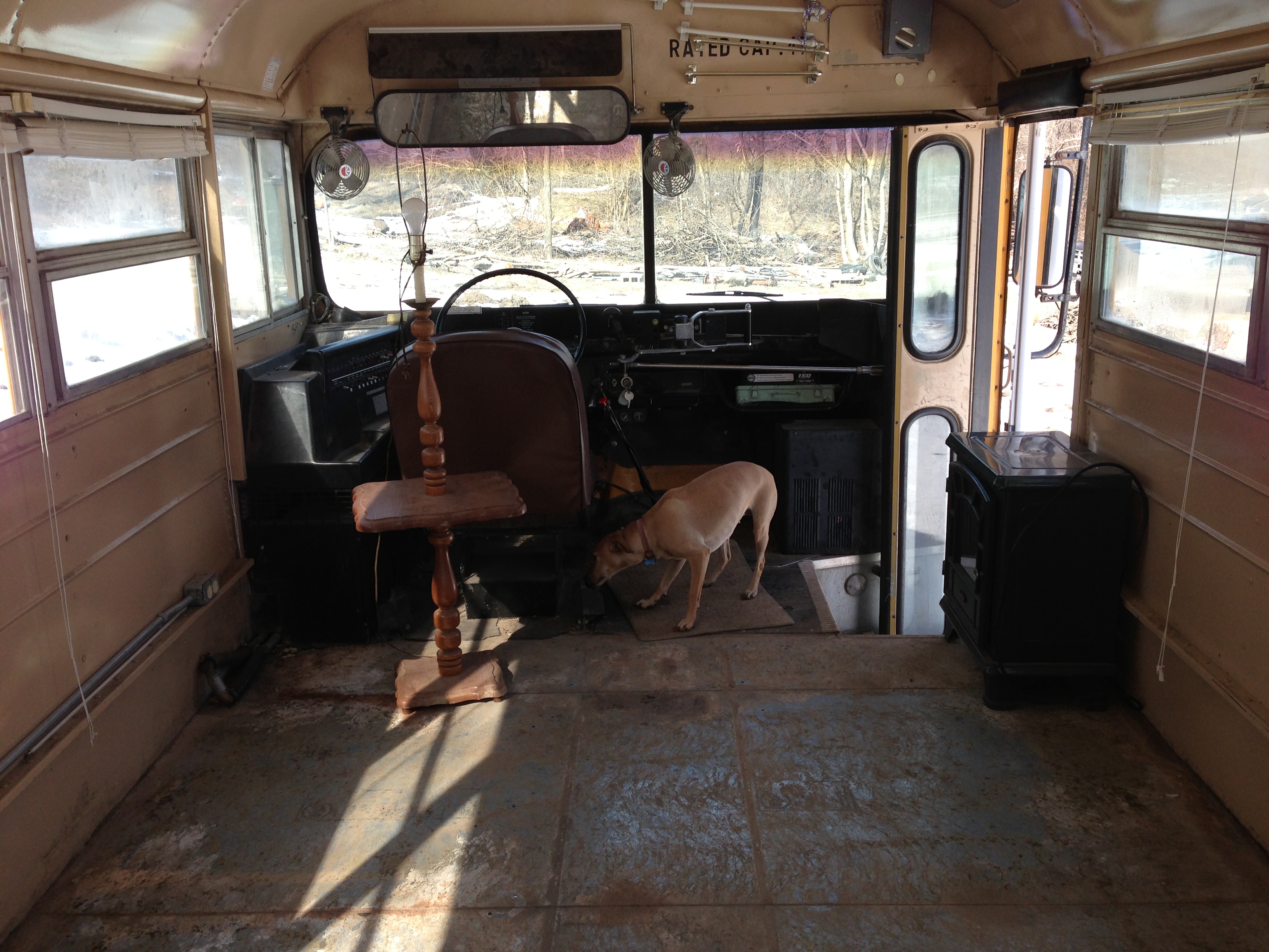We are brainstorming ideas about how to build a desk over or in place of the dashboard. I want a desk with a view and would love to have my desk chair look out over the farm’s garden through the huge windshield! No matter what we decide on the desk, I want to keep and celebrate the fun gauges and bus-ness. The door and stairway are non-negotiable. Those will remain as-is and functioning.