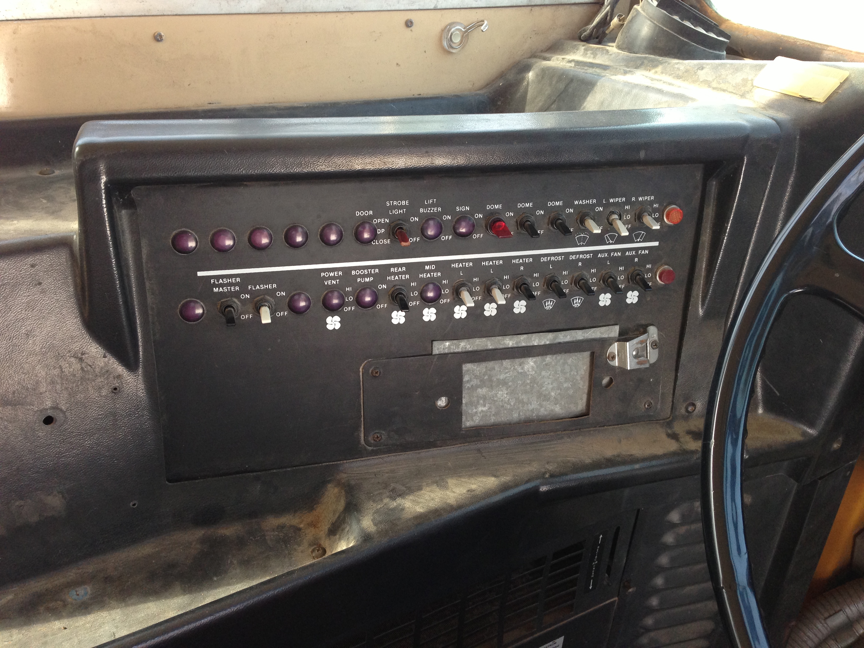 Looking toward the front of the bus (where Milly is checking things out), you see more stuff—a floor lamp (why?), and a small electric heater made to look like a wood stove—and the untouched driver’s area, complete with seat, huge rearview mirror, fans, dashboard with all kinds of switches and gauges, and the door-opening mechanism and handle. This is my favorite part! It is so similar to the bus I rode to and from school as a kid!