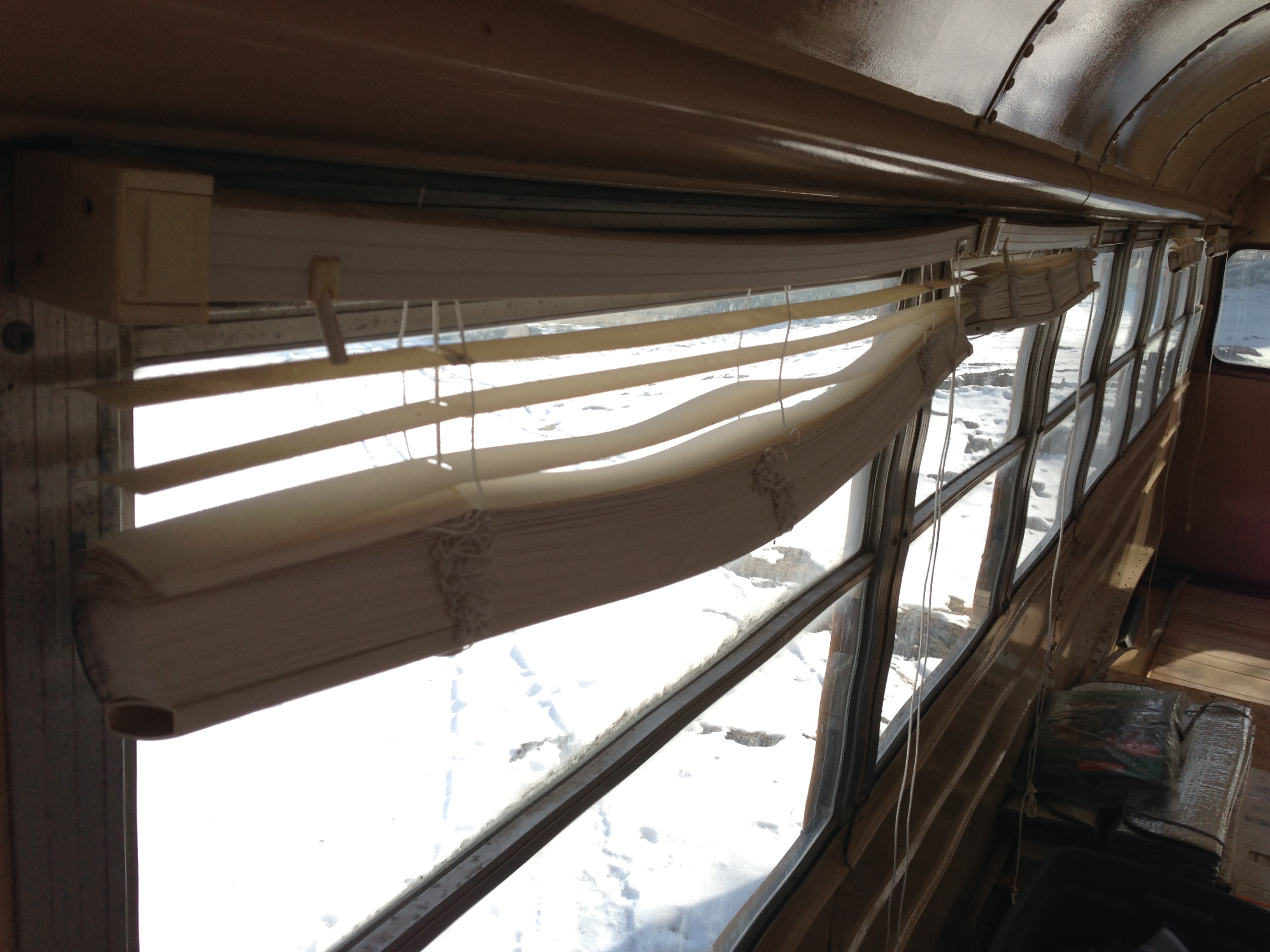 Behind the driver’s seat, the bus’s interior is just a wide-open, window-lined box—a perfect place to set up a daybed as a sofa for lounging/writing/cuddling with a laptop, a bistro table and a couple of chairs for meeting and collaborating, and low file cabinets and bookcases for storage of my many, many magazines and the necessary paperwork. The metal floor will be covered with something soft and warm—we’re discussing cork flooring or carpet squares (because the pantry/laundry flooring is awesome).