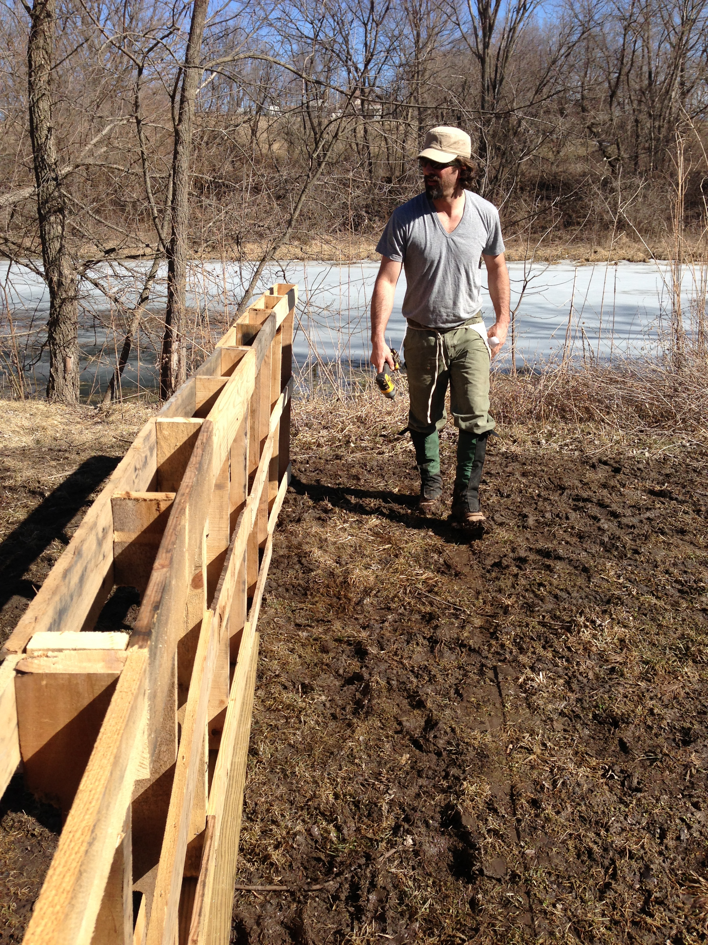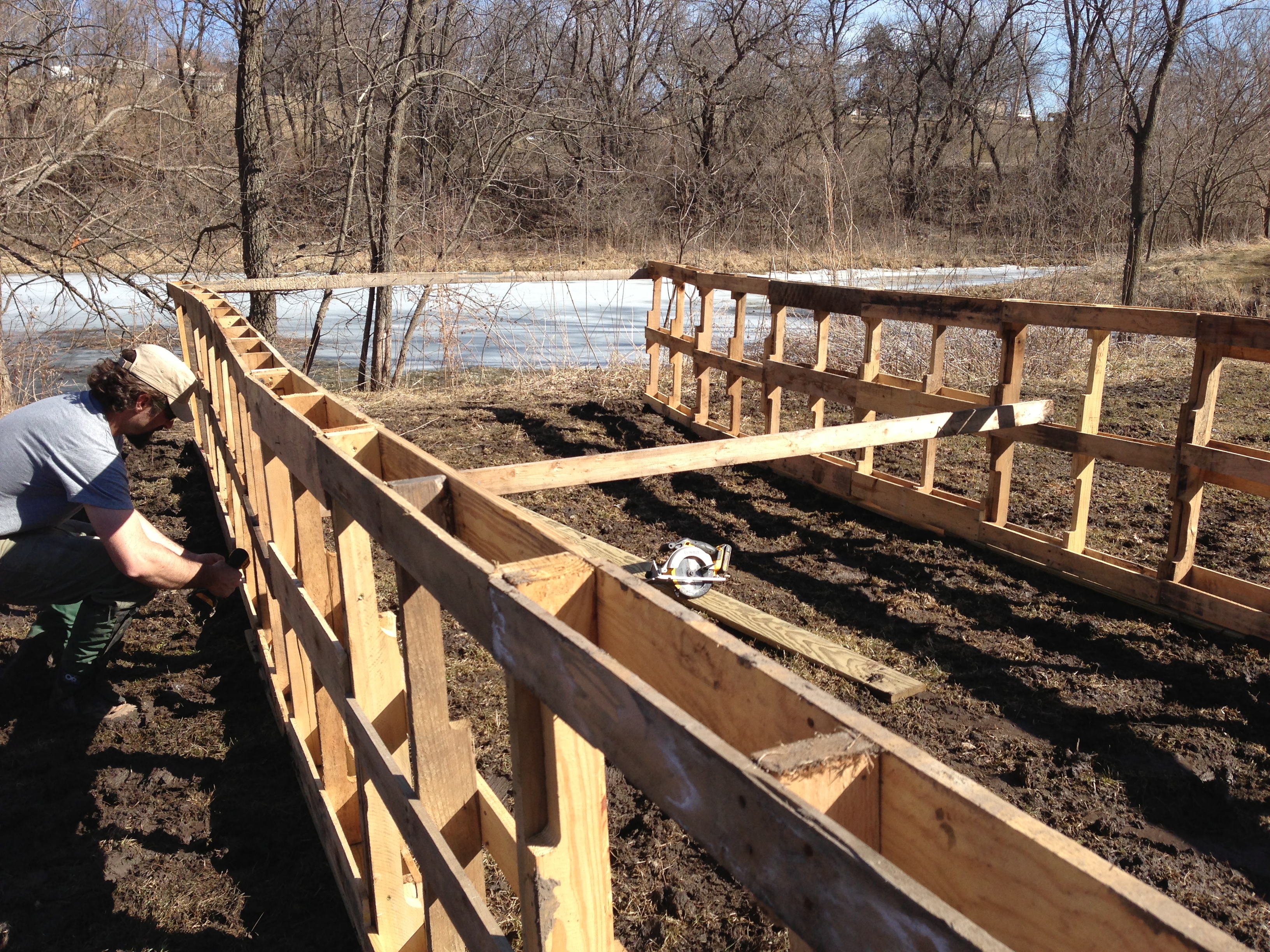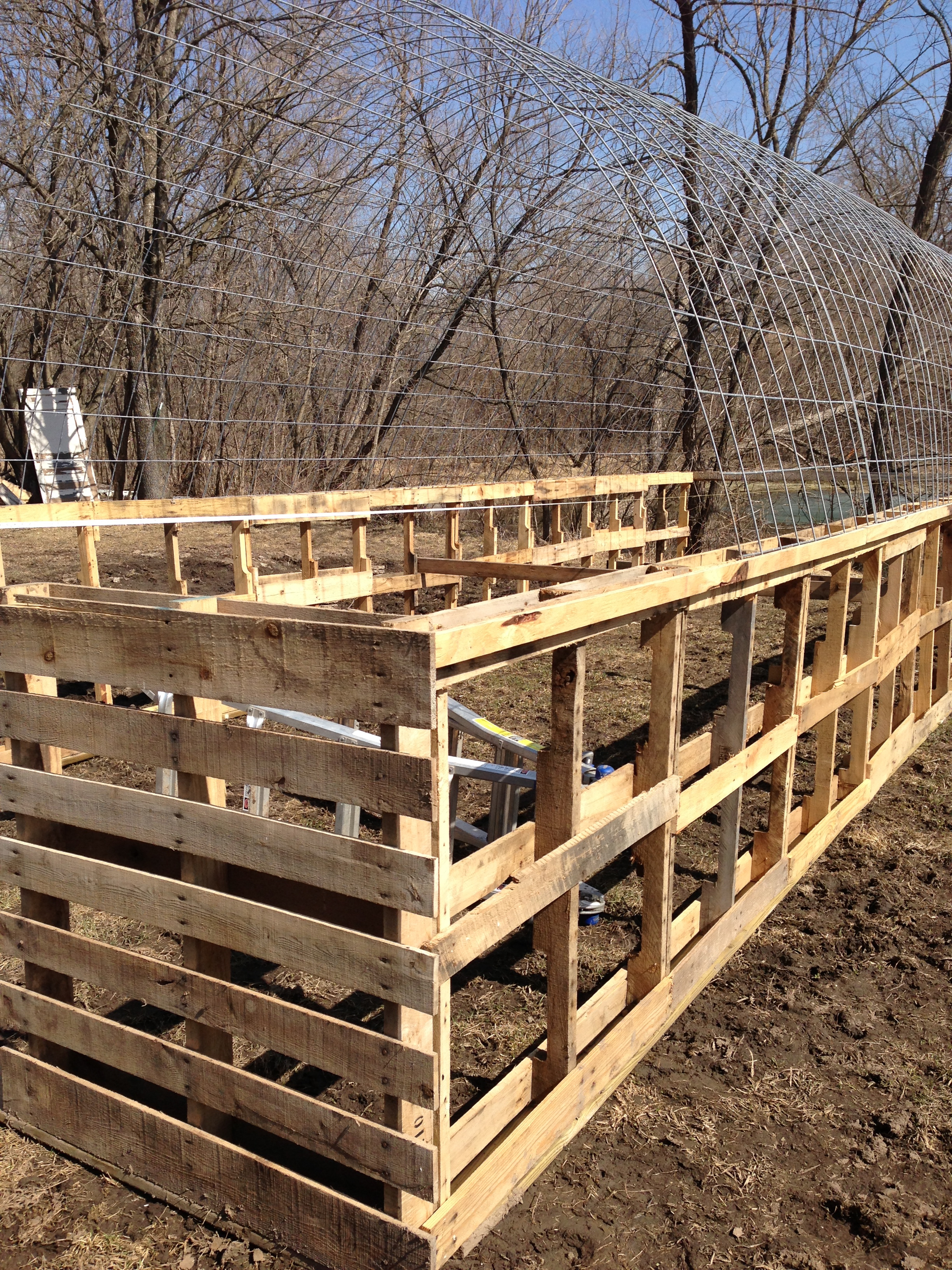 Nope, not a fence (as many of our followers suspected). Ben connected all the palettes to create parallel walls that will be the knee walls for our greenhouse. Yup, larger-than-life 10×30-feet greenhouse!
