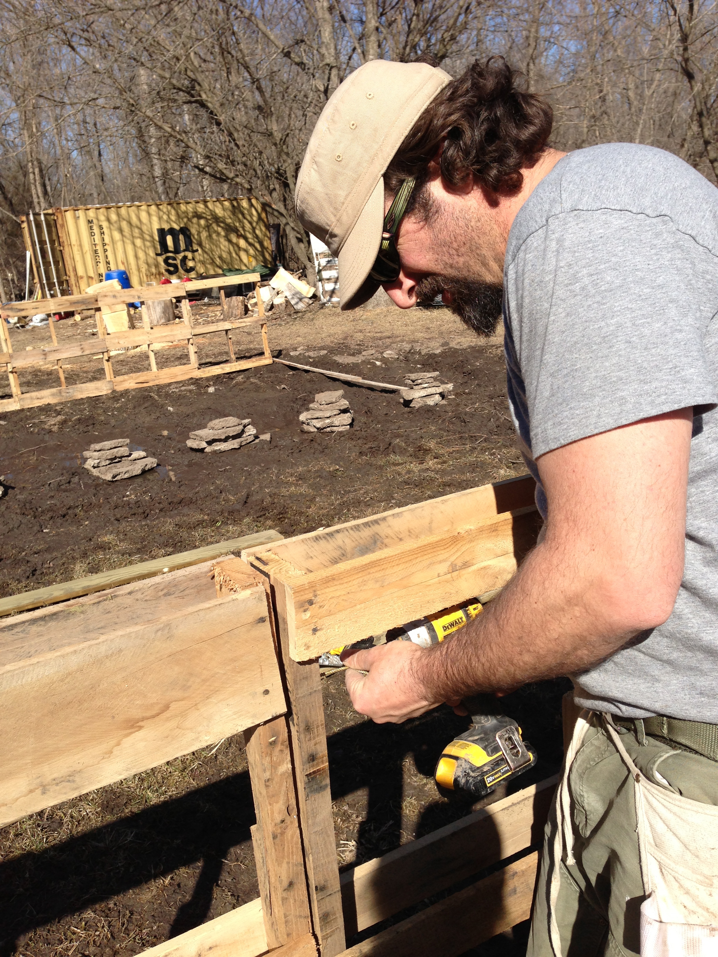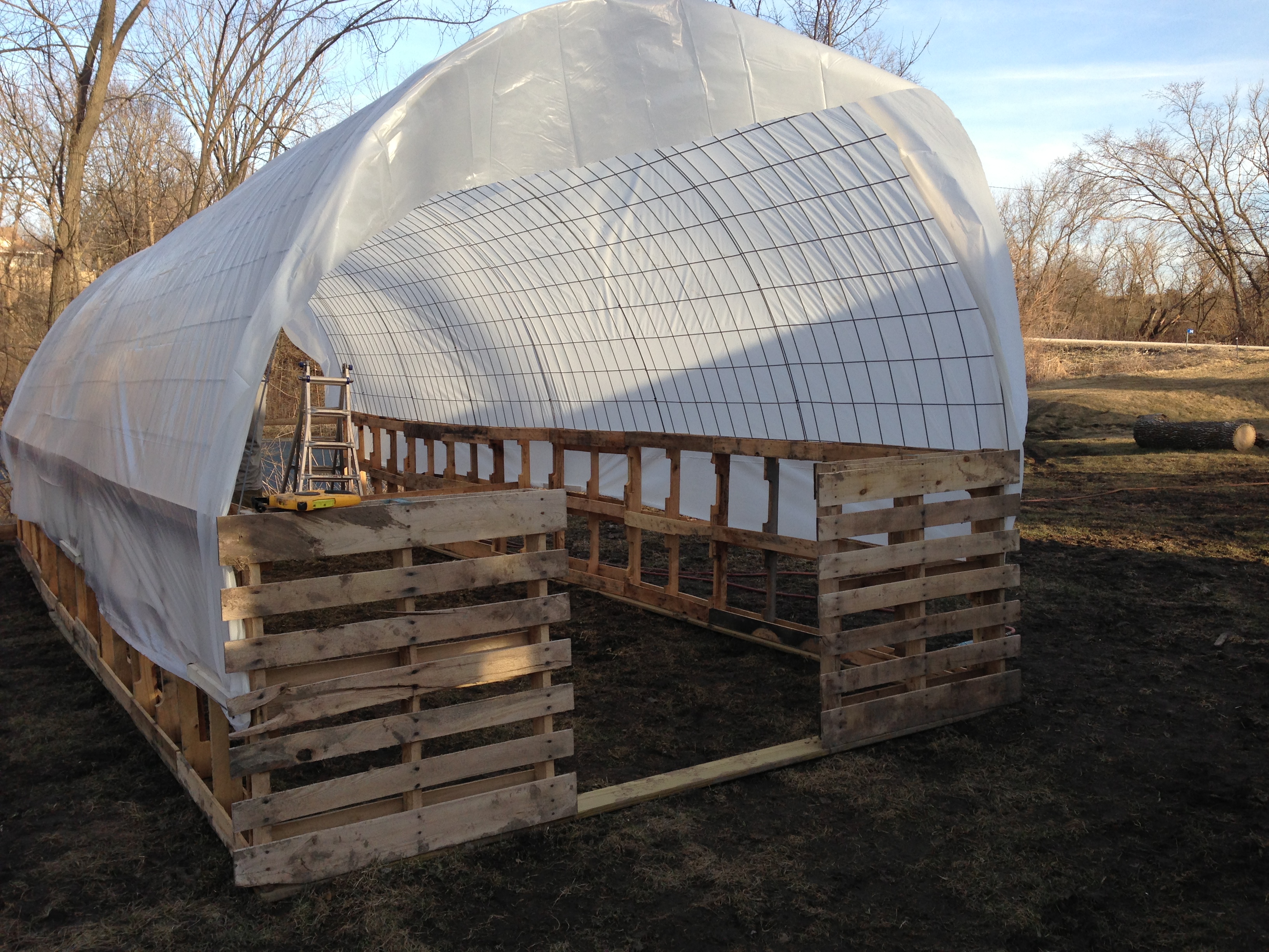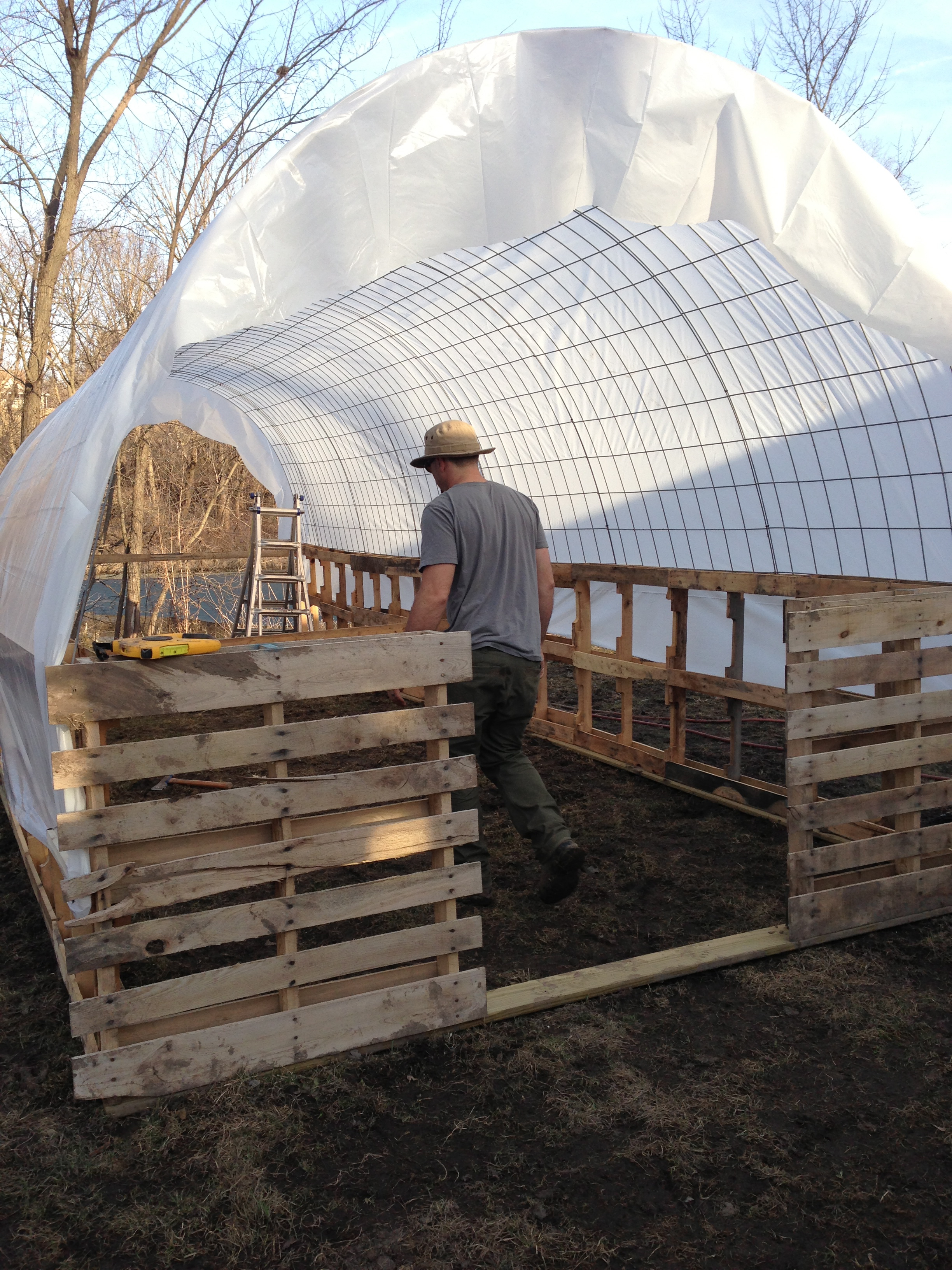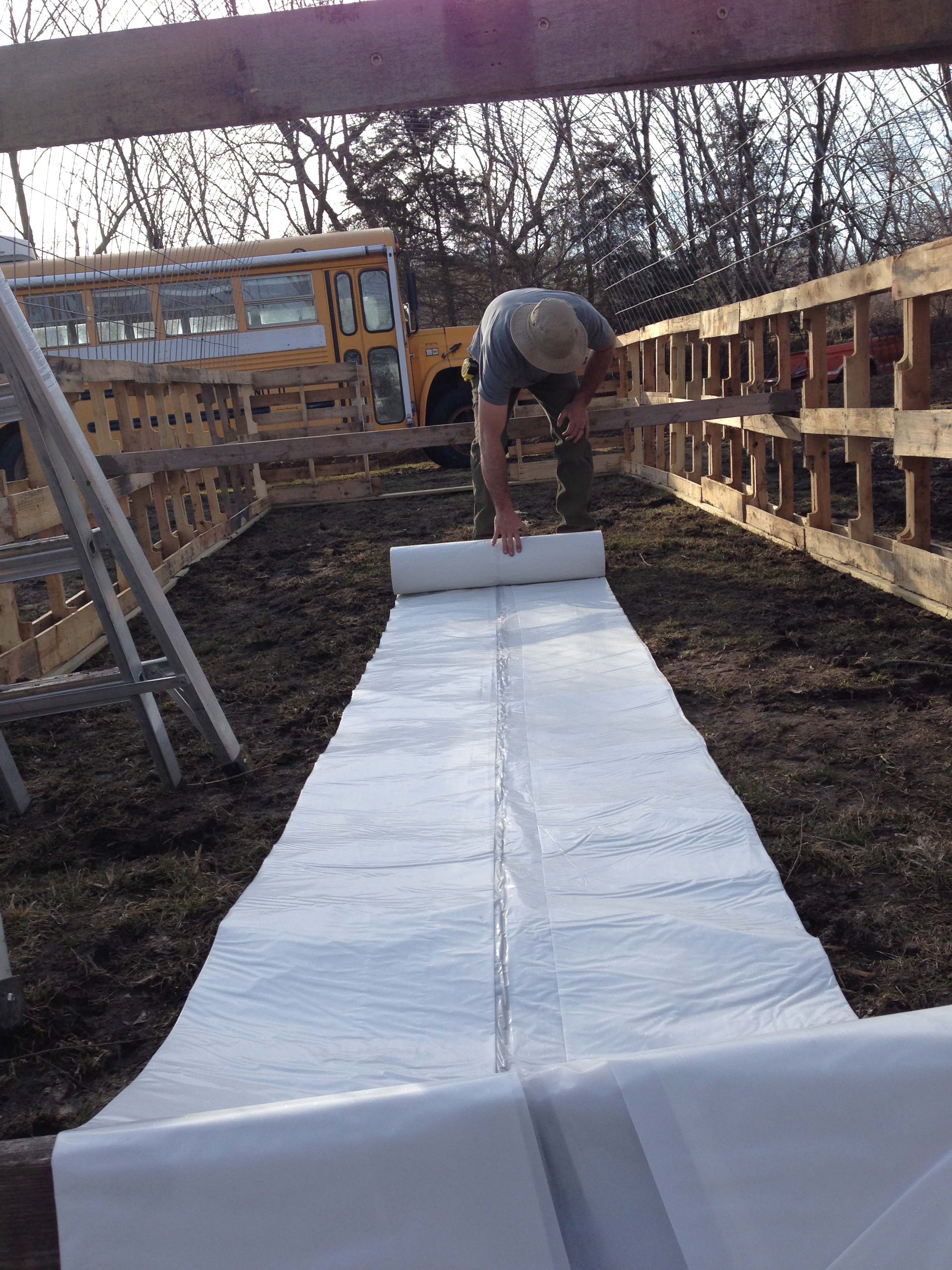 Looks good, right? Just need to add a ridge beam, secure the ends by building a wall of barnwood on the back end (closest to the pond), and adding more barnwood and a door to the end facing the bus. The open spaces along the lower sections of the palettes will be covered with additional plastic that will be able to be rolled up for ventilation when needed. We’ll be ready to start some seeds in our new greenhouse in just a few days!