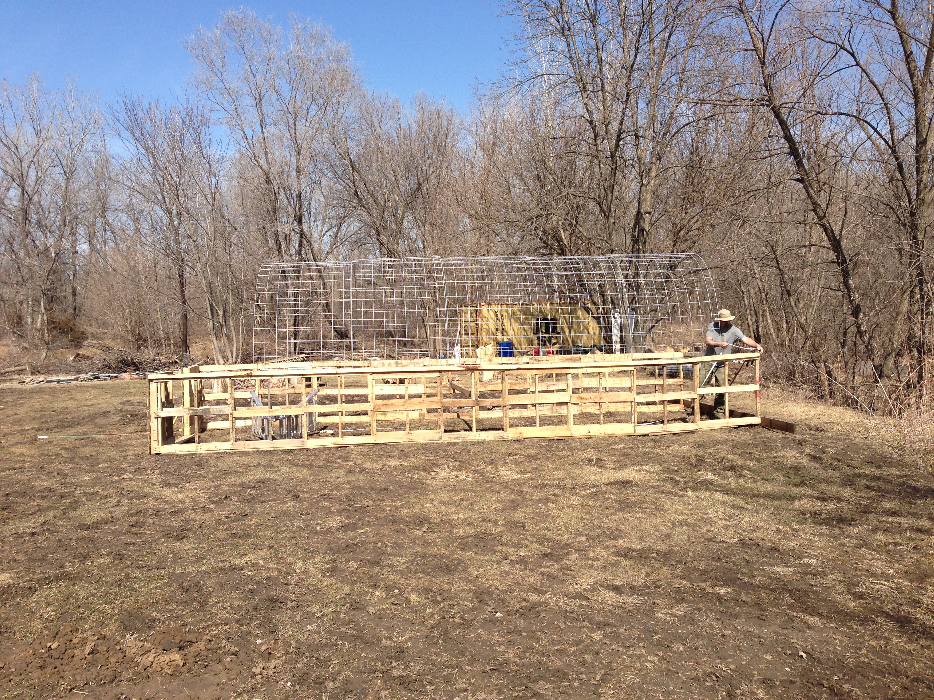 Once the walls were parallel, square, and set, Ben added a sort of cleat or gusset along the top edge of each palette wall, using 2-inch and 1-inch strips of plywood glued and screwed into place, to hold the edges of 4×8-foot hog fence panels. As we placed each panel, we would place one edge into the lip/cleat/gusset on one wall and bend the panel upwards into a half-circle until we were able to push the opposite end into the lip/cleat/gusset on the opposite wall, resulting in a 9-foot-tall structure.