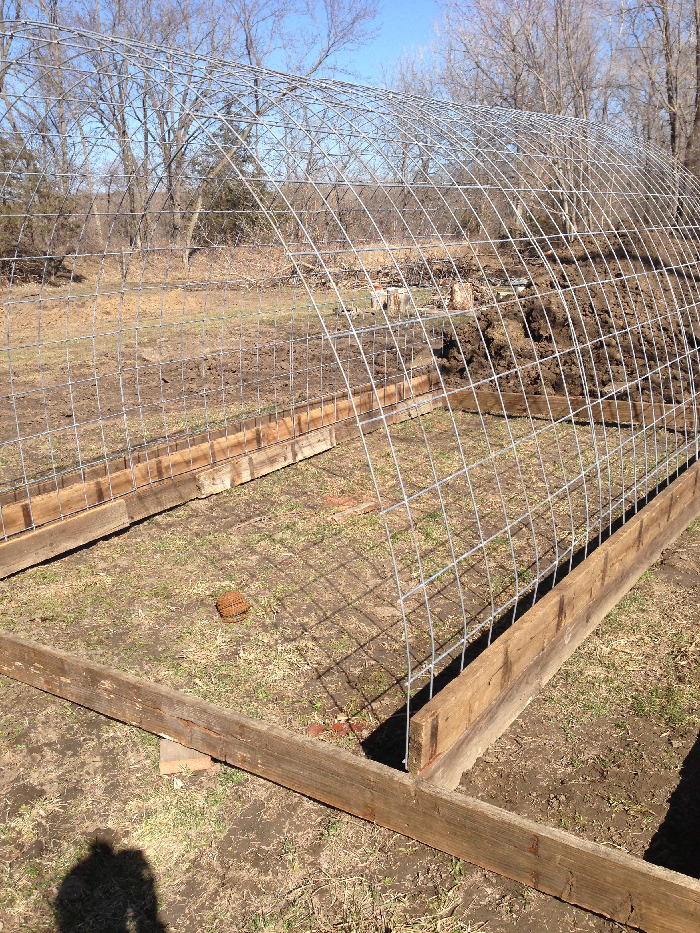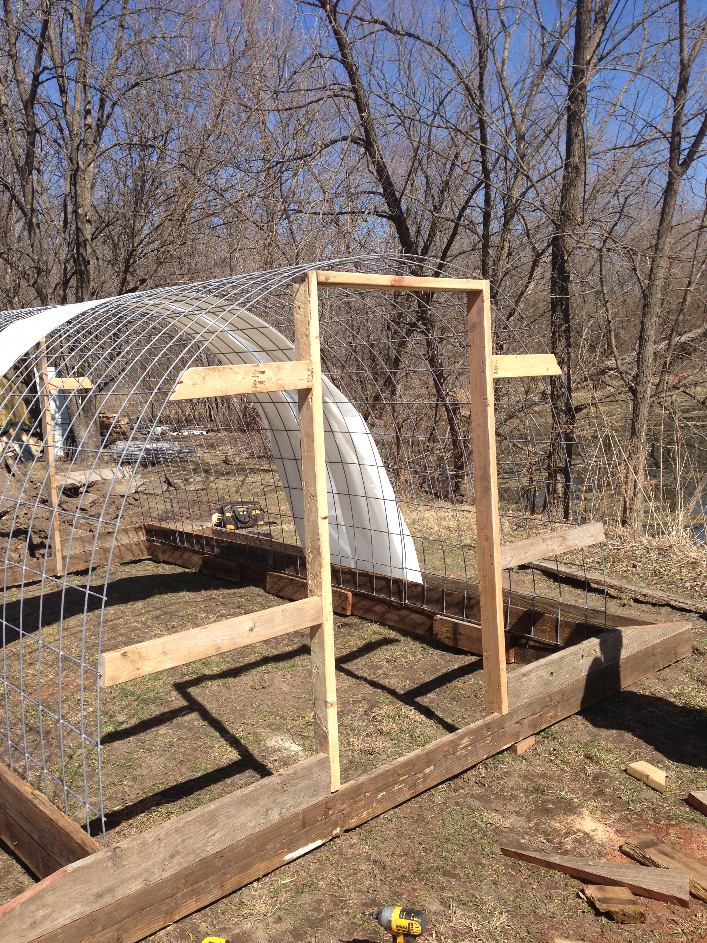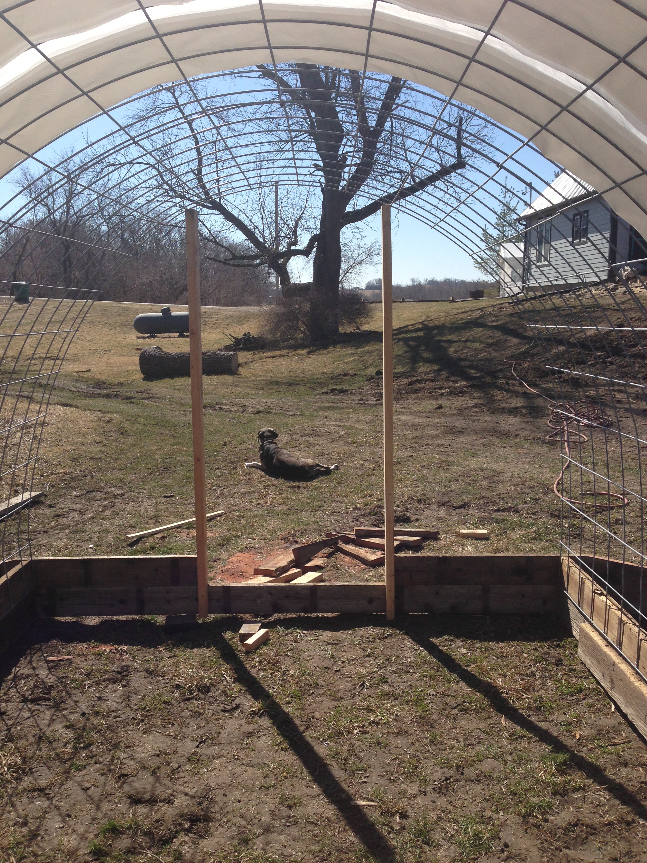 And here it is! Greenhouse, take two. We decided the hoop’s height was a major problem on Plan A, so we ditched the palette knee walls and decided to take the hog fence panel almost to the ground. This baby is only 6 feet tall and measures 8×15 feet. The wooden frame is built from reclaimed redwood that had a former life as Ben’s parents’ back deck. Ben designed the structure so that the hoop house has long raised beds down either side.IMG_5125Once the hoop was in place, we worked on framing out the ends (lesson learned, see above) to give the structure some heft and reinforcement of its half-round shape. We framed 36-inch-wide doors on both ends, and girders on either side of each door.