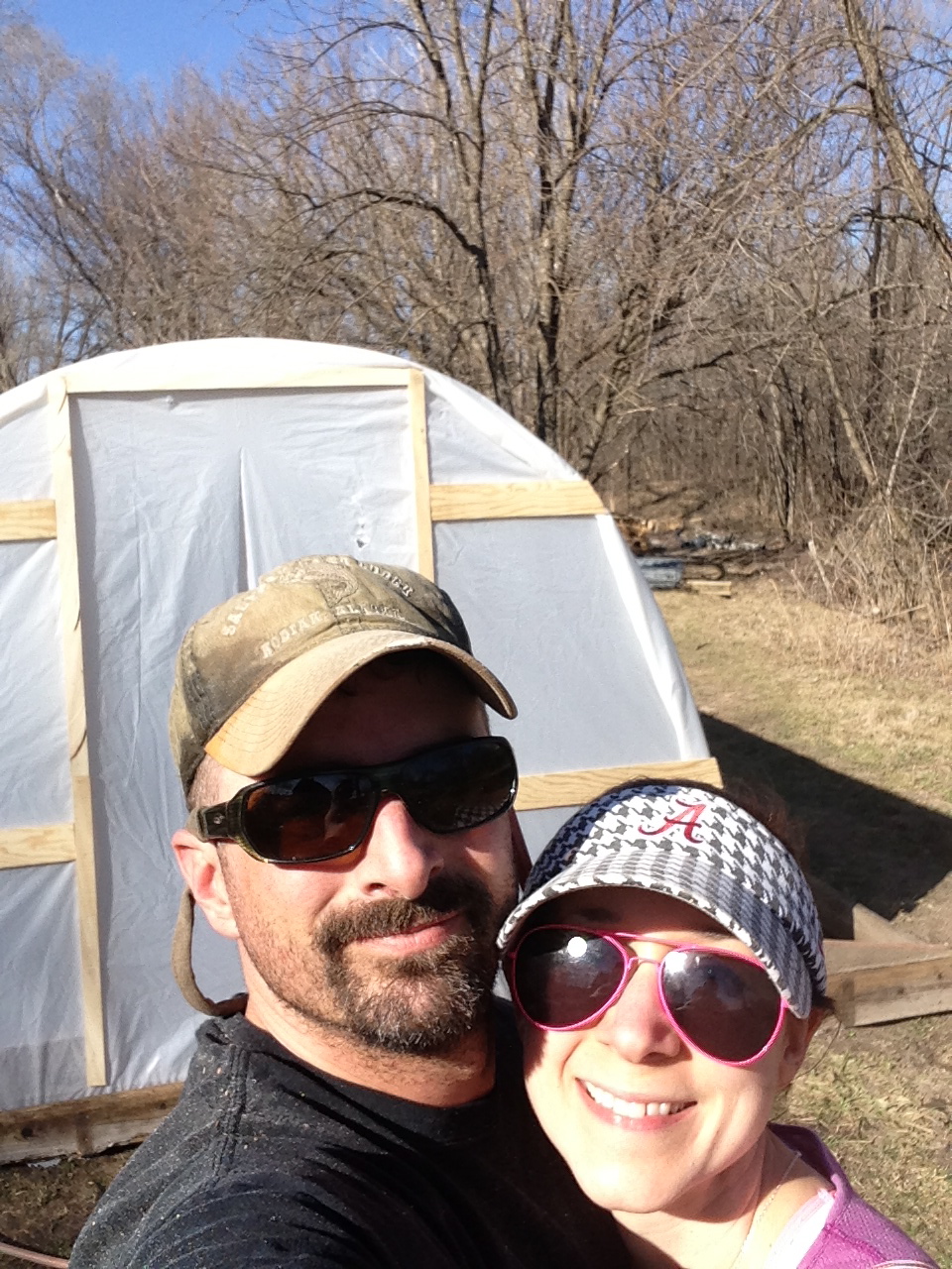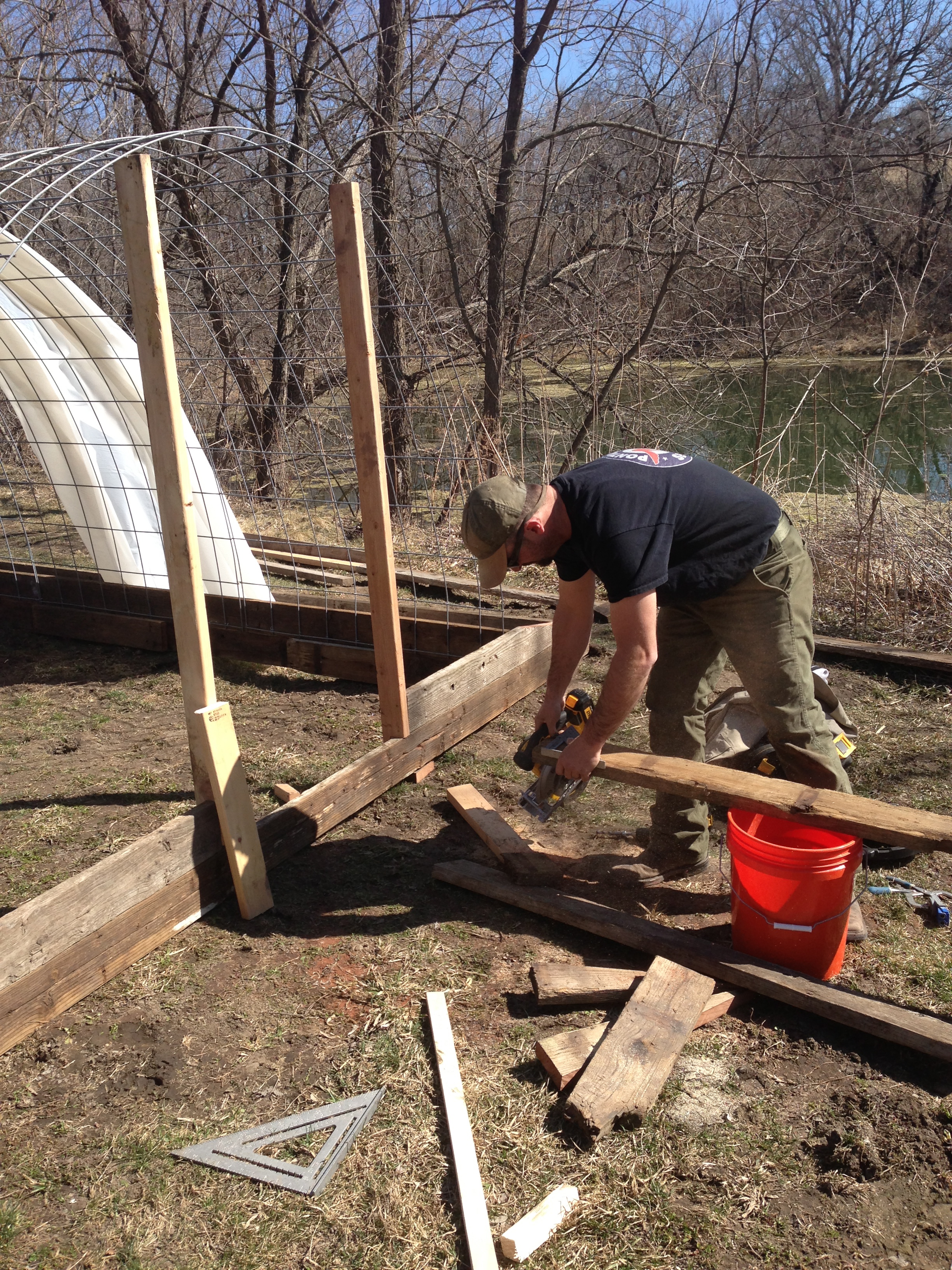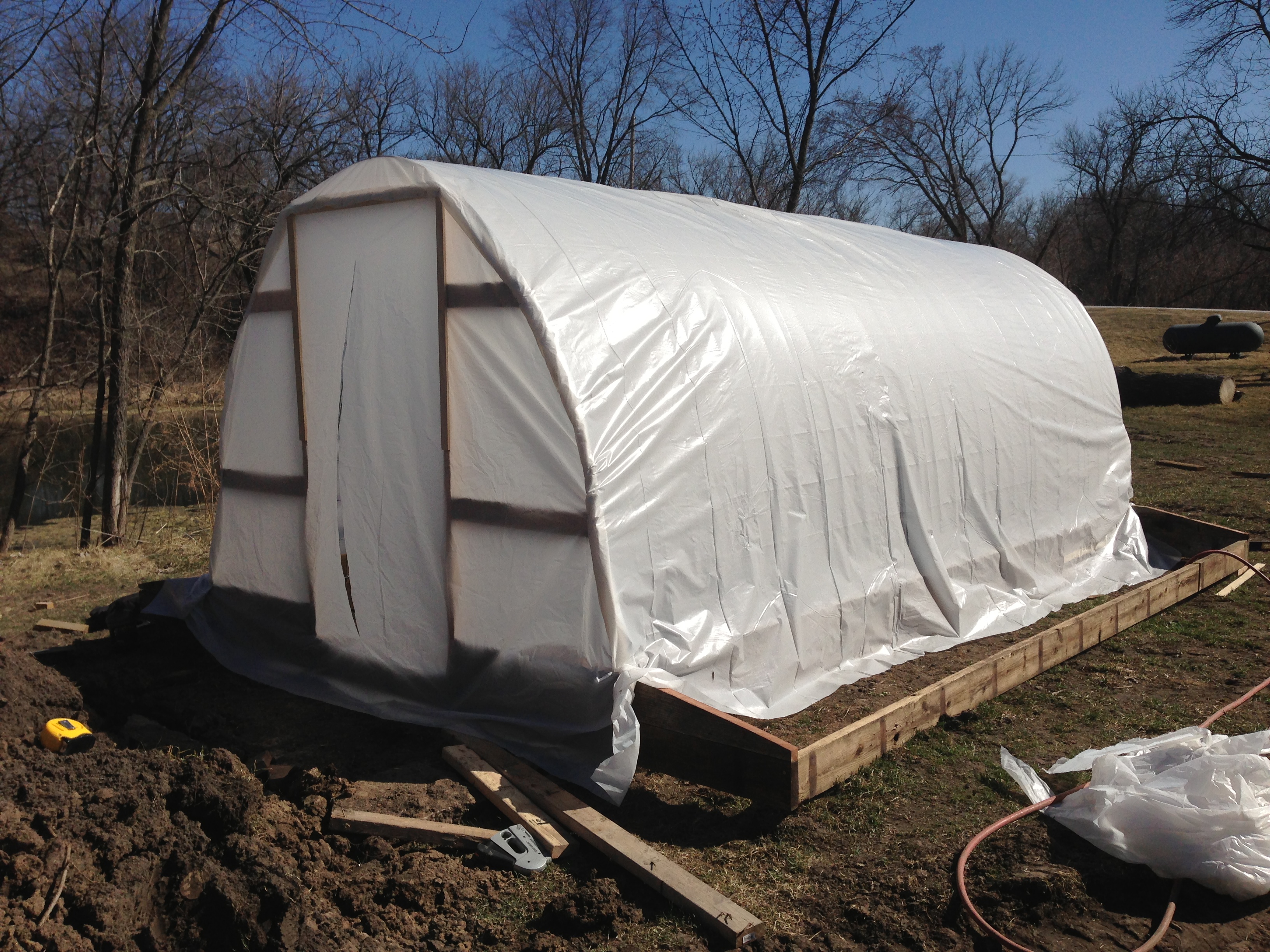 A full day’s work is done and it’s quitting time! We still need to build the doors (simple frames covered with plastic) and install a ridge beam, but it has been several days and Plan B is still standing. With any luck, we’ll be starting seeds soon!