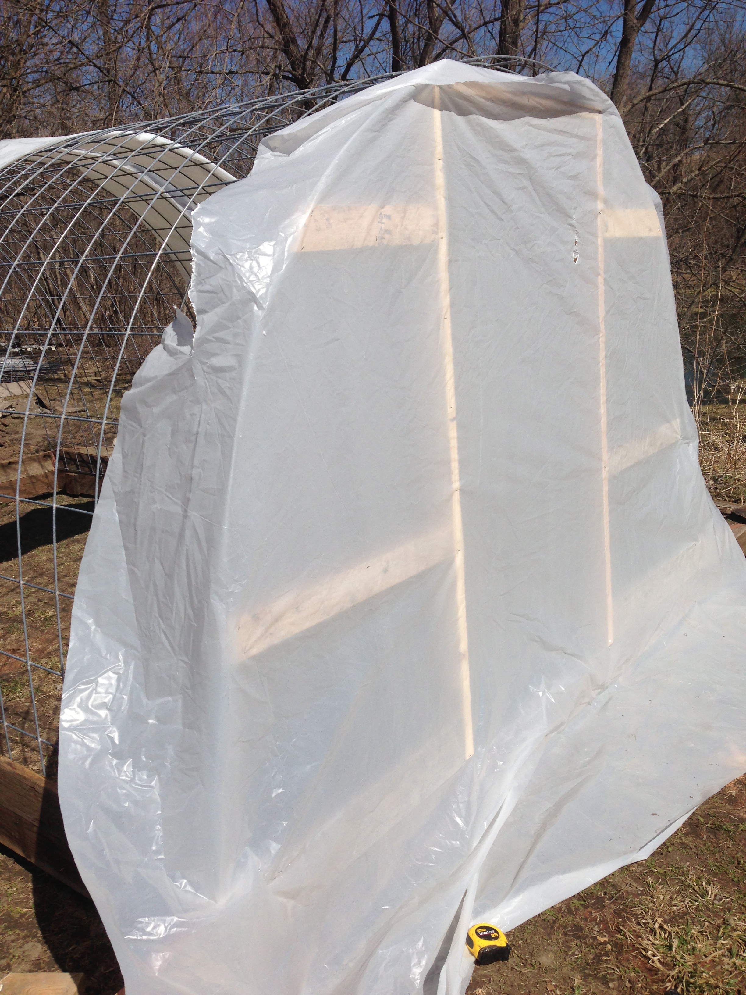 IMG_5130Next, we attached the plastic to one end by stapling it to the wood framing, then pulled the long piece of hoop-covering plastic into place and secured the two pieces together by rolling/folding the ends (much like preparing a foil packet for the grill) along the shape of the hoop. Then, we repeated with the second end.IMG_5131