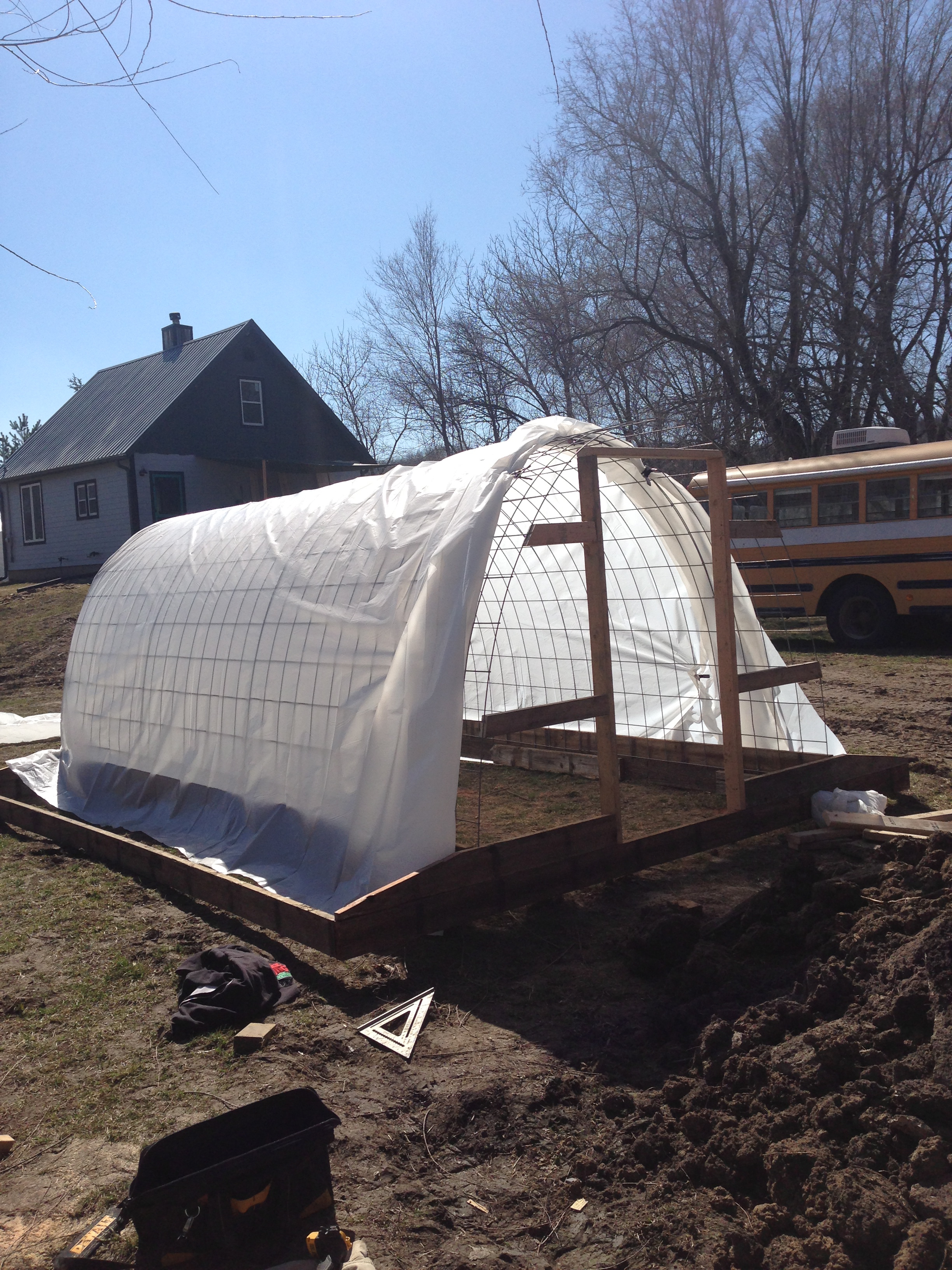 IMG_5043IMG_5044Once all the panels were in place, forming the classic “hoop house” shape, we rolled out our plastic to the length of the structure, and attached it by securing the plastic on one side, then pulling the sheet up and over the top and securing on the second side. IMG_5047