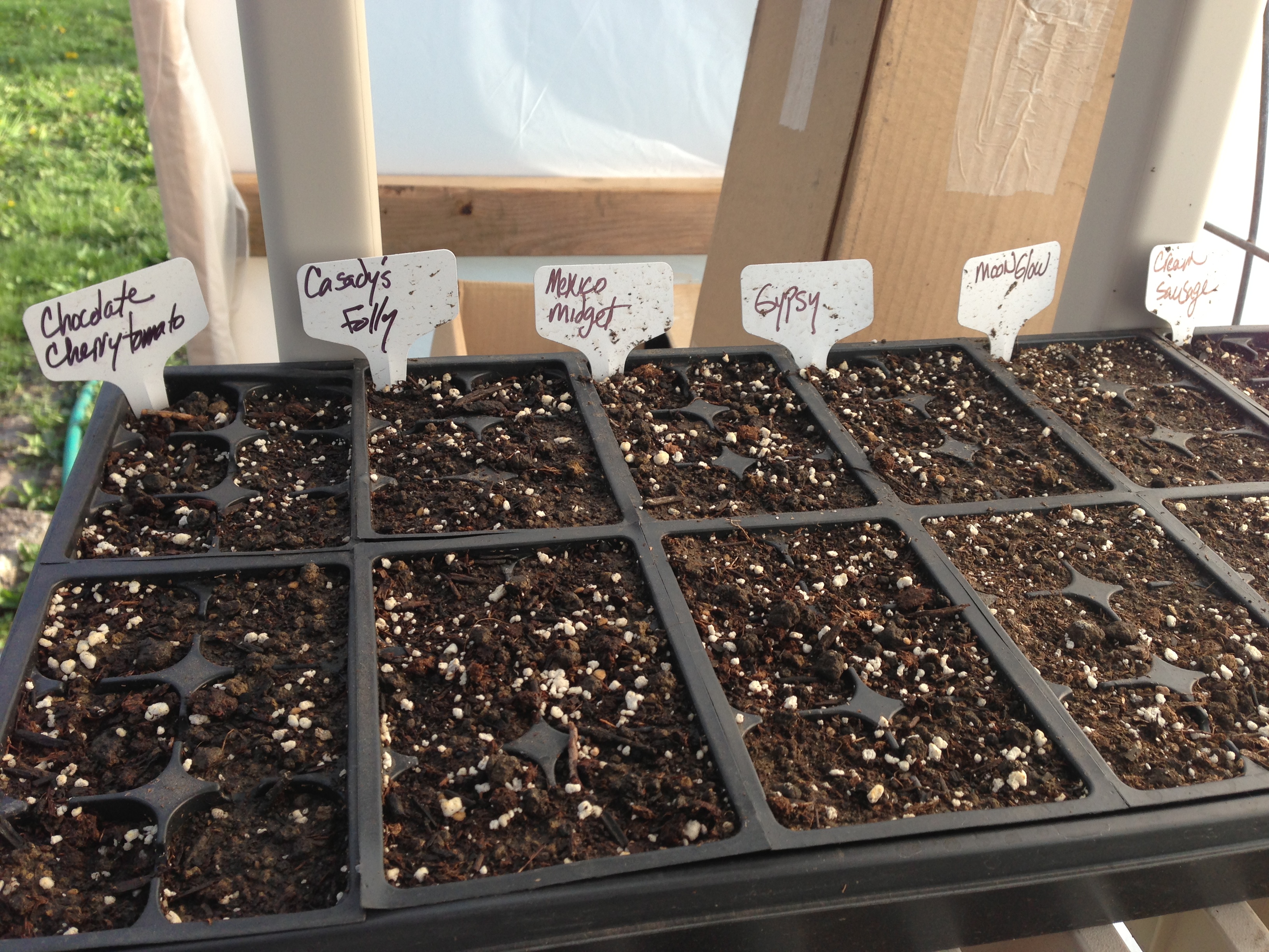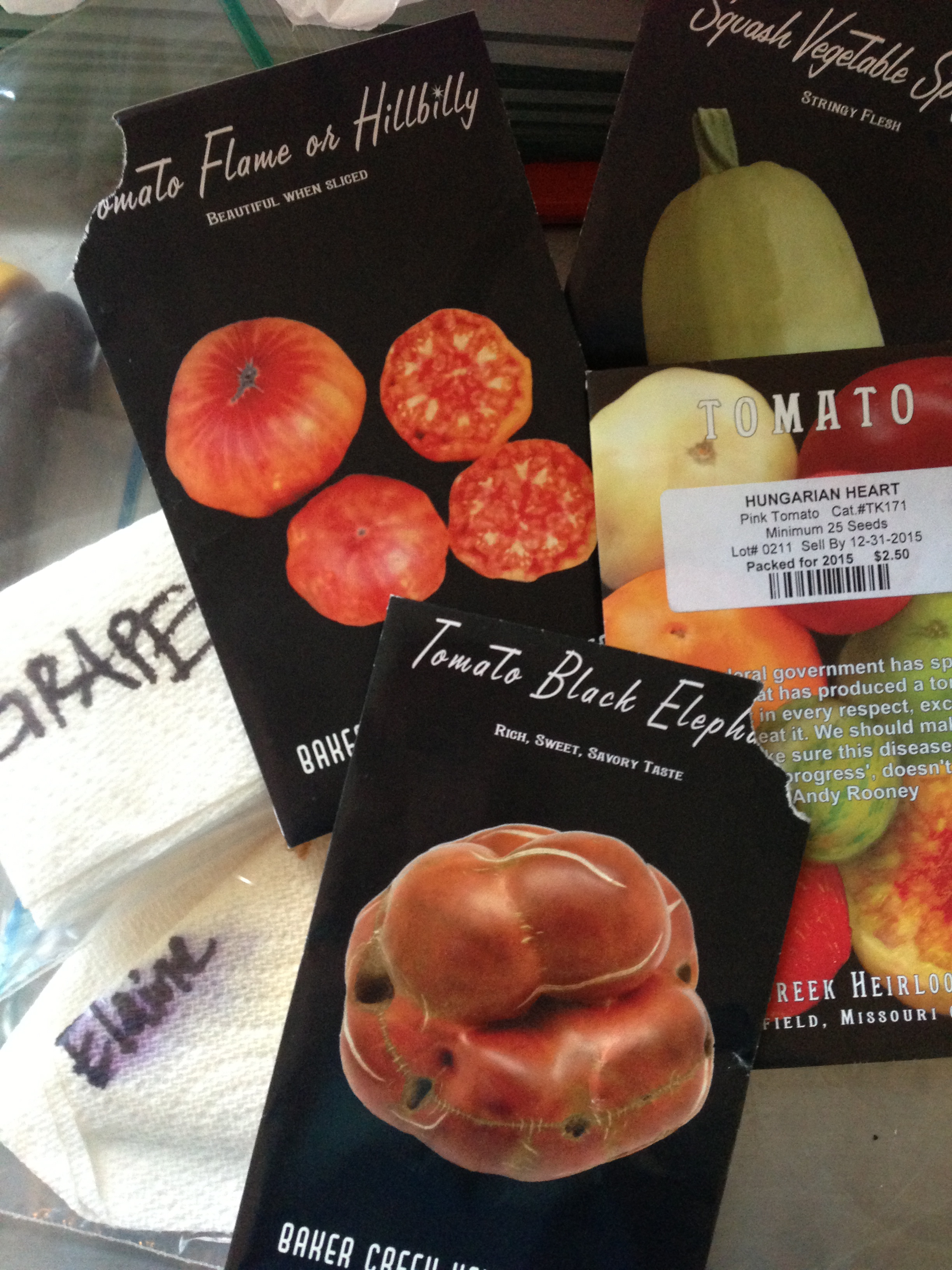 Above are just a few of the varieties we planted. The hand-written “grape” and “Elaine” are seeds saved from our 2014 garden.