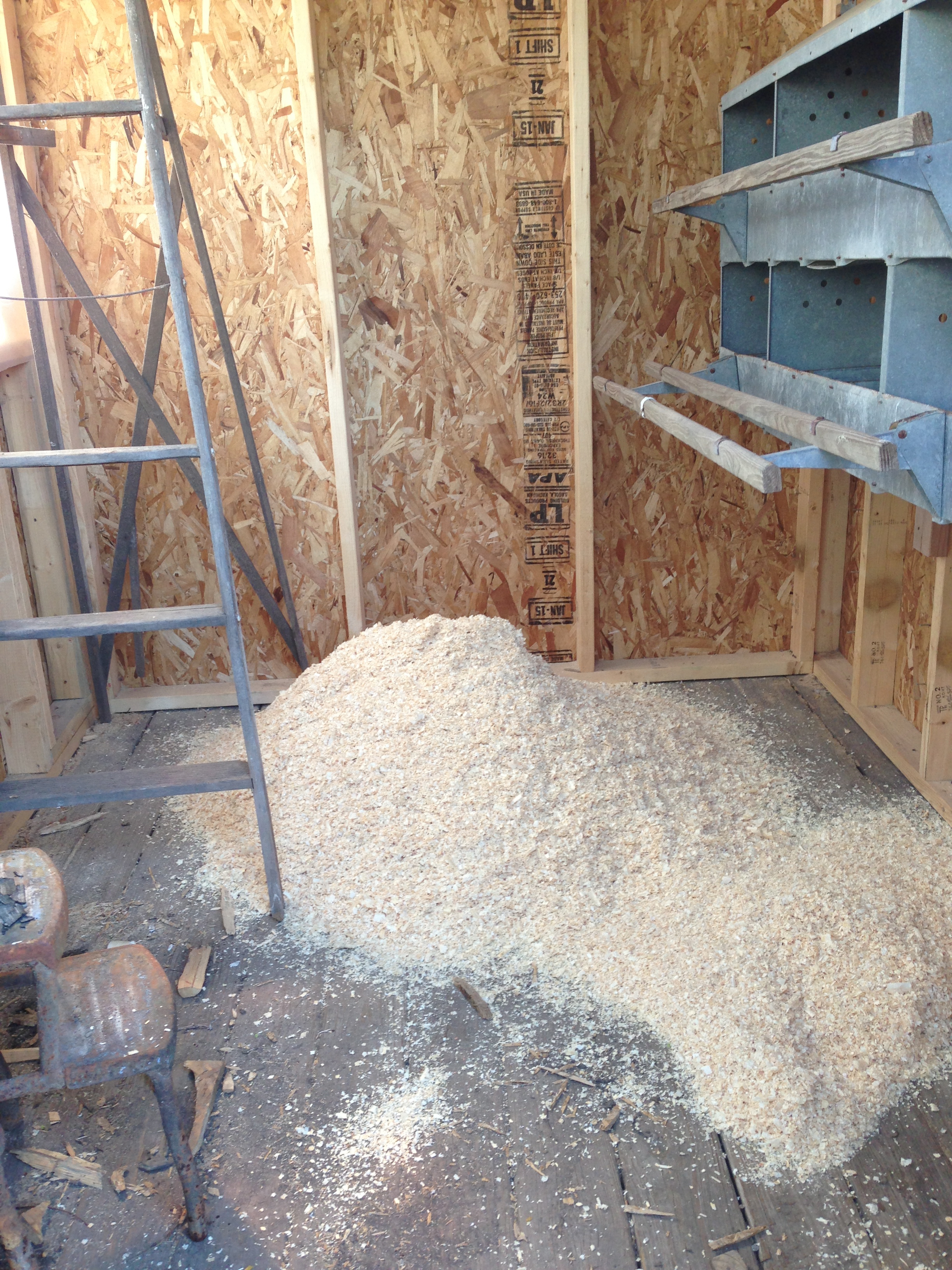 We added several inches of pine bedding to the house floor so that the chicken poop will compost. We will continue to add more bedding as needed and clean it out a couple of times a year. This is known as the “deep litter method.”