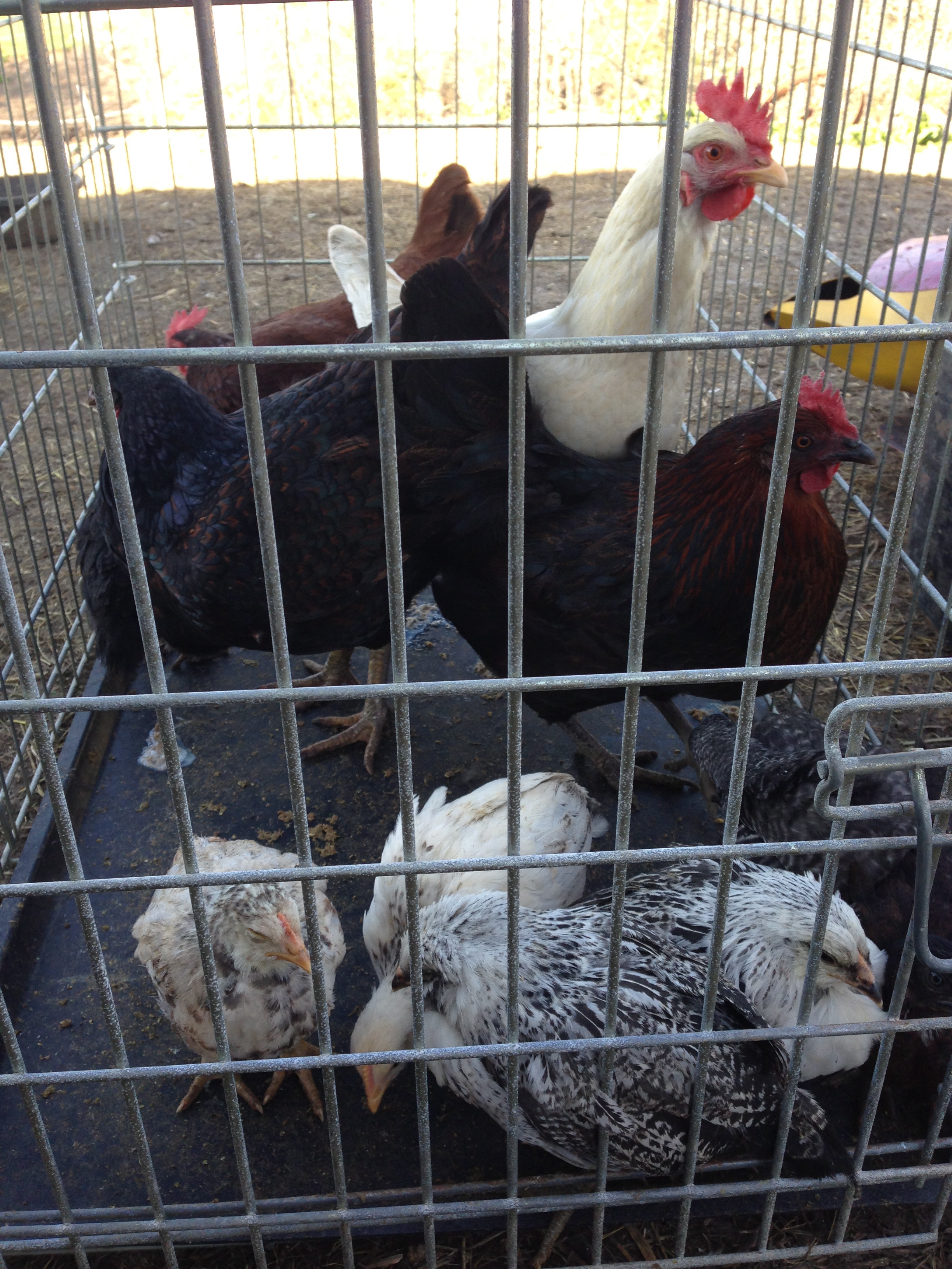 After a fun hour of trying to catch chickens mid-afternoon (not a brilliant moment…we should have come at bird bed-time) with Melissa, Kody, and Joey by throwing out corn and trying to grab the birds by the legs, we brought home our new flock in our wire dog crate.