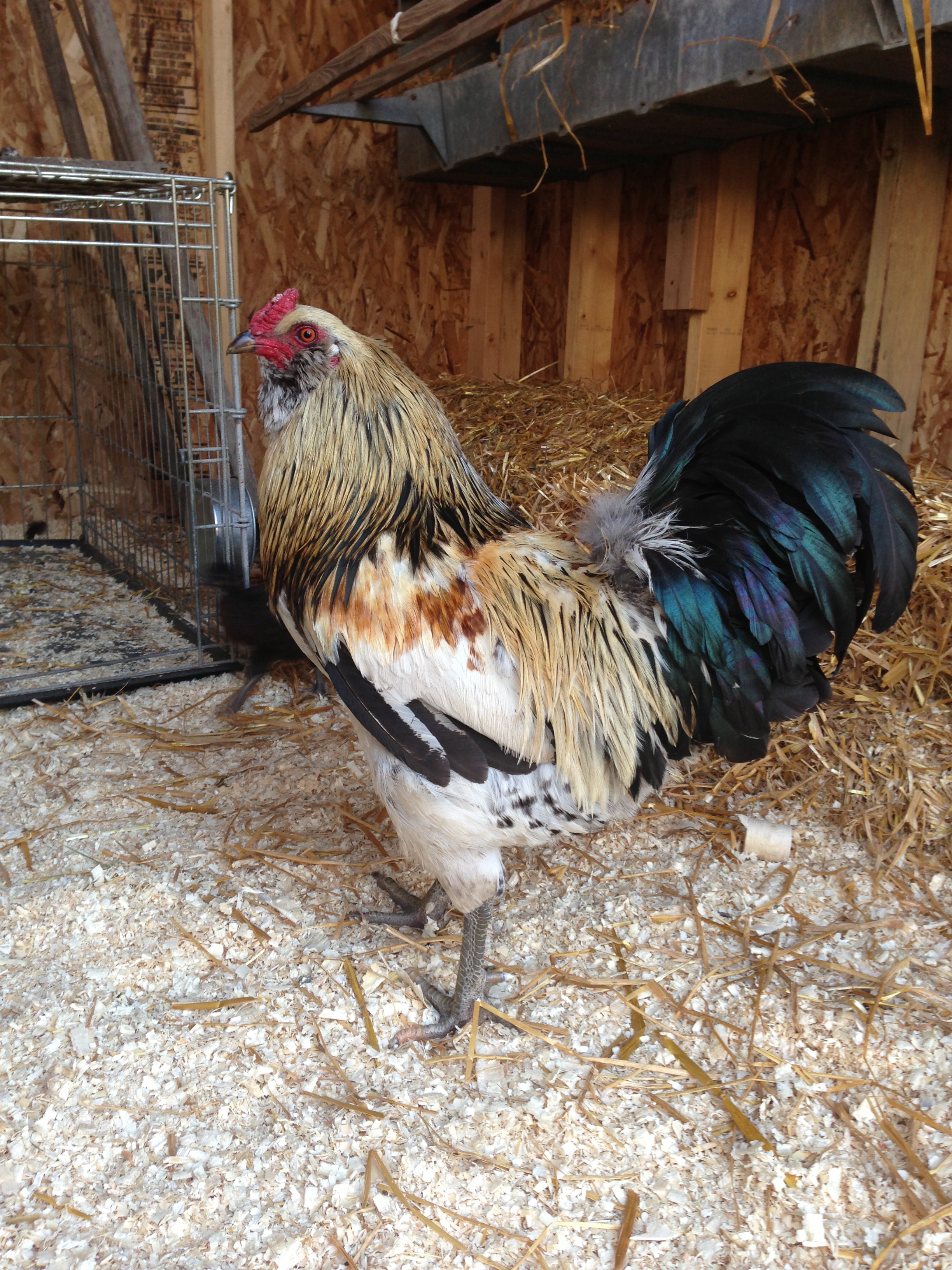 Meanwhile, outside the house, Kung Pao was a little impatient to meet the “truck-load of ladies” we’d promised him earlier in the day. We had to keep the new birds shut inside the house for 12+ hours so they’d know that was their new home.
