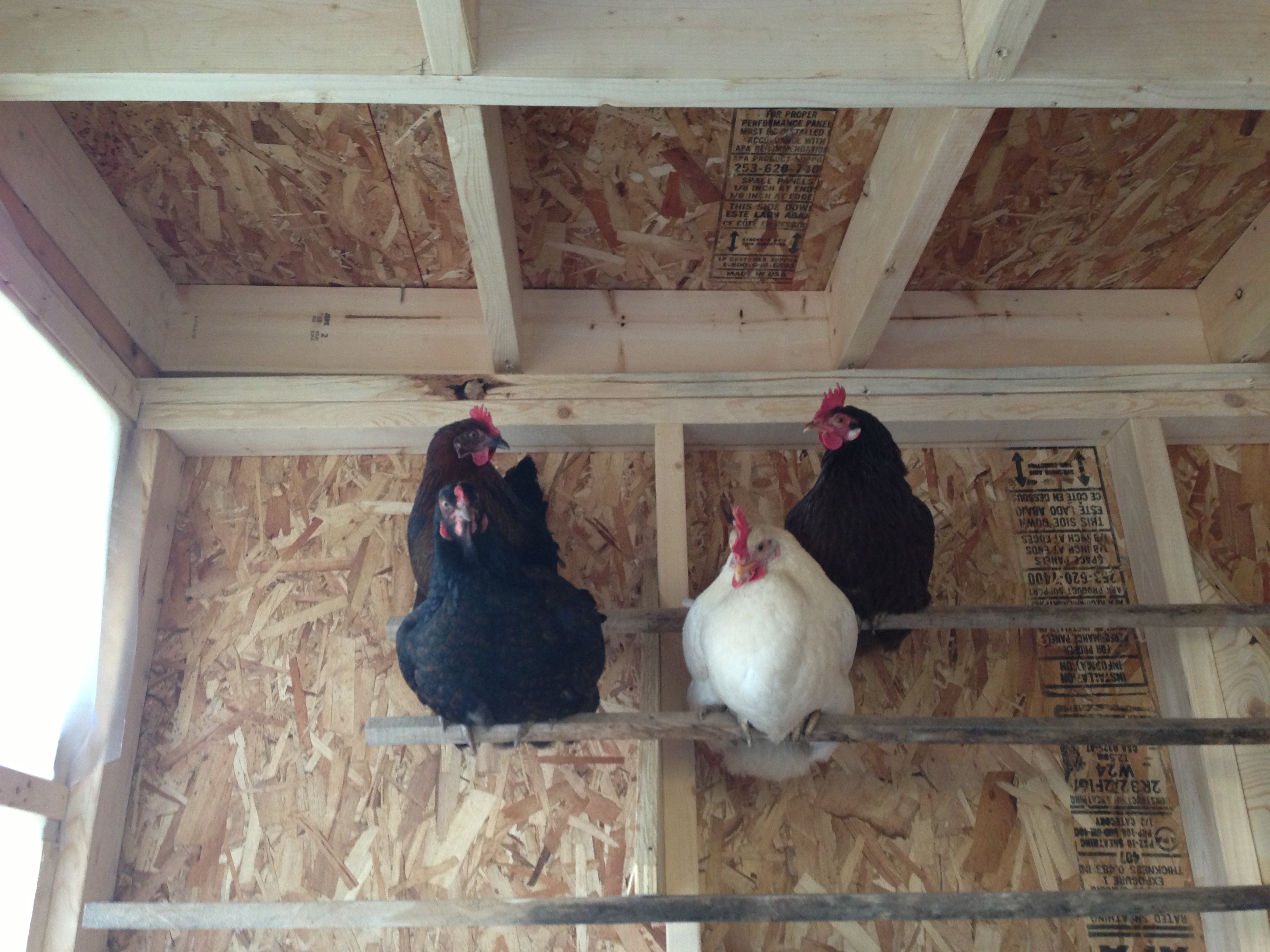Ben secured triangle shapes to the wall studs and added these square wooden scrap pieces to give the older birds a place to  roost at night.