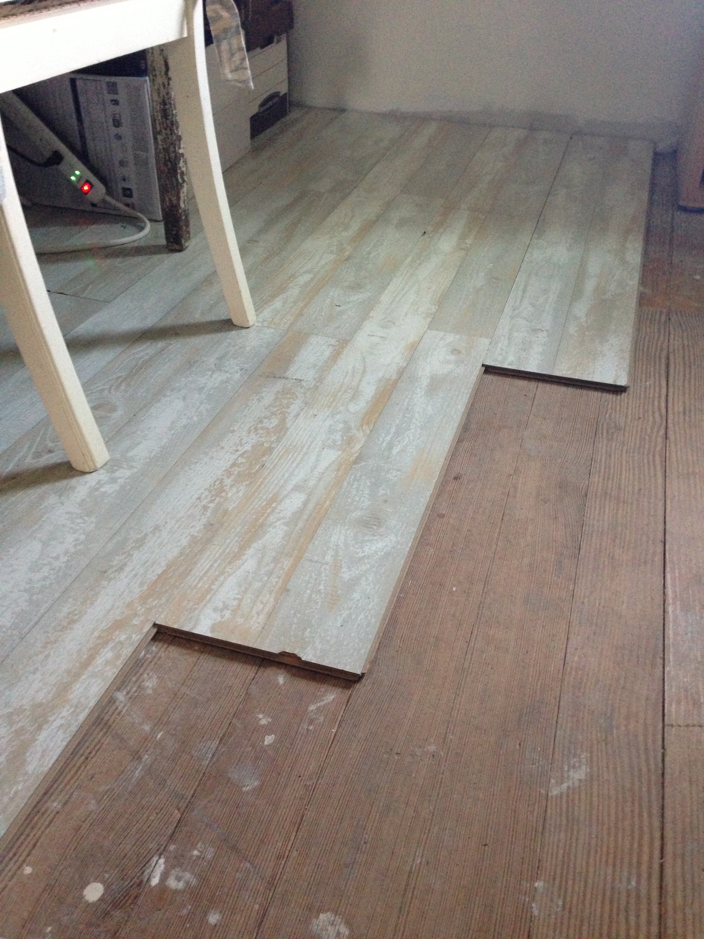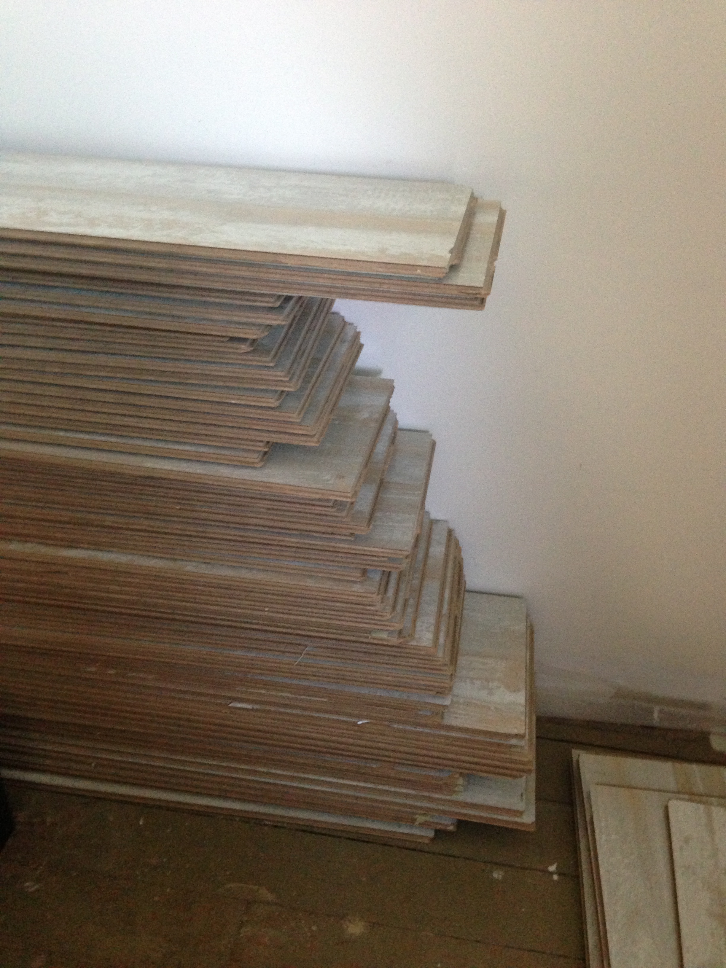 Our friend Holly alerted me to a giveaway of laminate flooring that had been used for a few years in a variety of photo studio sets. I’m not afraid of a little wear-and-tear on flooring that was made to look distressed! So we adopted a palette of this barnwood-look click-to-connect laminate flooring planks. We knew that they would work beautifully in our second floor. They won’t be forever, but they give us some real flooring up there until we are ready to install the cottonwood planks (currently in progress downstairs).