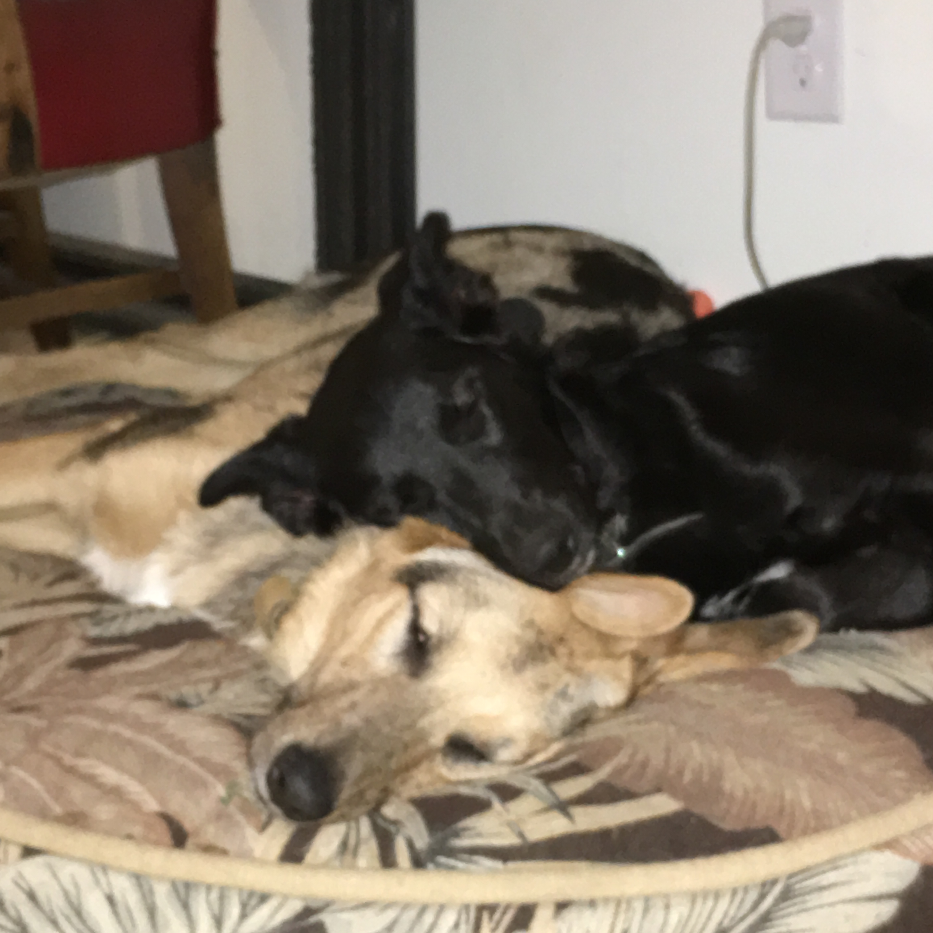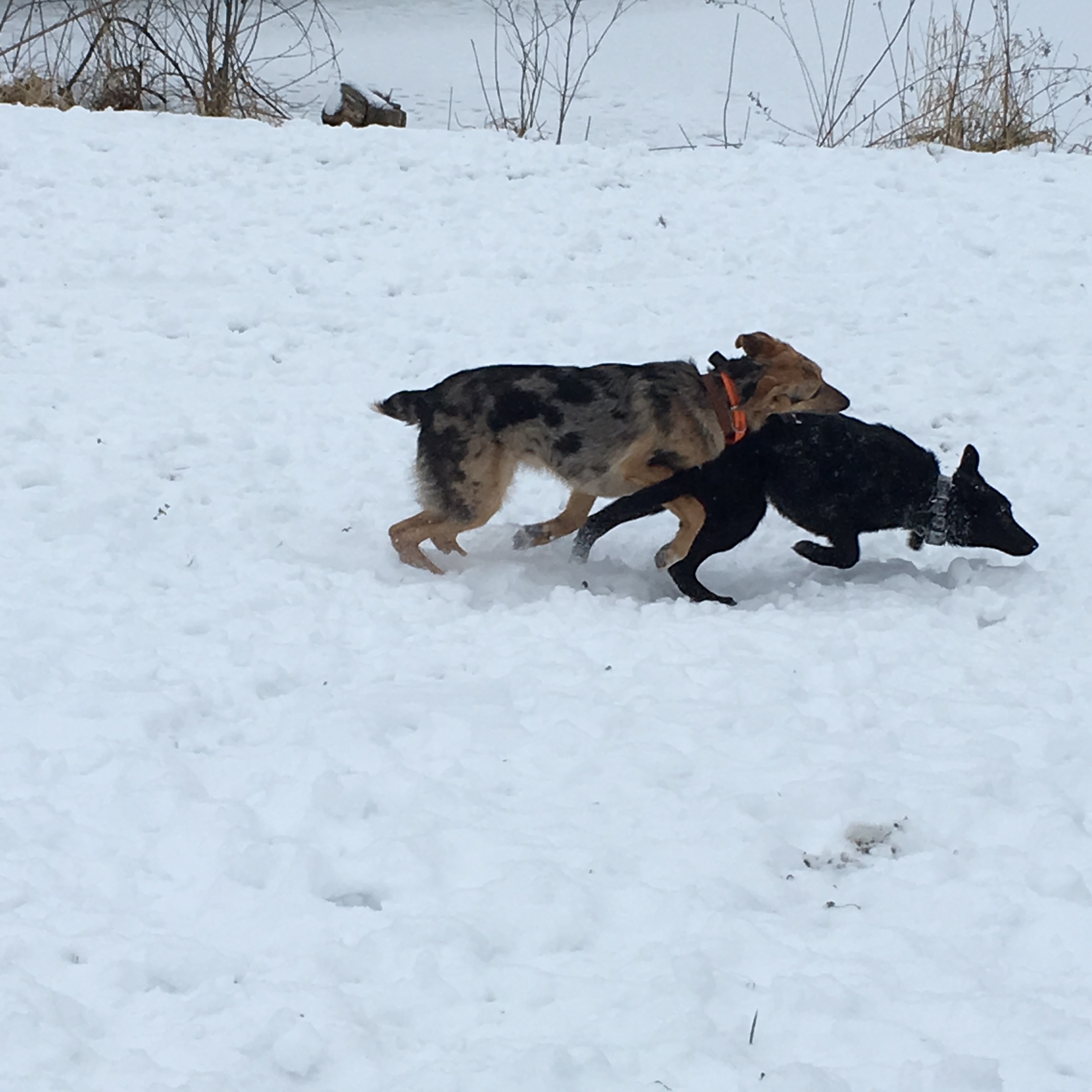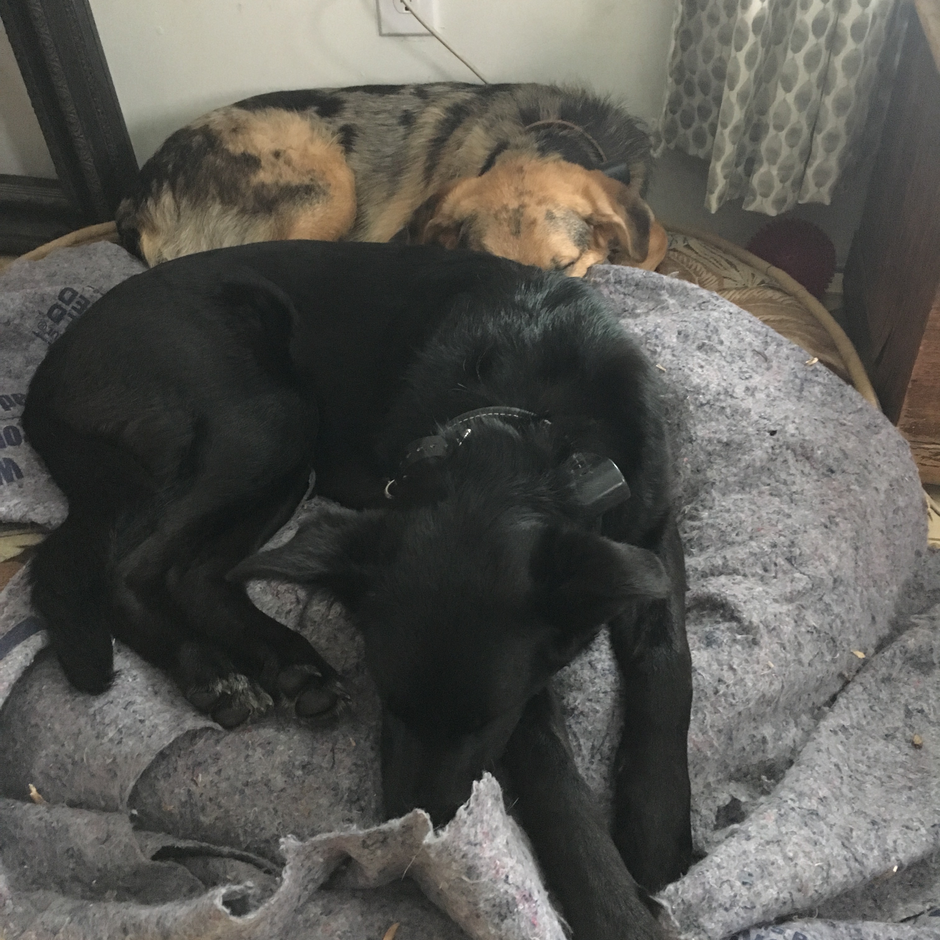 Fletcher and Okra, at 9 months old, continue to grow like weeds and play chase like they are training as elite athletes. They are sweet and loving and although they now are big enough (and hairy enough) that they most of the time each take their own dog bed, they do sometimes still snuggle up together.