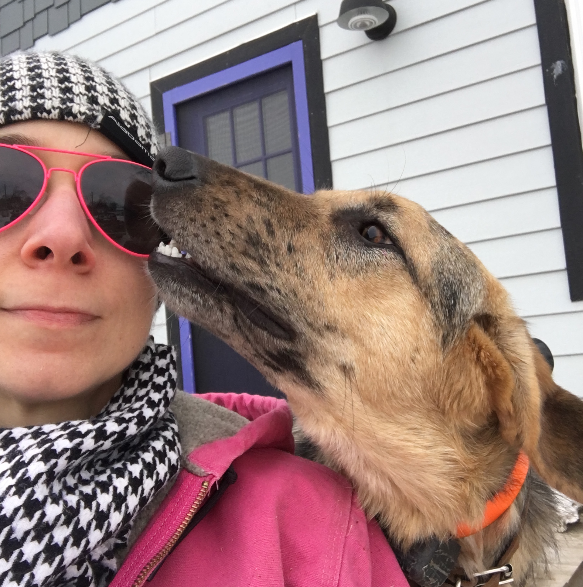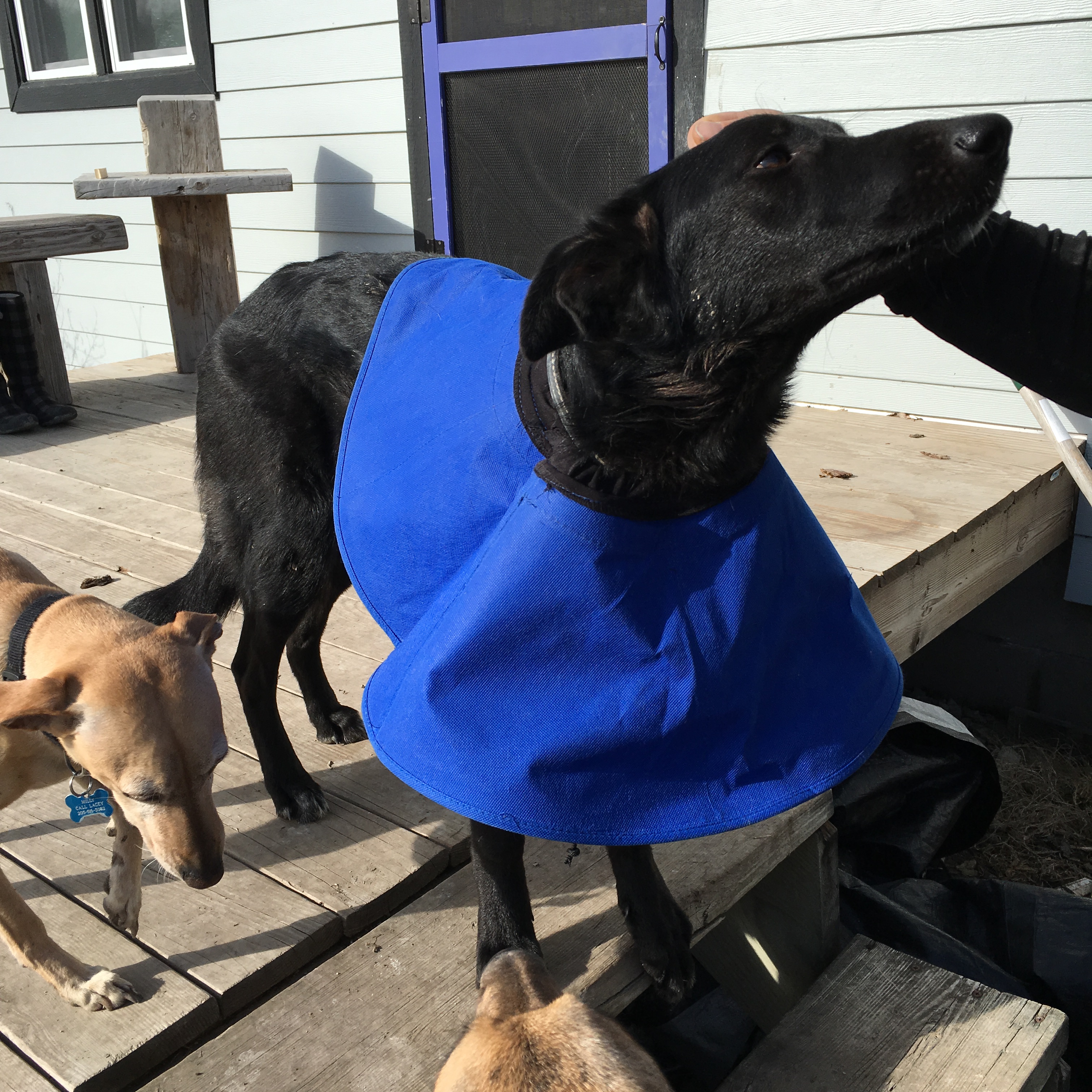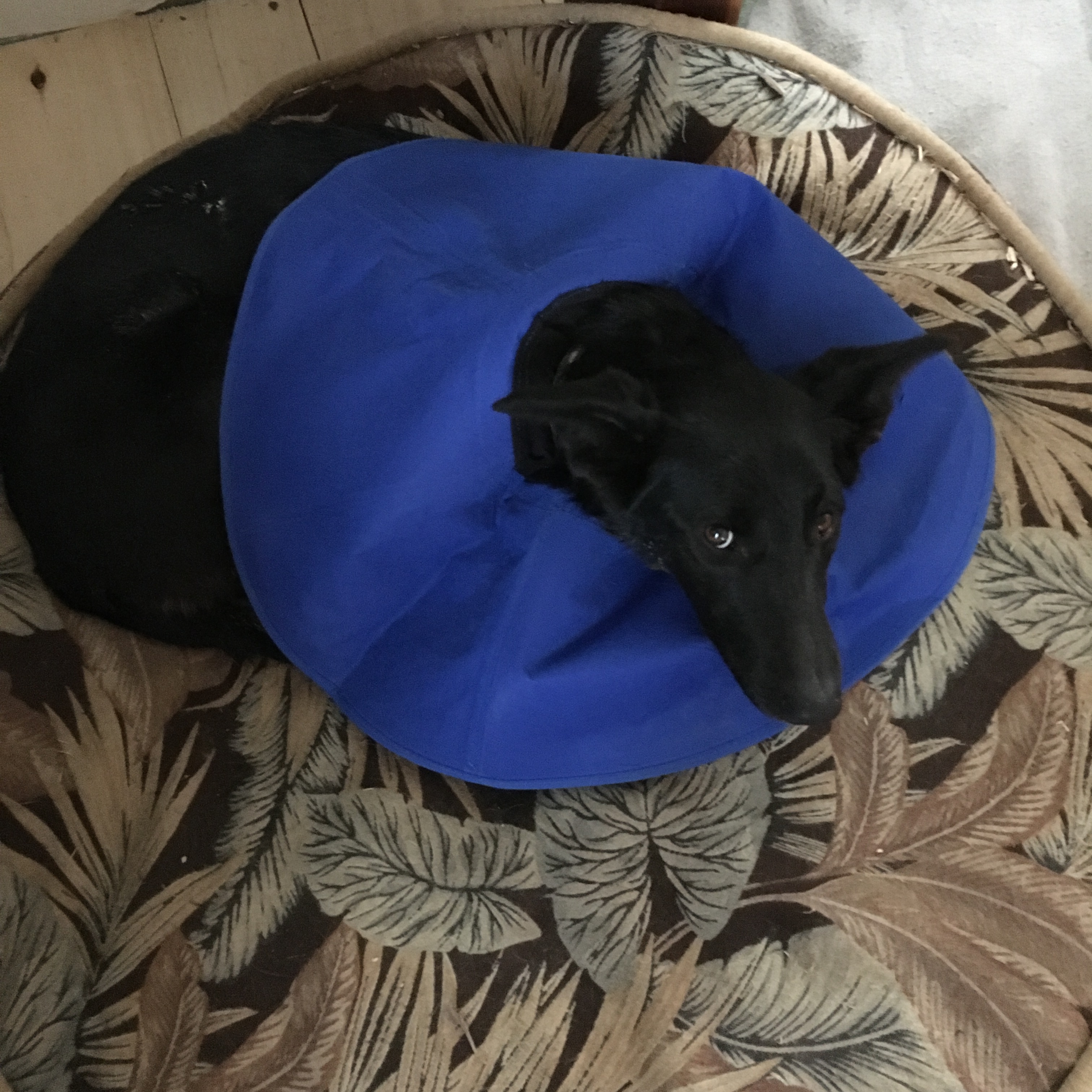 Fletcher barked like a fool! I couldn’t decide if he was scared of Okra’s fashionable/protective collar (like the old lamp shade ones but it’s flexible so she doesn’t knock stuff over) that keeps her from chewing/licking her wounds or if he was just so excited to see that she was OK he couldn’t help but yell at her!