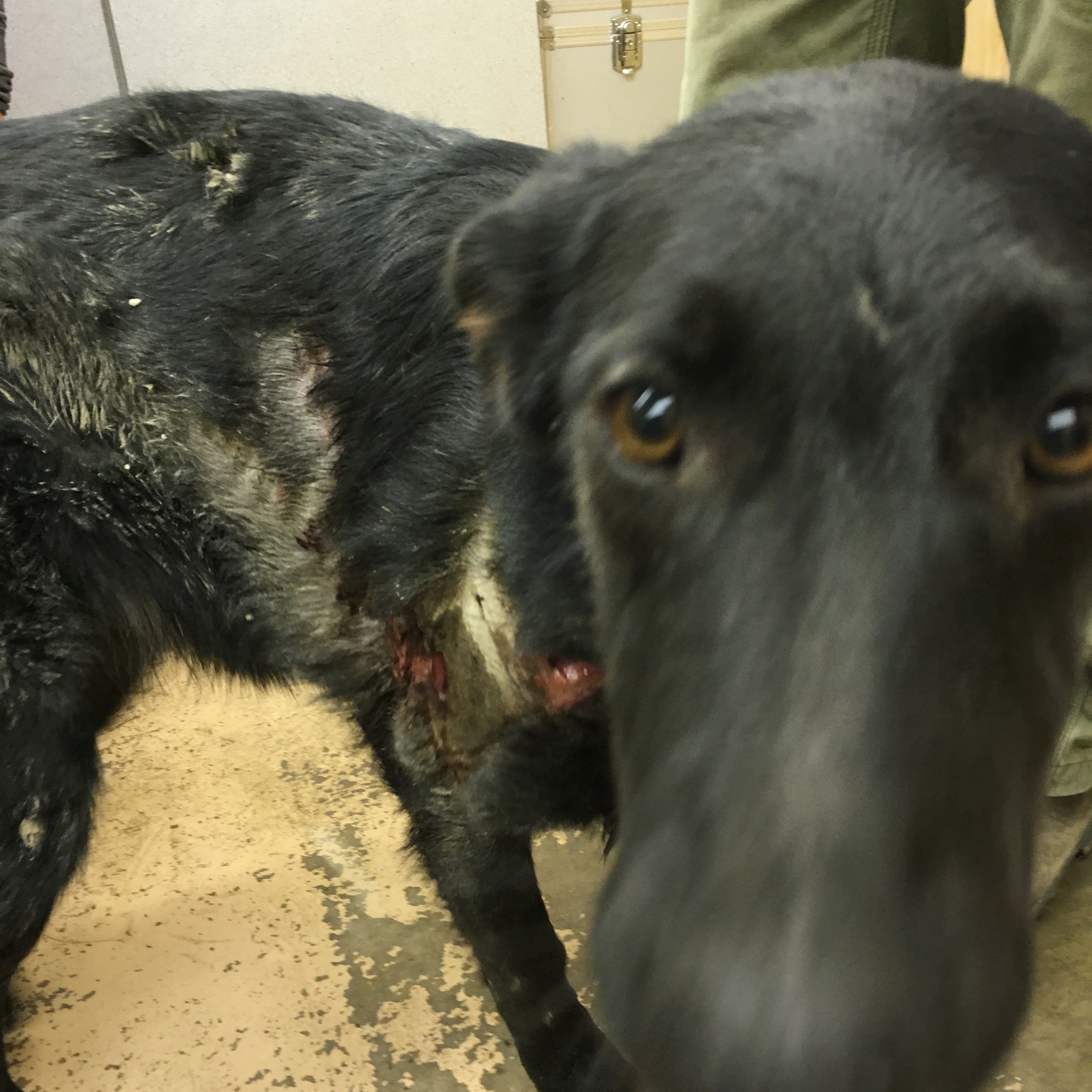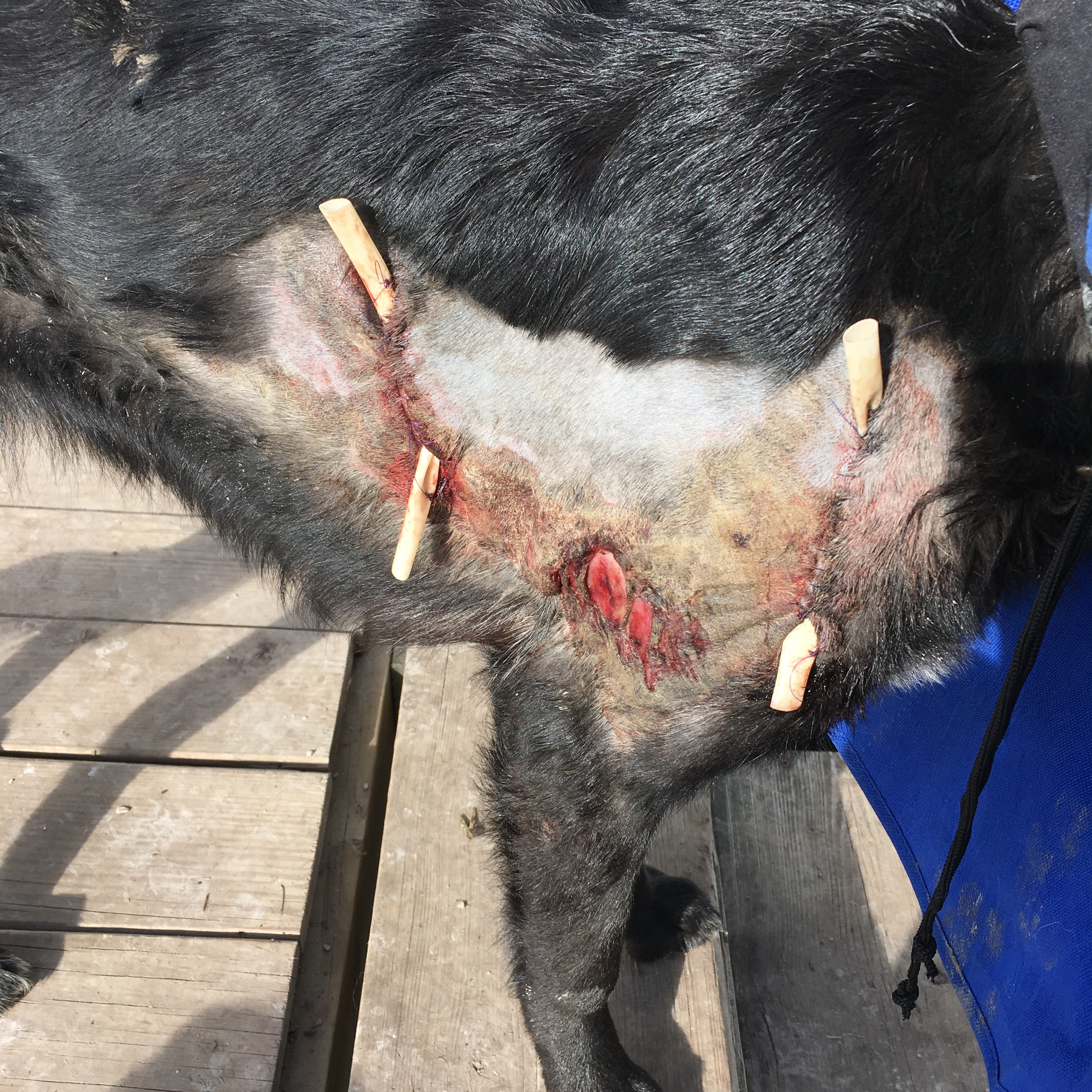 Her wounds (gross photo below) include two big sutured places with drains so she doesn’t end up with pockets of infection at her shoulder and mid rib cage. The raw place in between is road rash. The skin is too chewed up there to be sutured. So it will just have to heal on its own. We are irrigating the wounds and applying antibiotic cream, as well as giving oral antibiotics and pain meds.