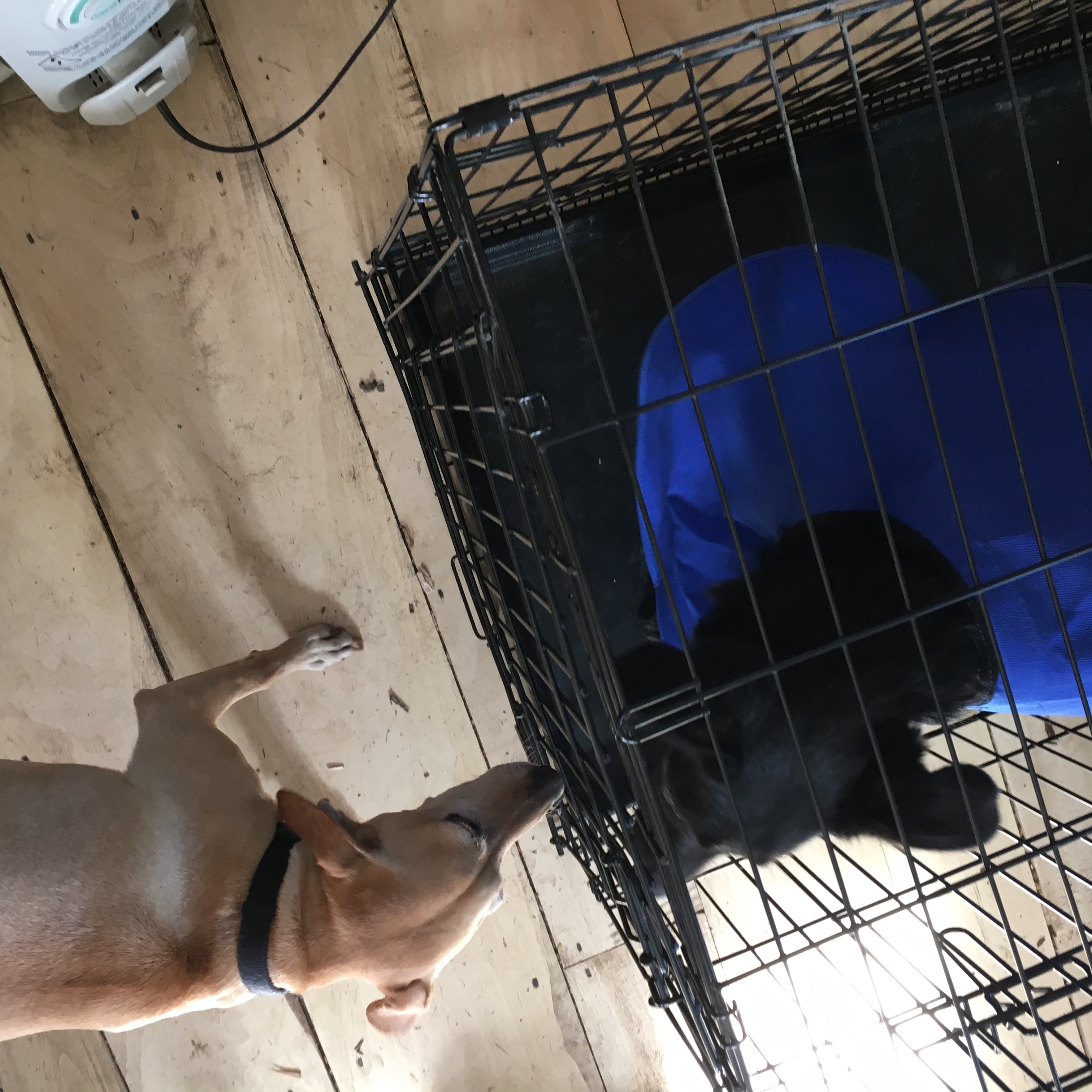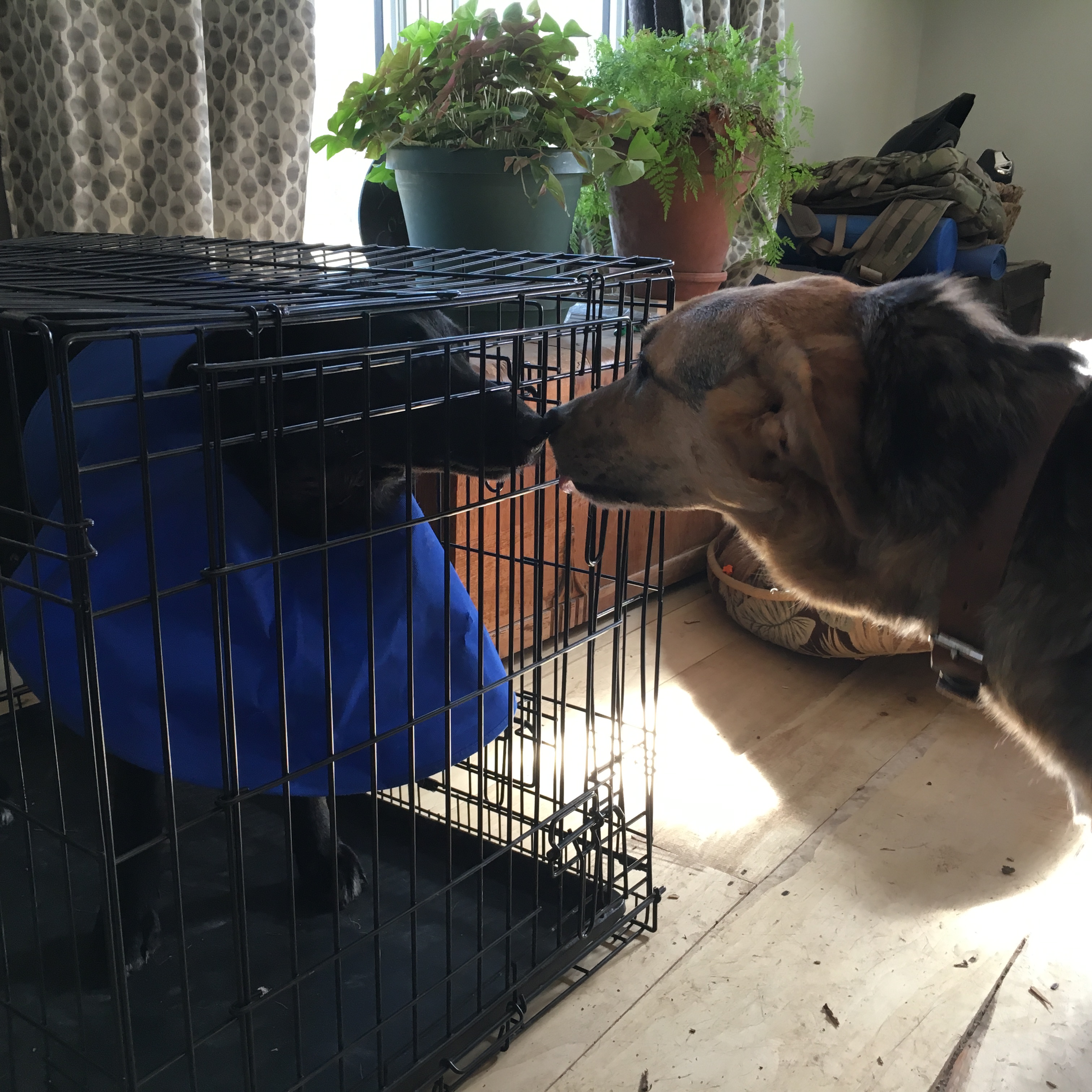 Okra definitely isn’t her puppy self. She is moving slowly and sleeping a lot. She isn’t playing, and Fletcher is being very gentle and sweet with her. She retreats into her crate often.