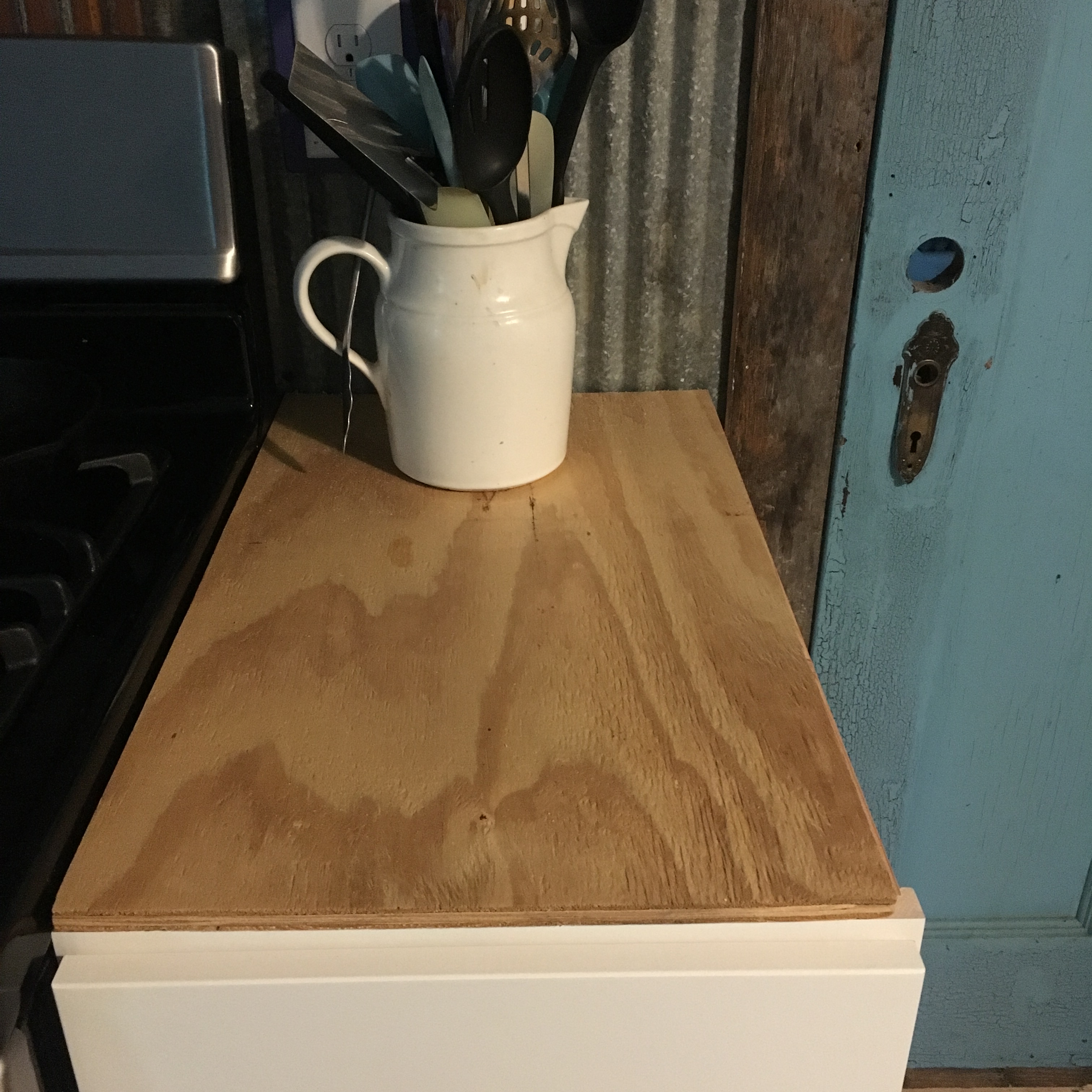 After the cabinets were all level and screwed to the walls, etc, etc, the countertop guys came out and measured for our solid-surface countertops. But it would be several weeks before those were fabricated and installed. So in the meantime, Ben made me some plywood counters.