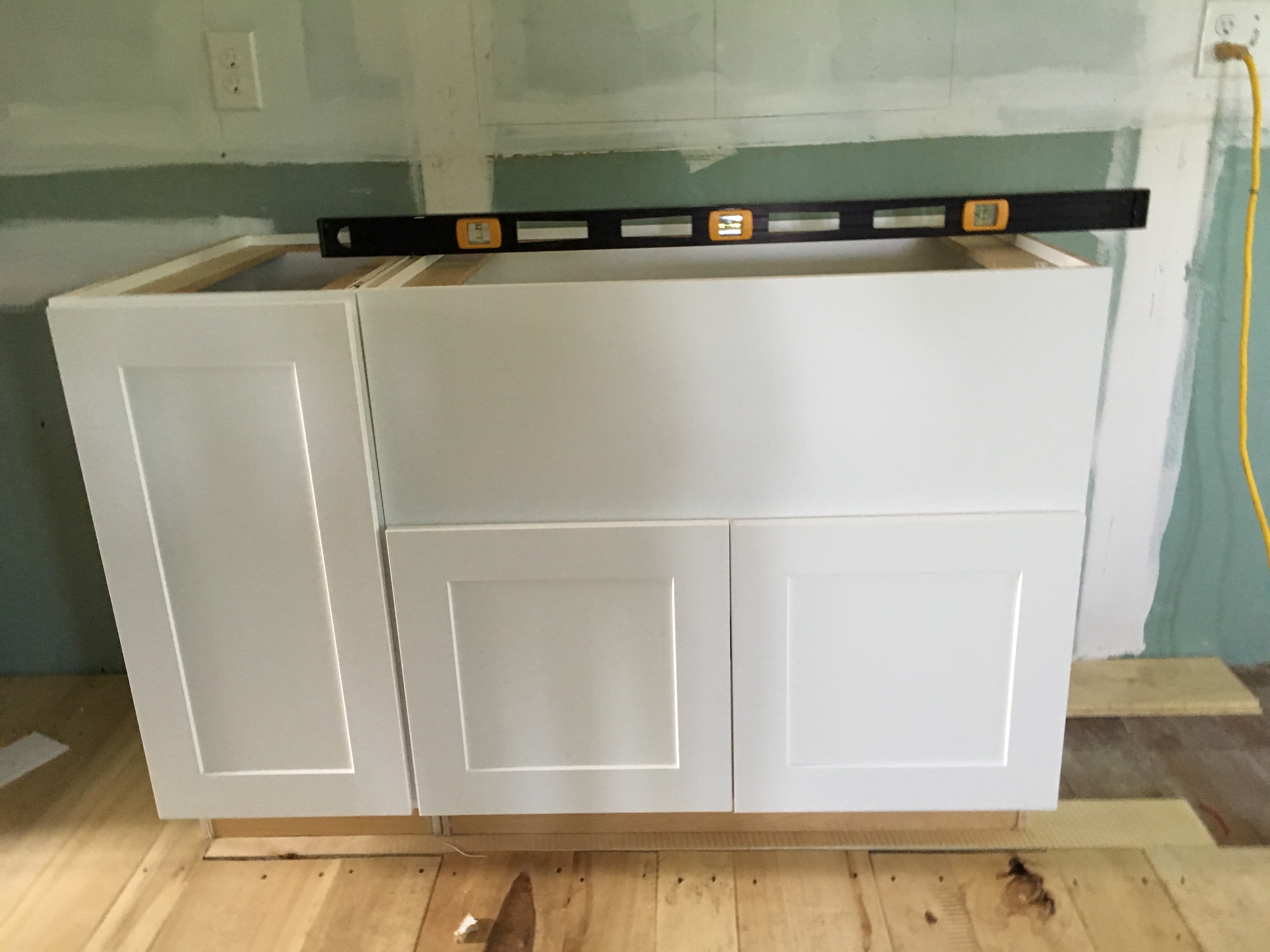 Who could have guessed that there was so much leveling and shimming involved in installing cabinets? Turns out, our 100 year-old abode itself wasn’t level. So our DIY cabinet installation also involved some floor jacks in the basement. We won’t go into that.